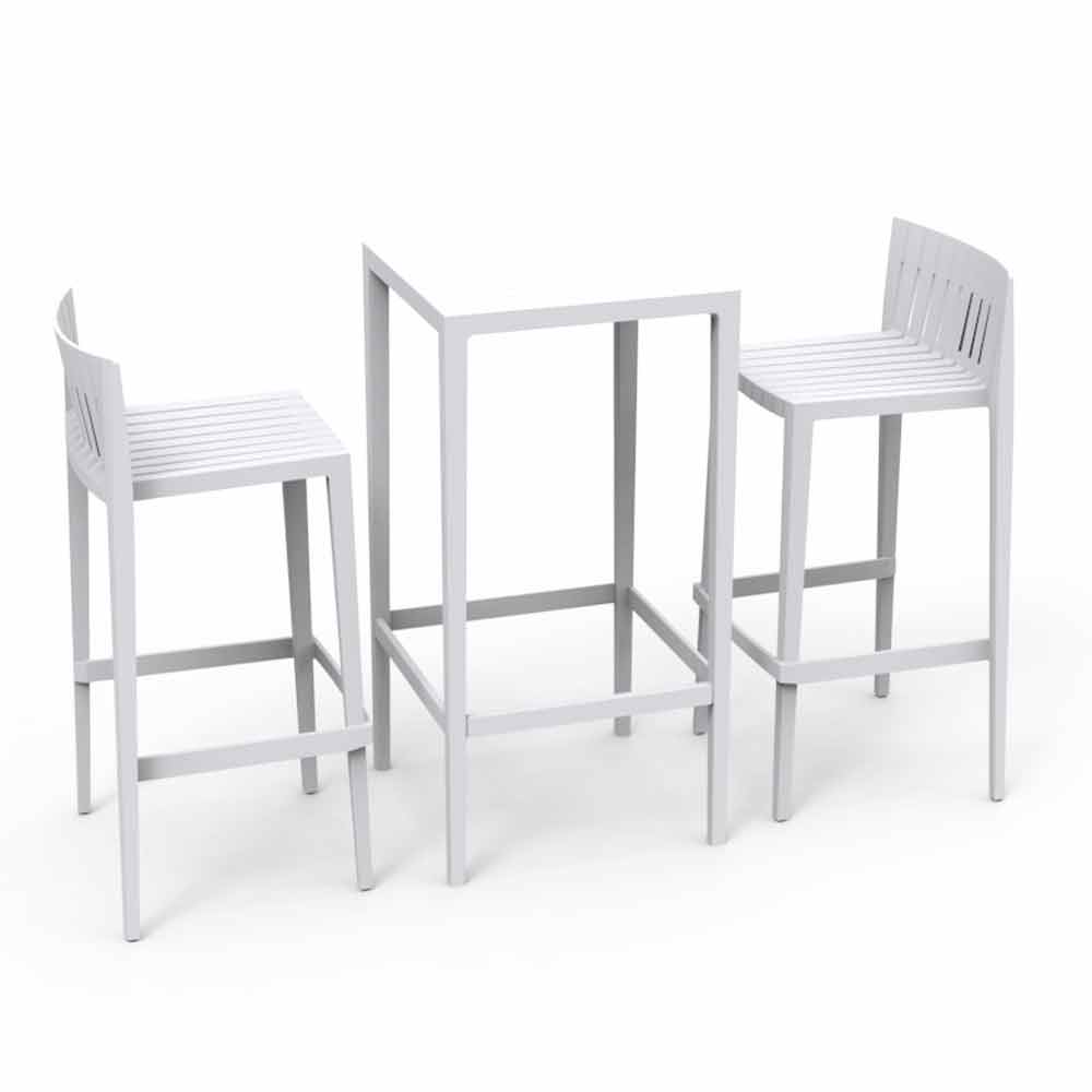 Vondom Spritz Set i tavolinës së kopshtit dhe dy froneve të bardha Seti ikopshtit Spritz nga Vondom i bërë nga polipropileni me injeksion gazi të formuar në ajër dhe të përforcuar me fibra qelqi. Të grumbullueshme. E përbërë nga: - 1 tryezë e lartë L21 x P50 x H100; - 2 jashtëqitje me L21 x P45 x H87 dhe Hs 66 cm secila.