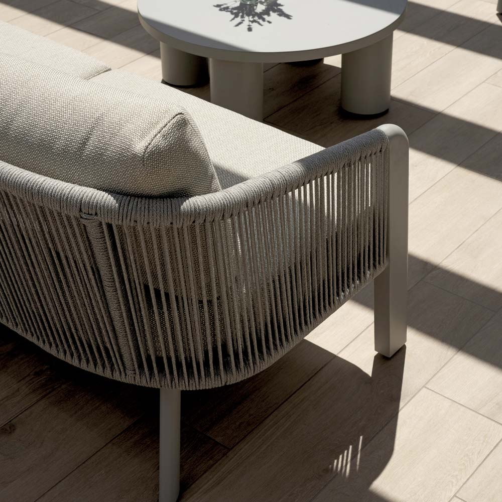 Korniza e aluminit siguron lehtësi, soliditet dhe qëndrueshmëri, ndërsa litari i endur mbështjell me elegancë ndenjëset dhe mbështetëset e shpinës, duke krijuar një efekt vizual modern, por natyral. Mbulesat e lëvizshme të jastëkëve sigurojnë rehati maksimale dhe mirëmbajtje të lehtë, duke ruajtur pamjen e pastër dhe të rafinuar të dhomës së ndenjes me kalimin e kohës.