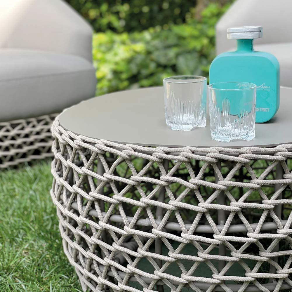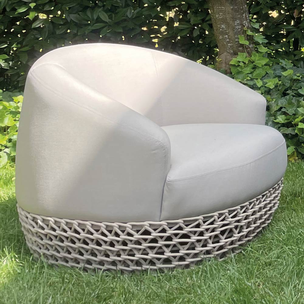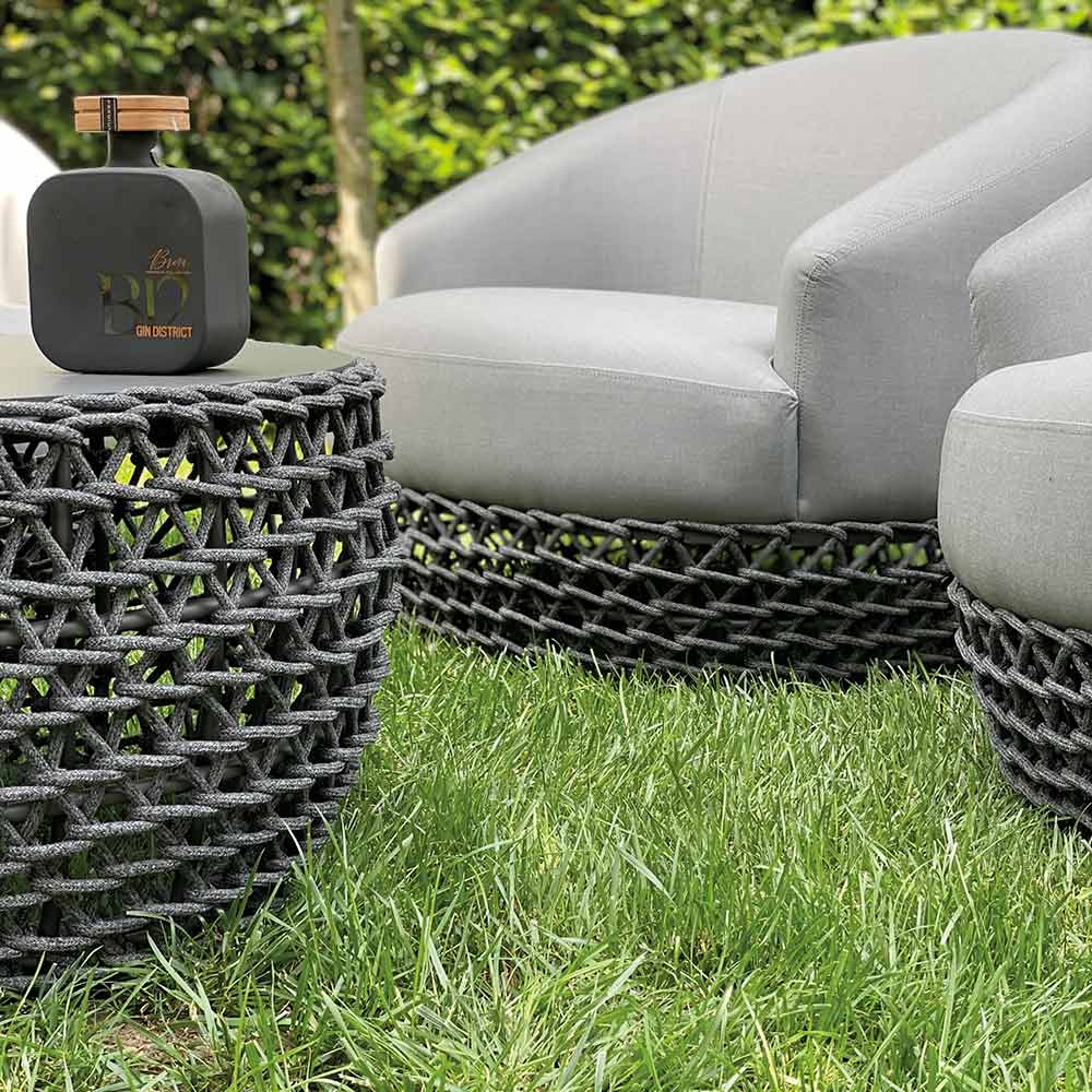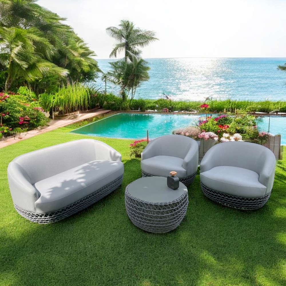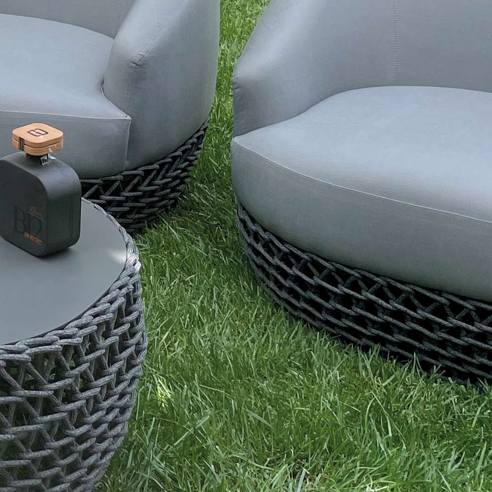 Ky sallon kopshti është një shembull i përsosur i dizajnit të butë dhe mbështjellës , ku çdo detaj është projektuar për të ofruar rehati , elegancë dhe rezistencë ndaj ambienteve të jashtme. Vendet, të përbëra nga një divan dhe kolltukë , janë të mbuluara me pëlhurë të jashtme në një nuancë neutrale dhe të rafinuar që përputhet natyrshëm me çdo kontekst të gjelbër.