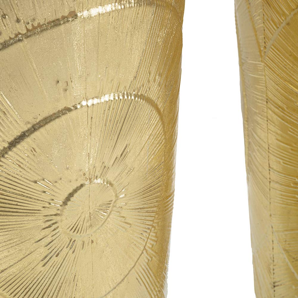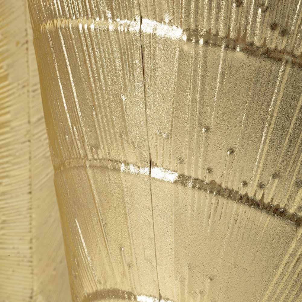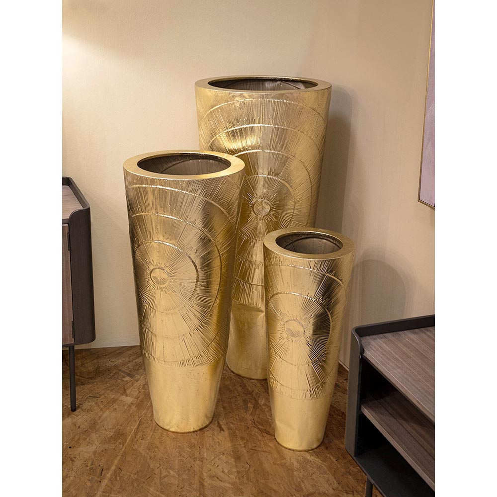 Këto vazo dekorative janë skulptura të vërteta, vepra arti që tërheqin syrin dhe pasurojnë me elegancë çdo ambient. Toni i tyre i artë krijon një efekt vizual të ngrohtë dhe mikpritës, ndërsa linjat e gdhendura në hekur krijojnë një efekt rrezatues , i cili i jep lëvizje dhe jetë sipërfaqes së lëmuar të vazove.