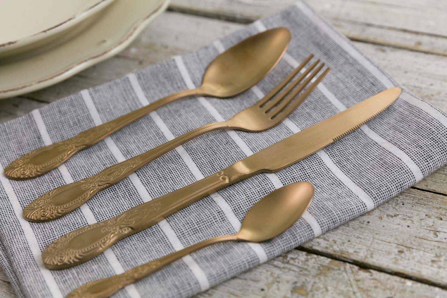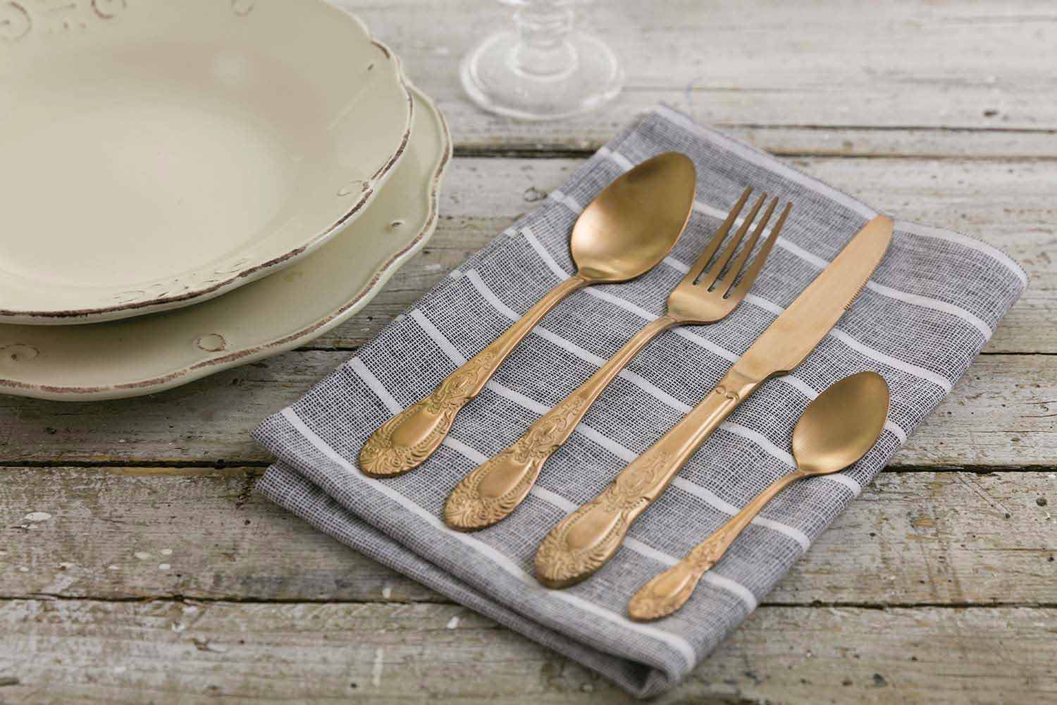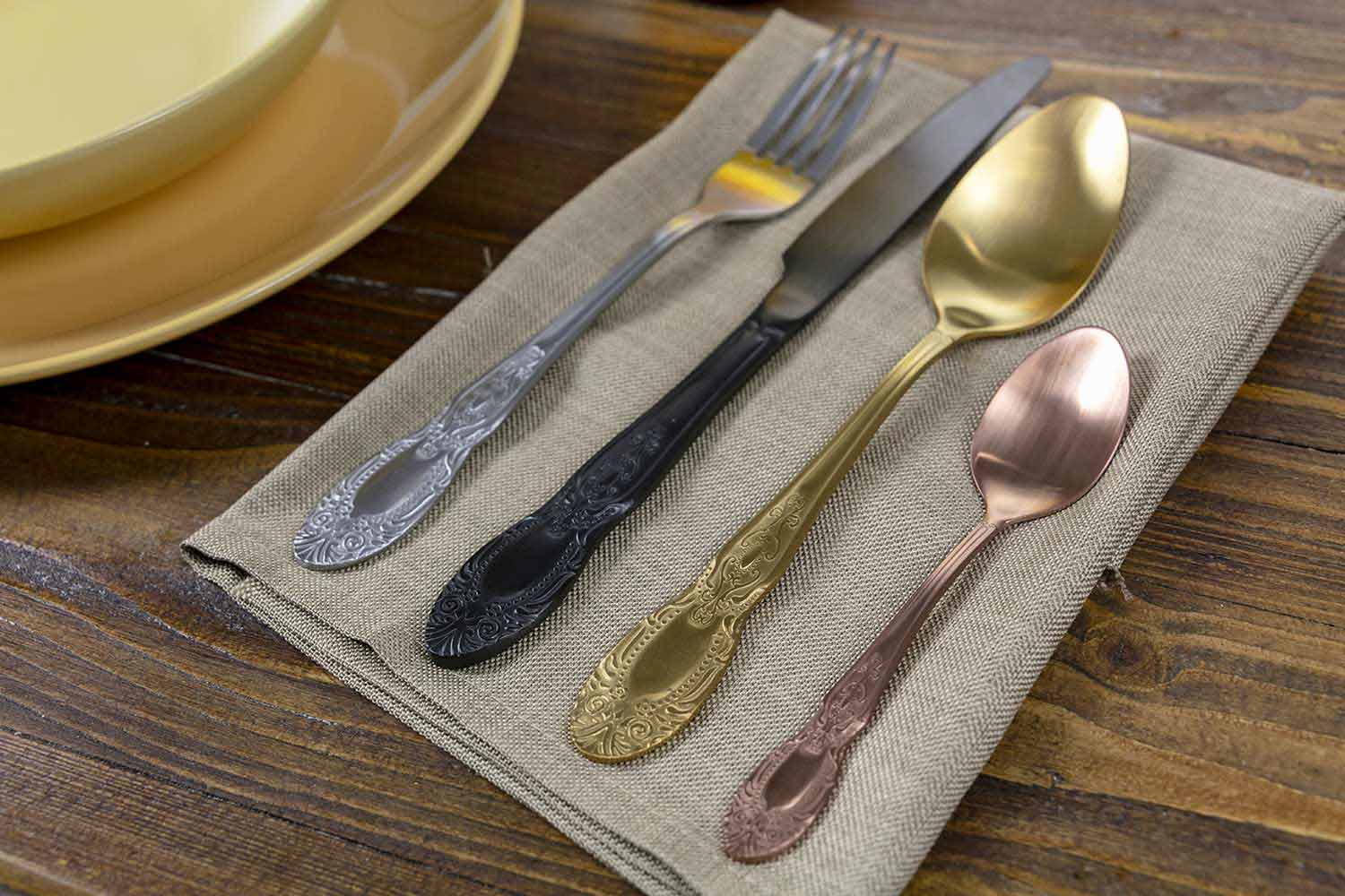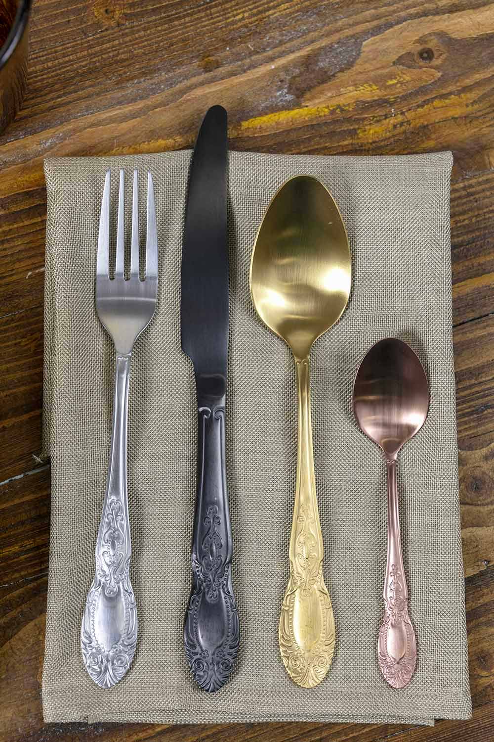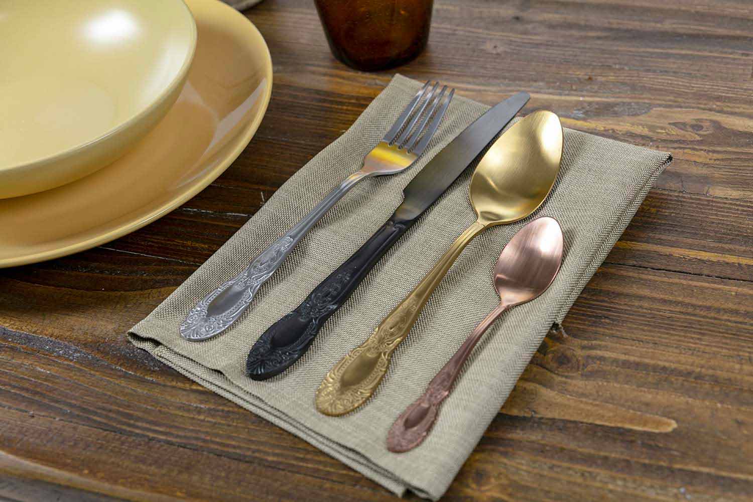 Takëmet prej 24 copash të vendosura në çelik saten me ngjyrë të kompletuar me dizajn.