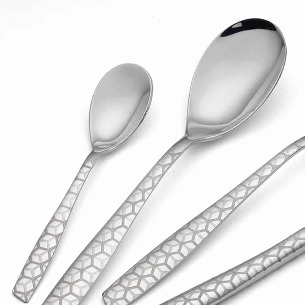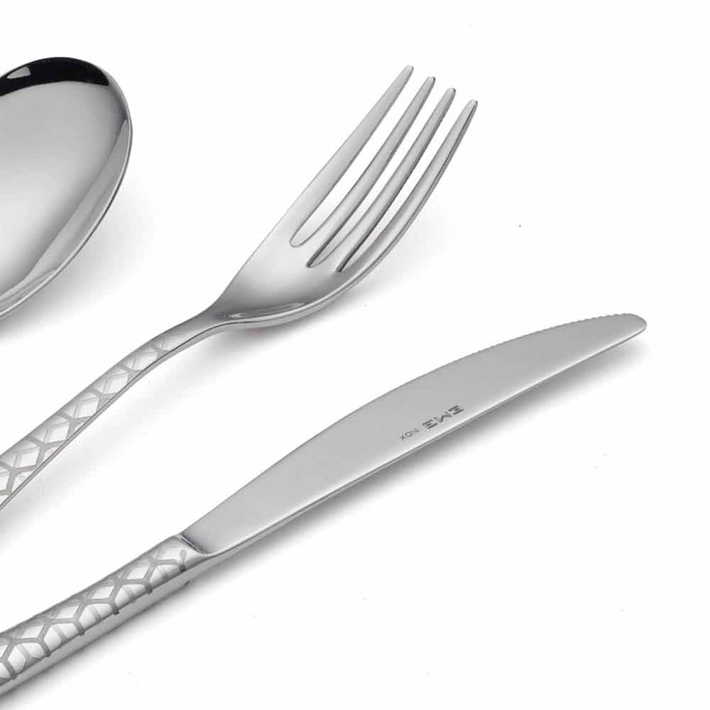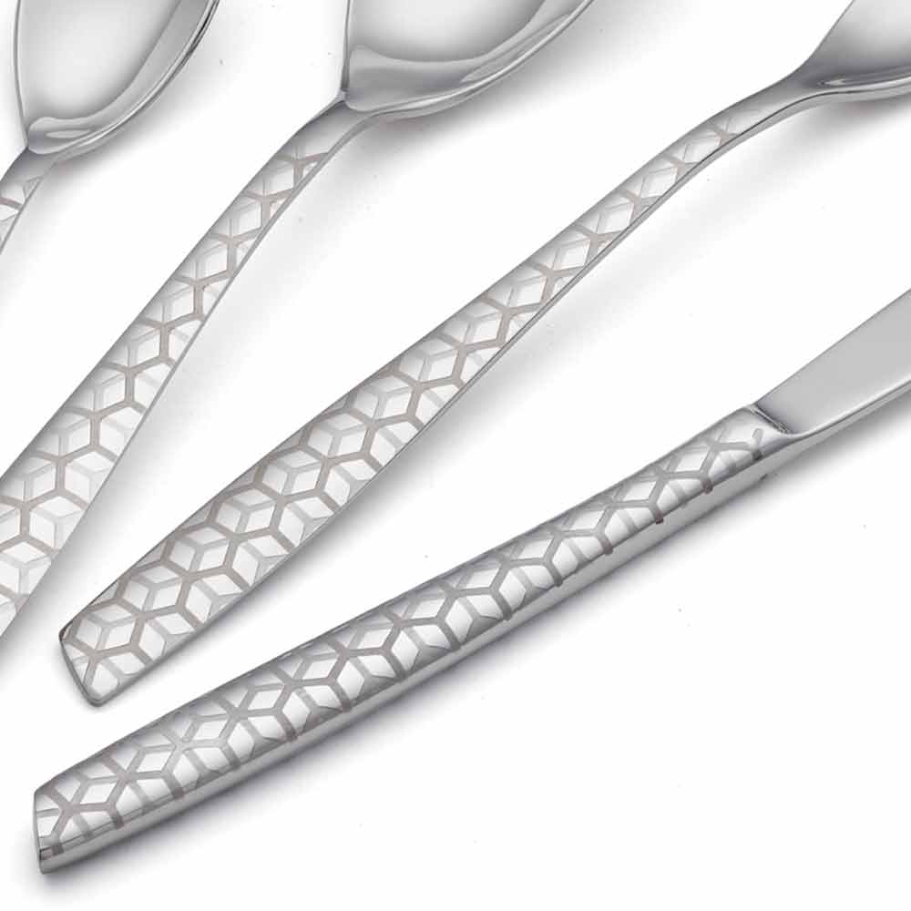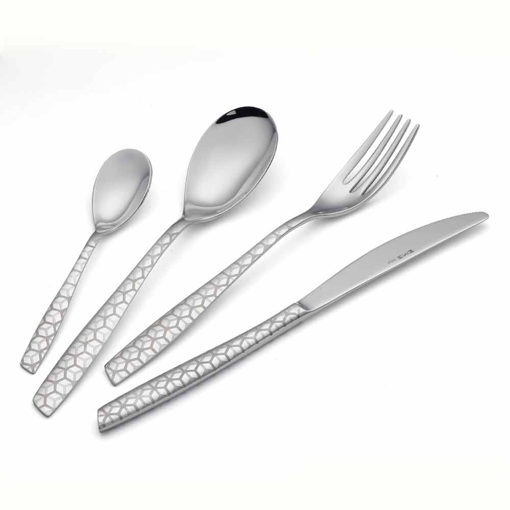 Set takëmesh prej çeliku inox 24 me një dizajn modern me dekor lazer dhe përfundim me shkëlqim, prodhuar në Itali.