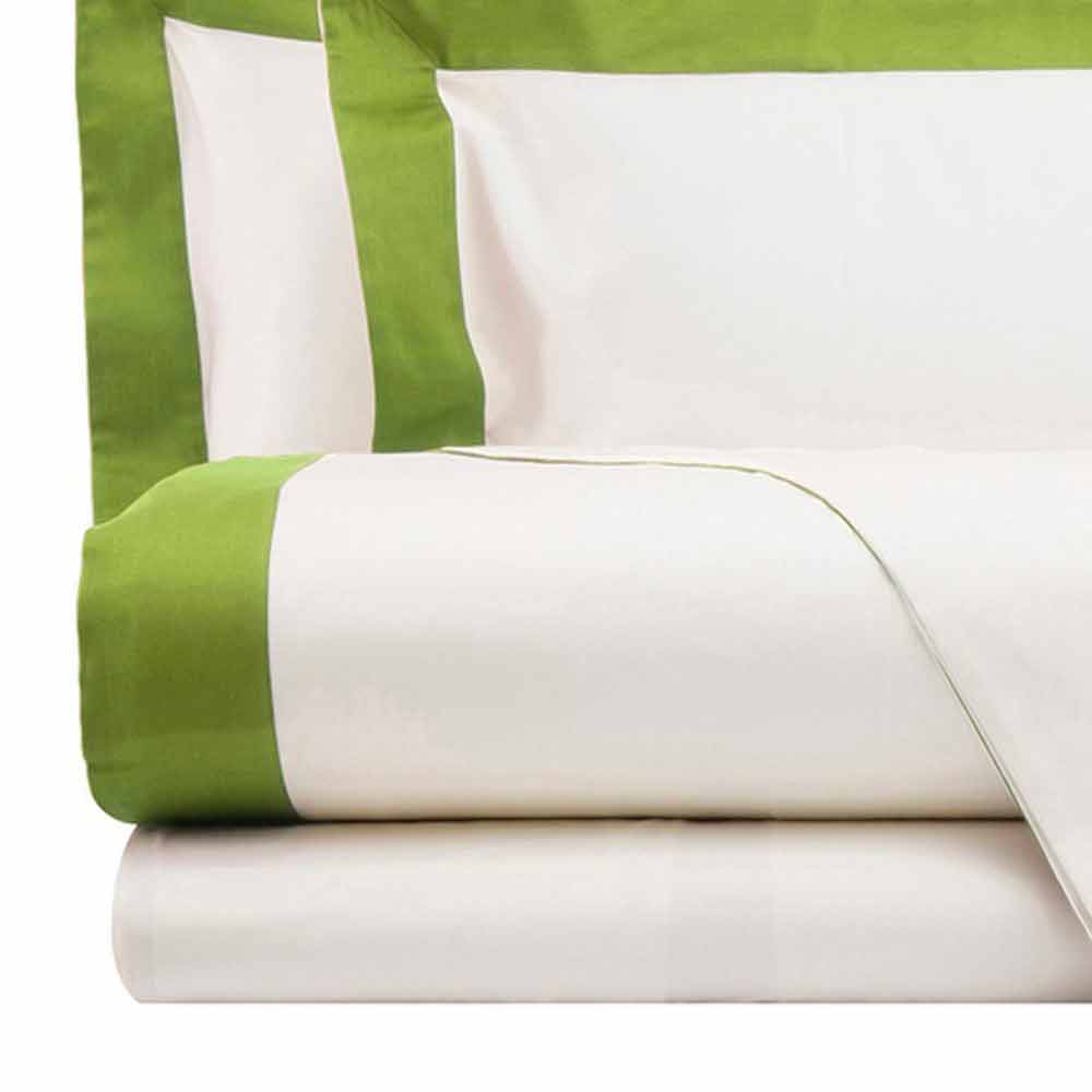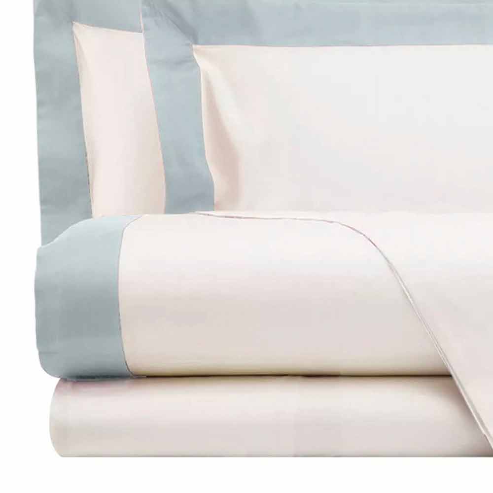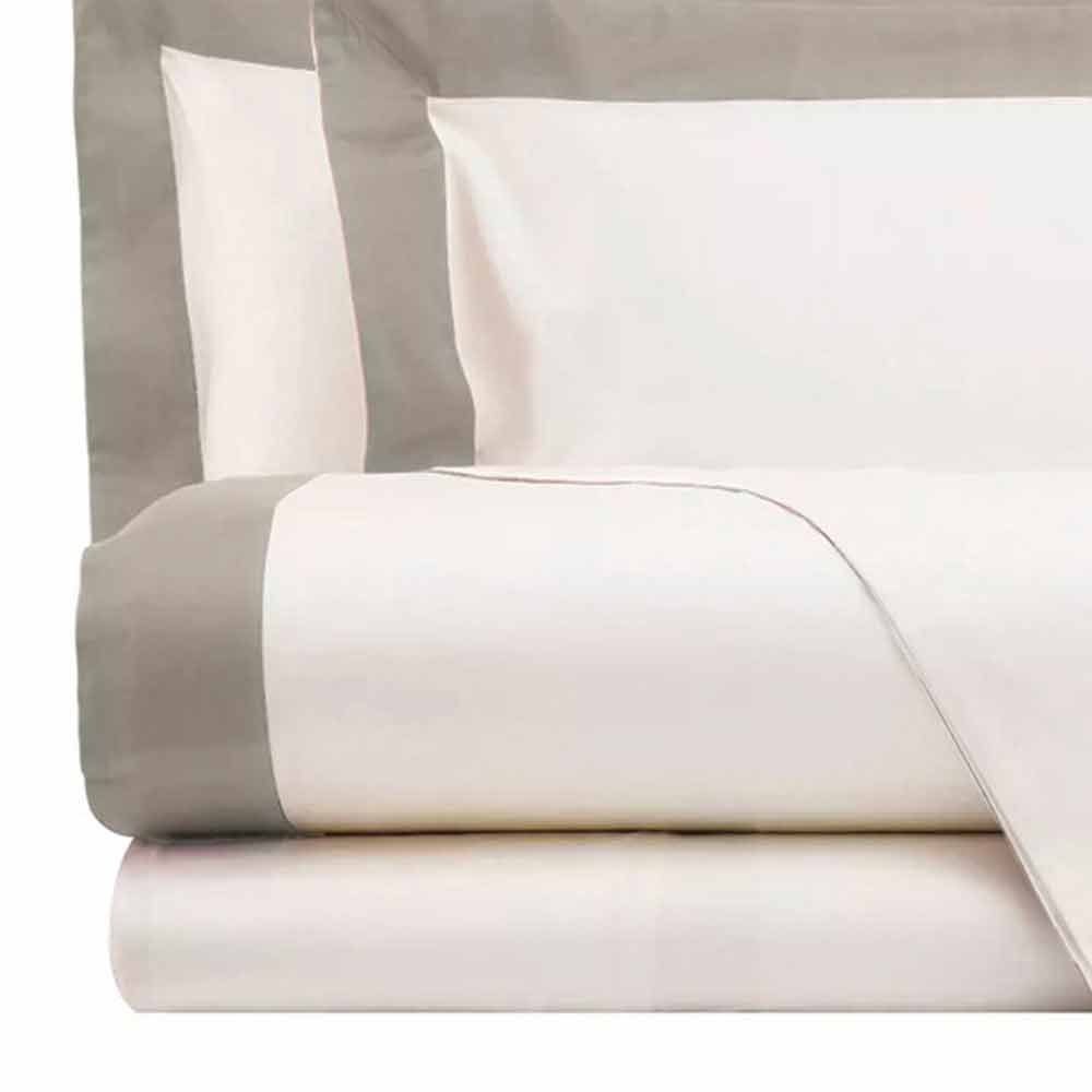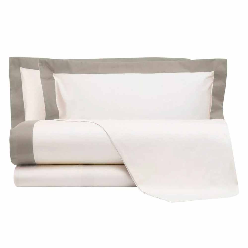 Komplet me çarçafë fildishi me kufi të kundërta të ngjyrave të ndryshme për krevat dopio në saten 200 TC të bëra në Itali.
