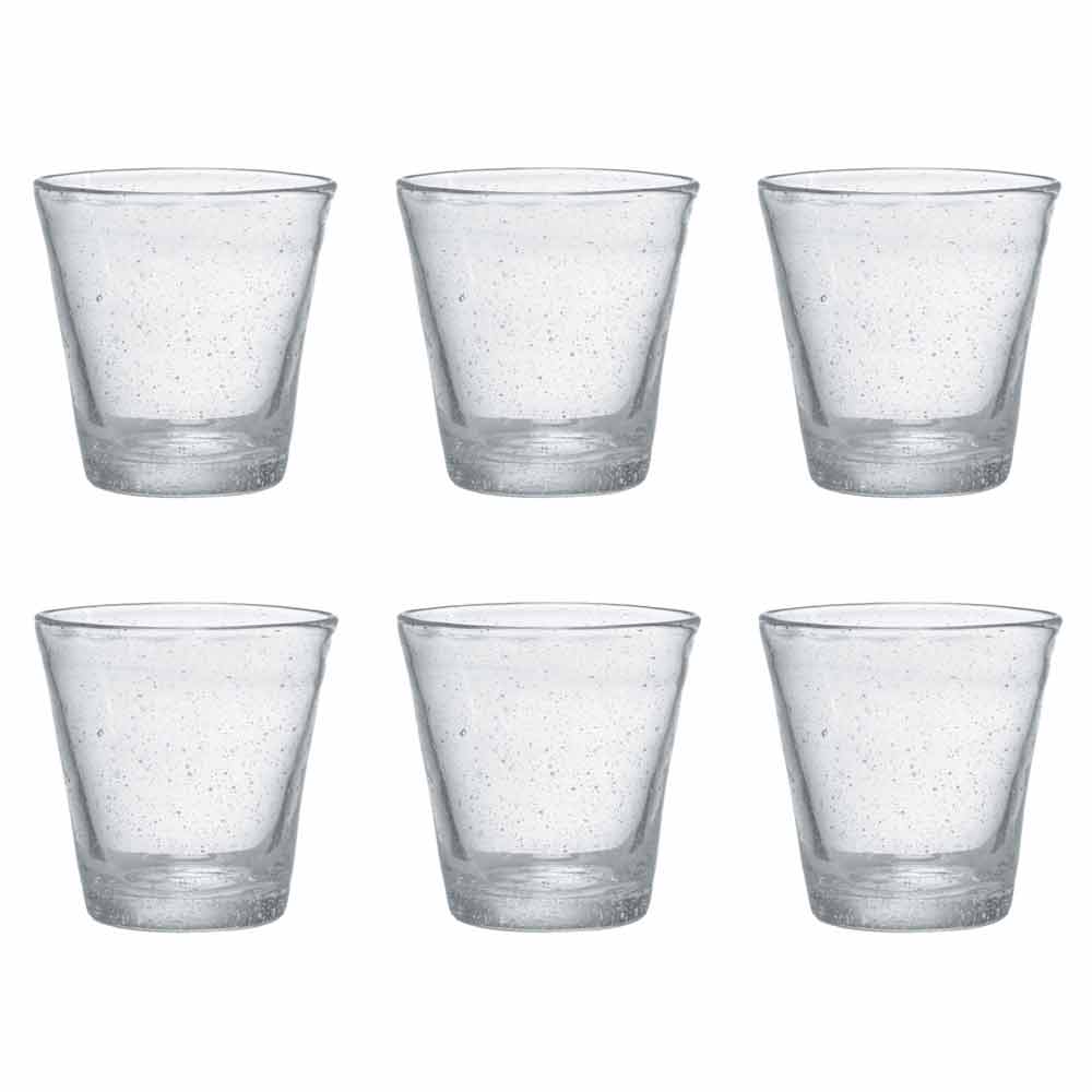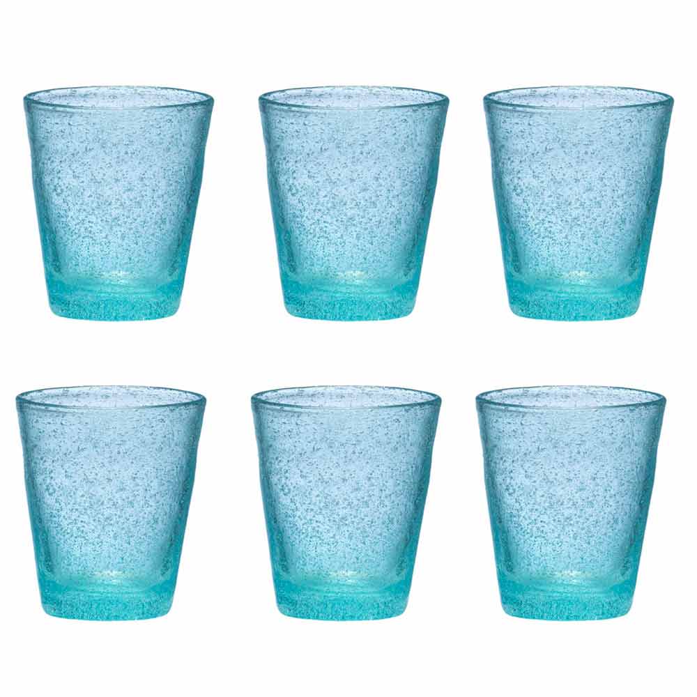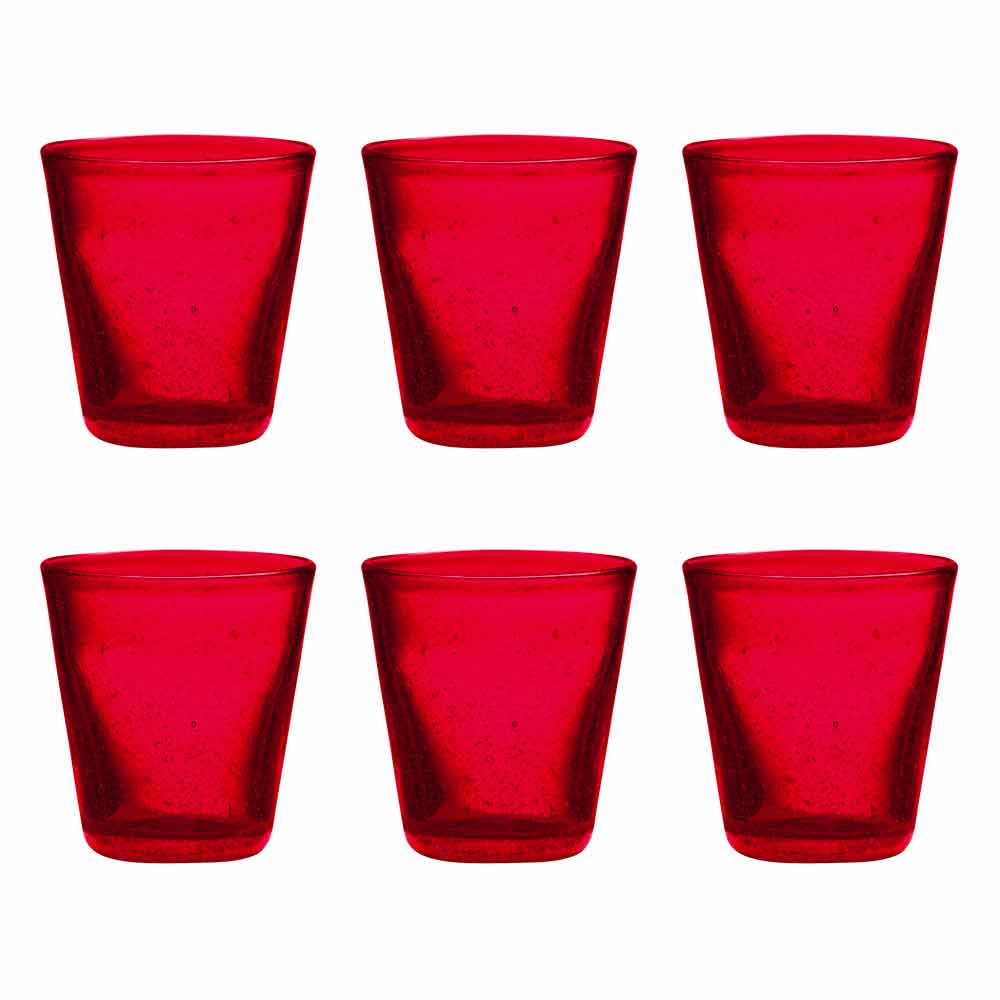 Përshtatshme për të gjitha stilet e mise në vend, syzet e ndritshme të tavolinës për ujë ose pije janë bërë nga qelqi i çelur transparent me një ngjyrë paste në njëmbëdhjetë hije të gjalla. Materiali eklektik dhe transparent pasqyron të gjithë thelbin e pijeve ndërsa prodhimi në lulëzim, me karakteristikat "flluska" të përfunduara, e bën estetiken e gazuar.