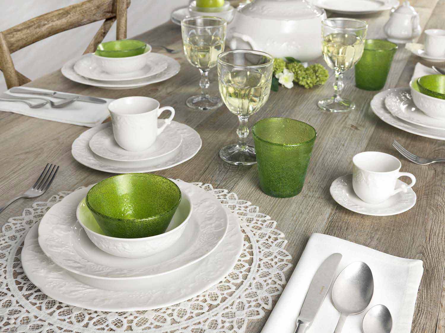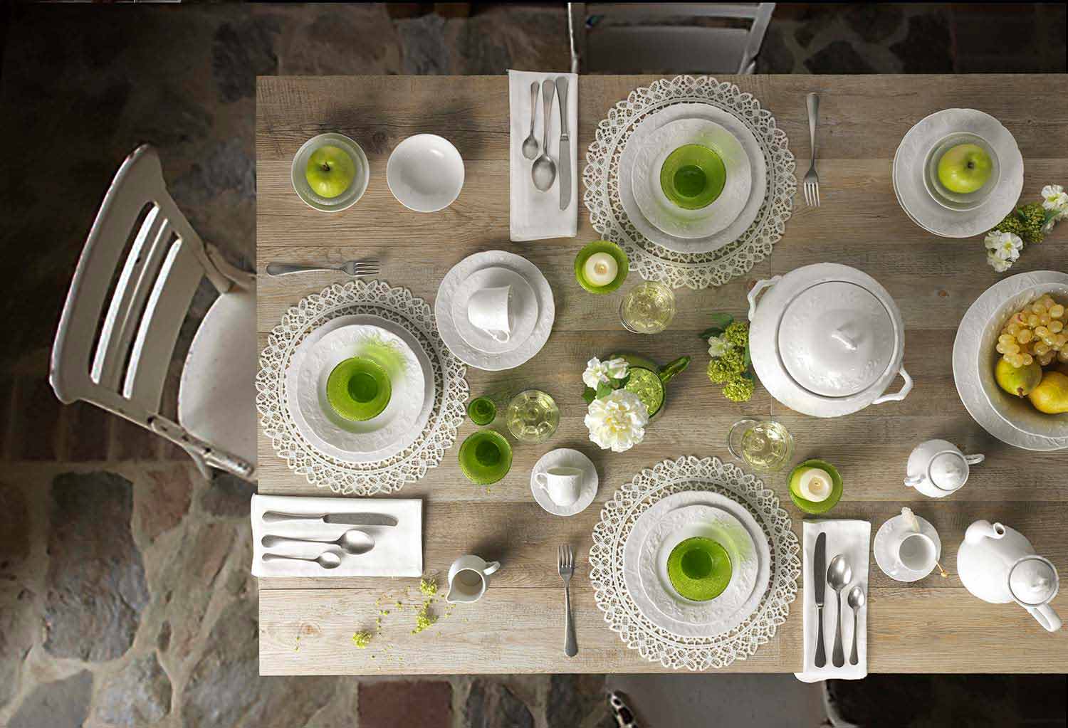 Përjetoni kulturën e tryezës së bërë nga emocione autentike, të pasqyruara në një të bardhë të pastër, duke zgjedhur midis stileve krijuese dhe emocionuese, midis formave harmonike në porcelan të imët që ofron ky shërbim.