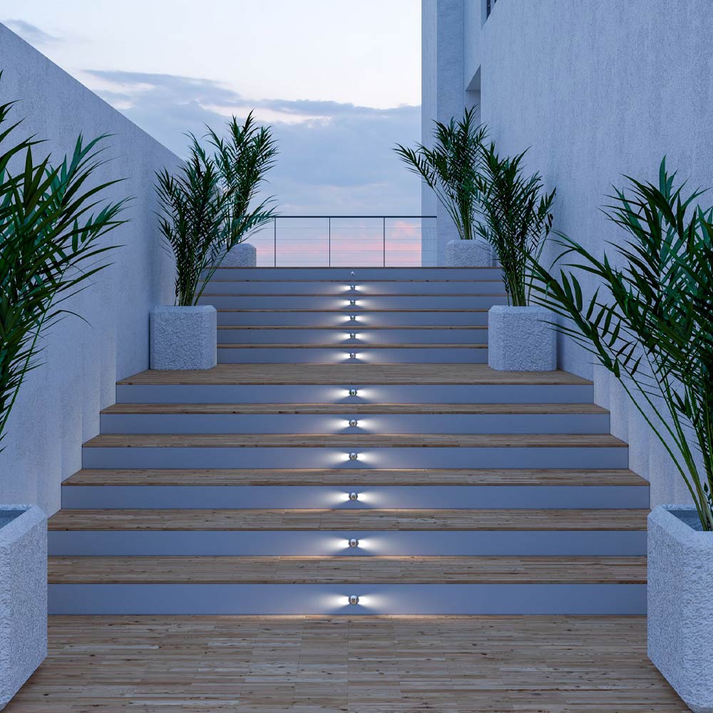 Projektor me dritë të jashtmeme strukturë të rrumbullakët të futur të kompletuar me LED 2Wprej çeliku inox . Një element funksional i ndriçimit teknik që ofron rezistencë optimale dhe një dizajn minimal ideal për sinjalizimin dhe ndriçimin e hapësirave të jashtme si korridoret, hyrjet, shtigjet, shkallët apo tarracat. Rezultati është një komplement me cilësi të lartë dhe veçanërisht funksional që ofron një atmosferë mikpritëse dhe nxjerr në pah zonat e jashtme brenda mjediseve shtëpiake ose me kontratë.