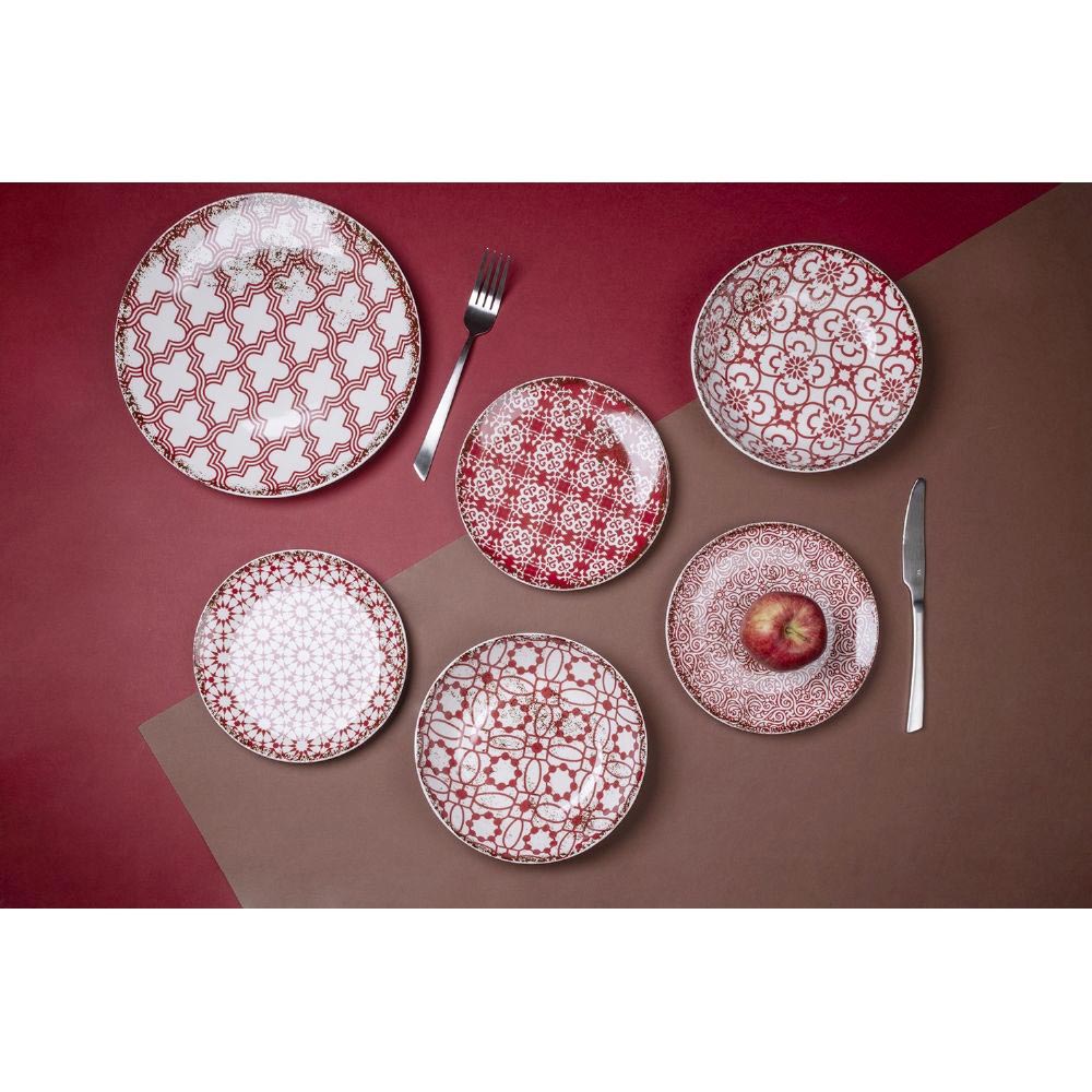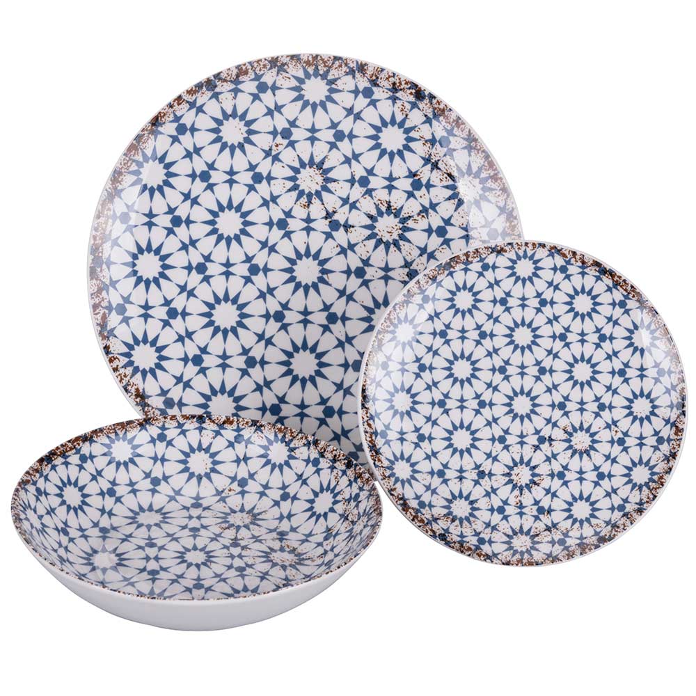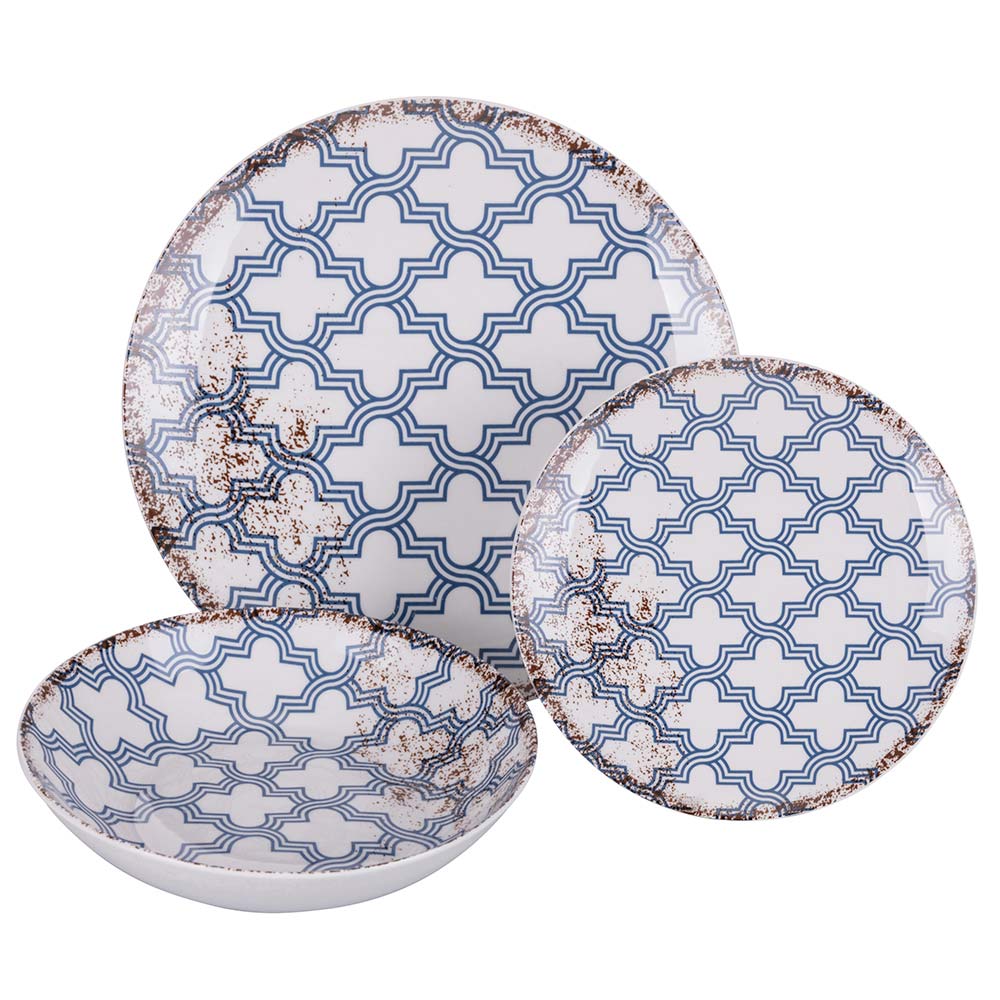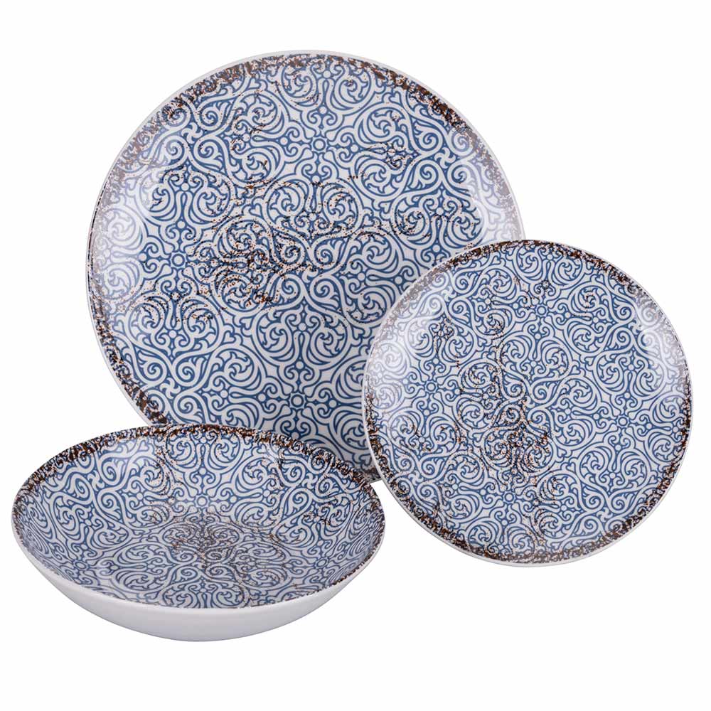 Lëreni veten të magjepseni nga ky grup prej 18 pjatash porcelani , një himn për bukurinë klasike me një prekje moderne. Çdo pjatë krenohet me një dizajn të ndërlikuar , që të kujton qeramikën e hollë Delft, të cilat ndërthuren në një mozaik modelesh që flasin gjuhën e elegancës së përjetshme.