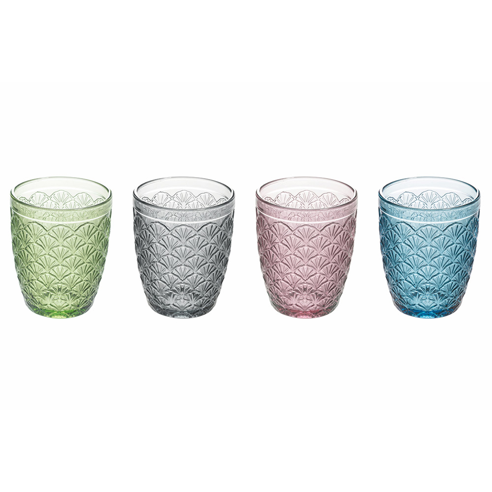 Kjo linjë gotash uji sjell artin në tryezë.Sipërfaqja e gdhendur është frymëzuar nga Art Déco, duke ri-propozuar motivet gjeometrike që karakterizuan të gjithë prodhimin e periudhës. Përbërja bëhet aktuale falë katër ngjyrave të ndryshme për çdo tryezë që do të jenë kaq origjinale dhe në modë.