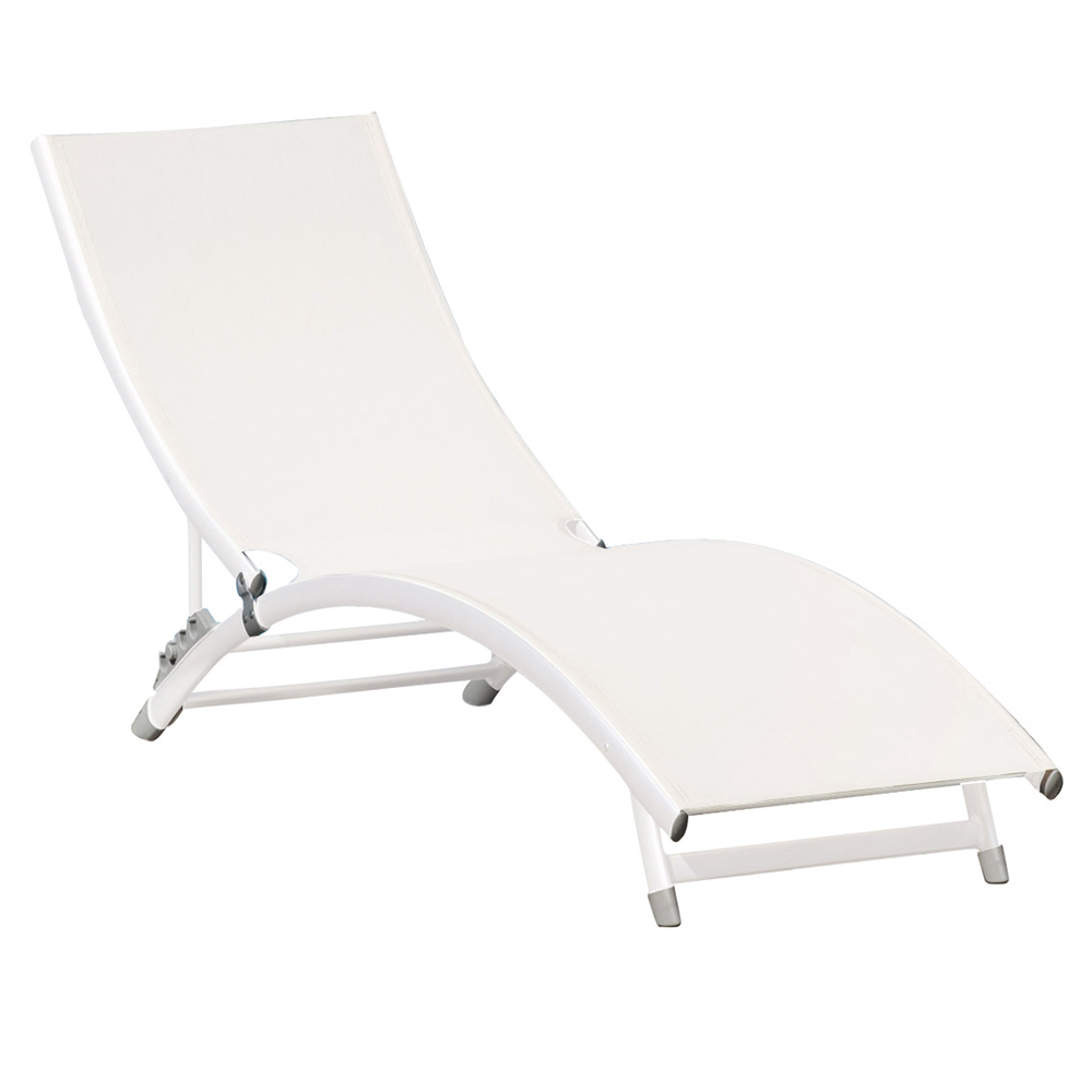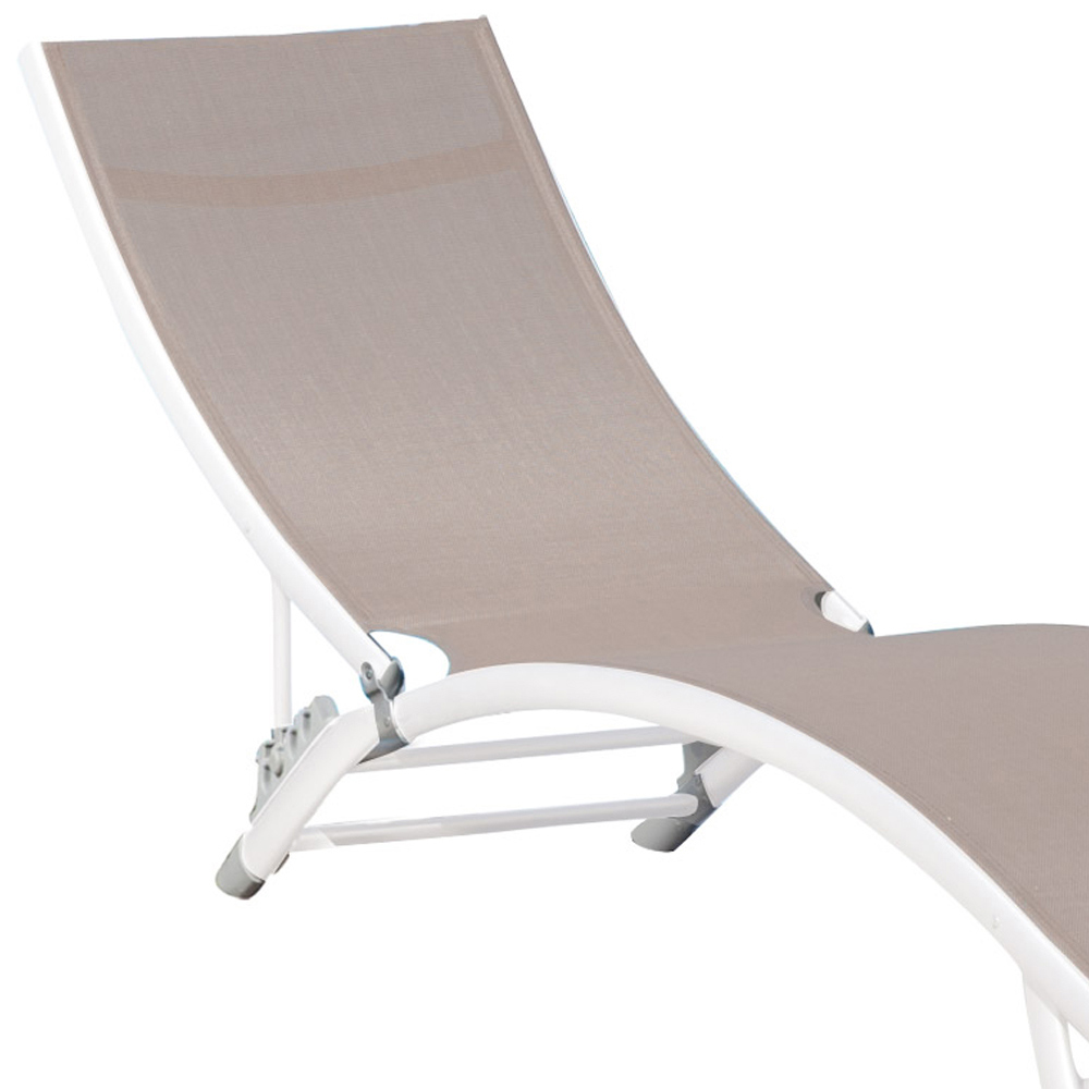 Shezlong kopshti i stivueshëm me strukturë prej alumini të bardhë me tub 40 x 20 mm dhe ndenjëse në tekstil 600 gr . Një dizajn elegant dhe funksional i shënuar nga linja thelbësore që e bëjnë atë të përsosur për kontekste të jashtme si plazhet, resortet bregdetare dhe resortet ekskluzive turistike, por edhe hapësirat shtëpiake si kopshtet dhe buzë pishinës.