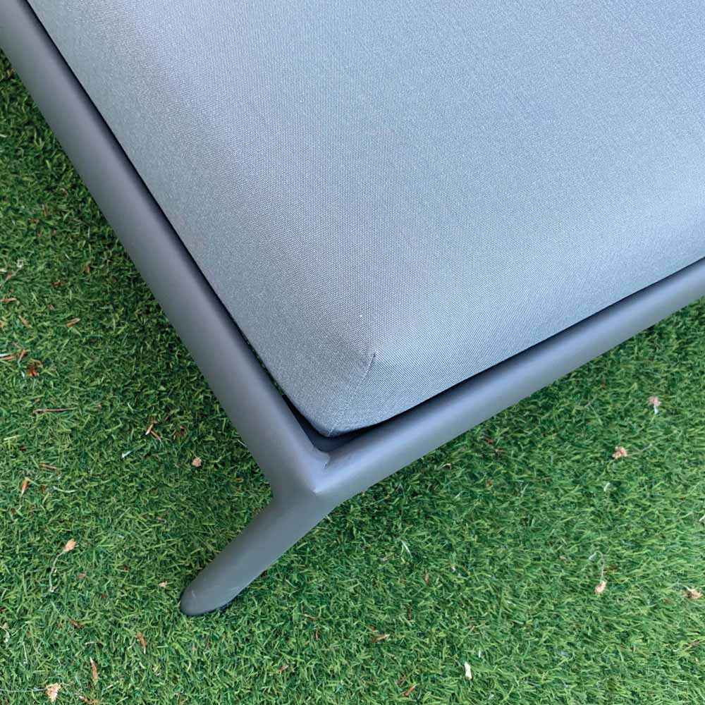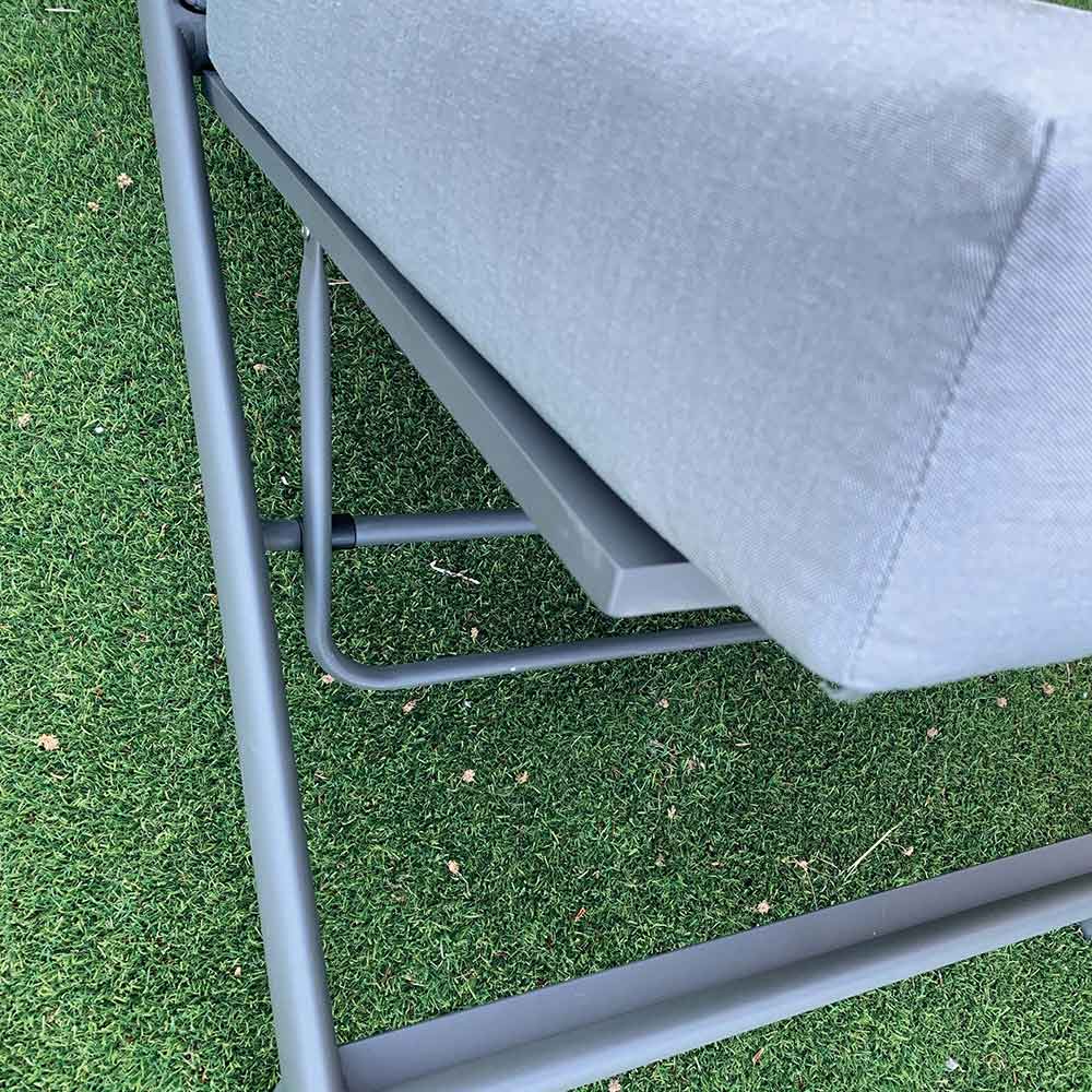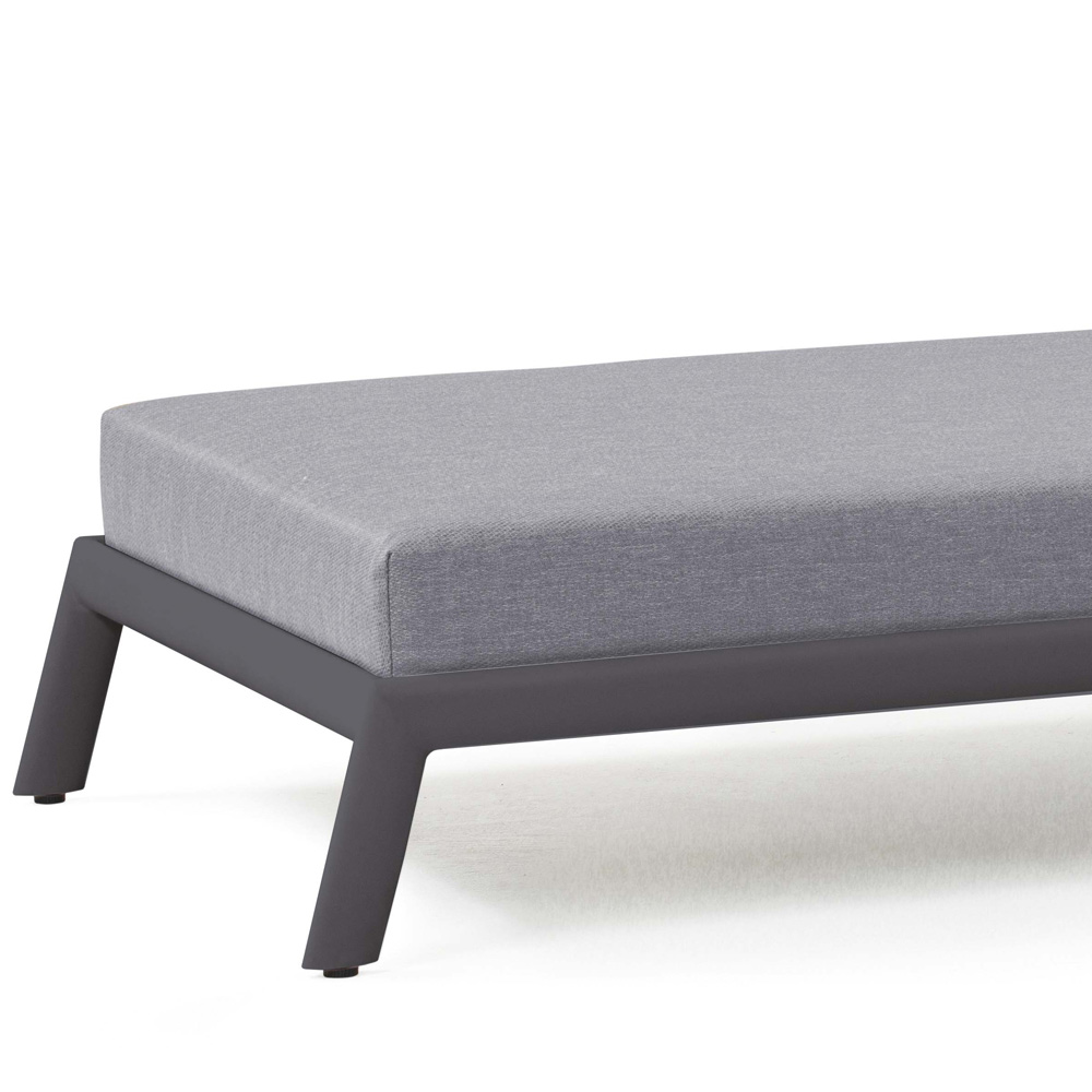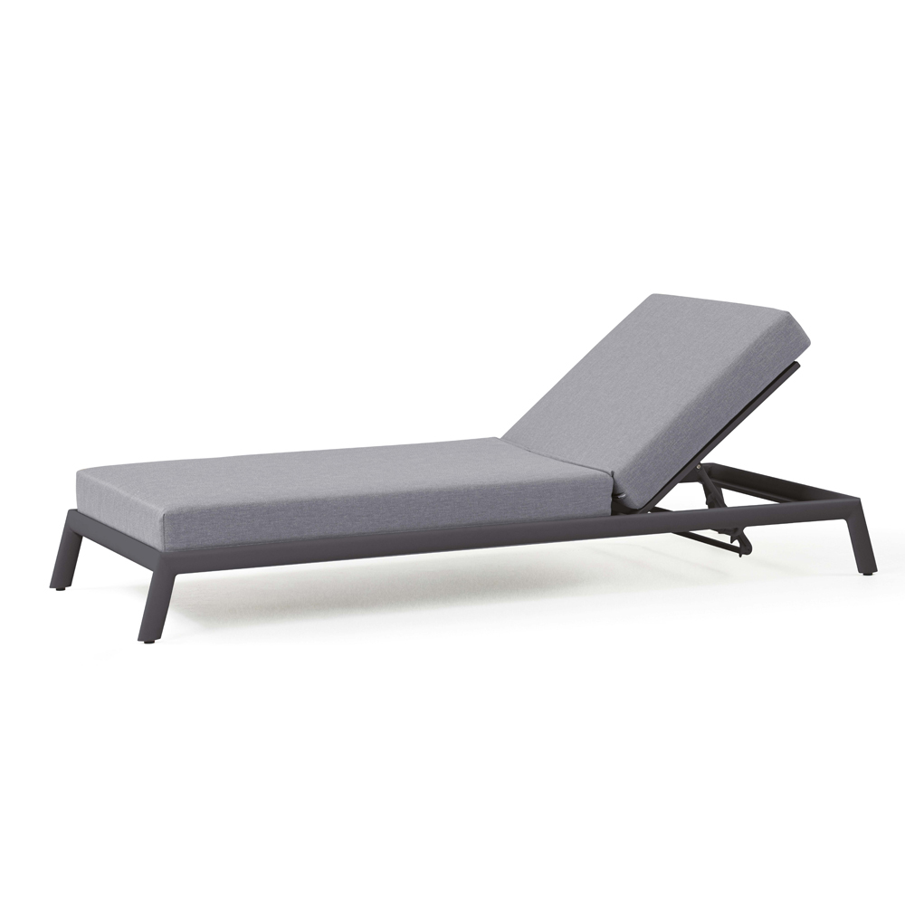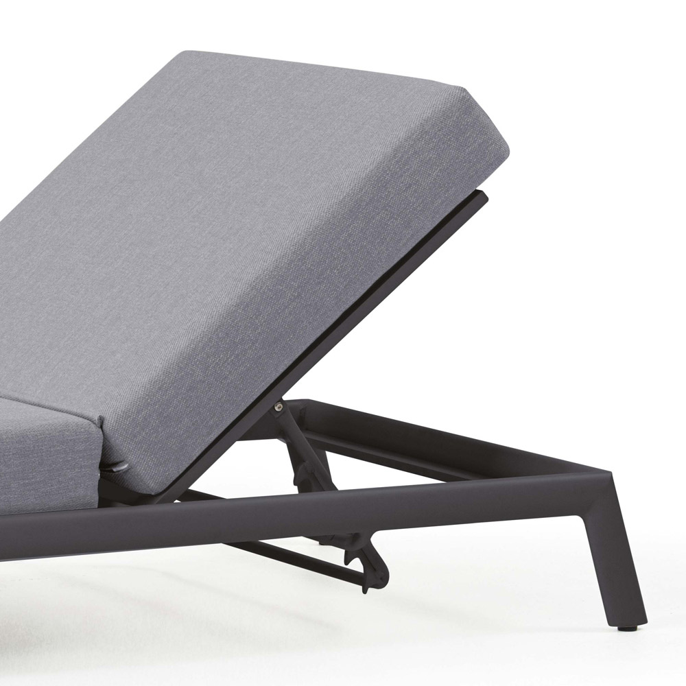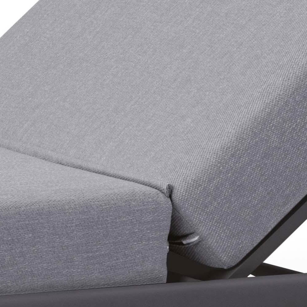 Shezlong kopshti me strukturë të brendshme prej alumini të lyer me antracit me gomë që kullon me shkumë të shpejtë dhe tapiceri pëlhure ngjyrë gri qielli.