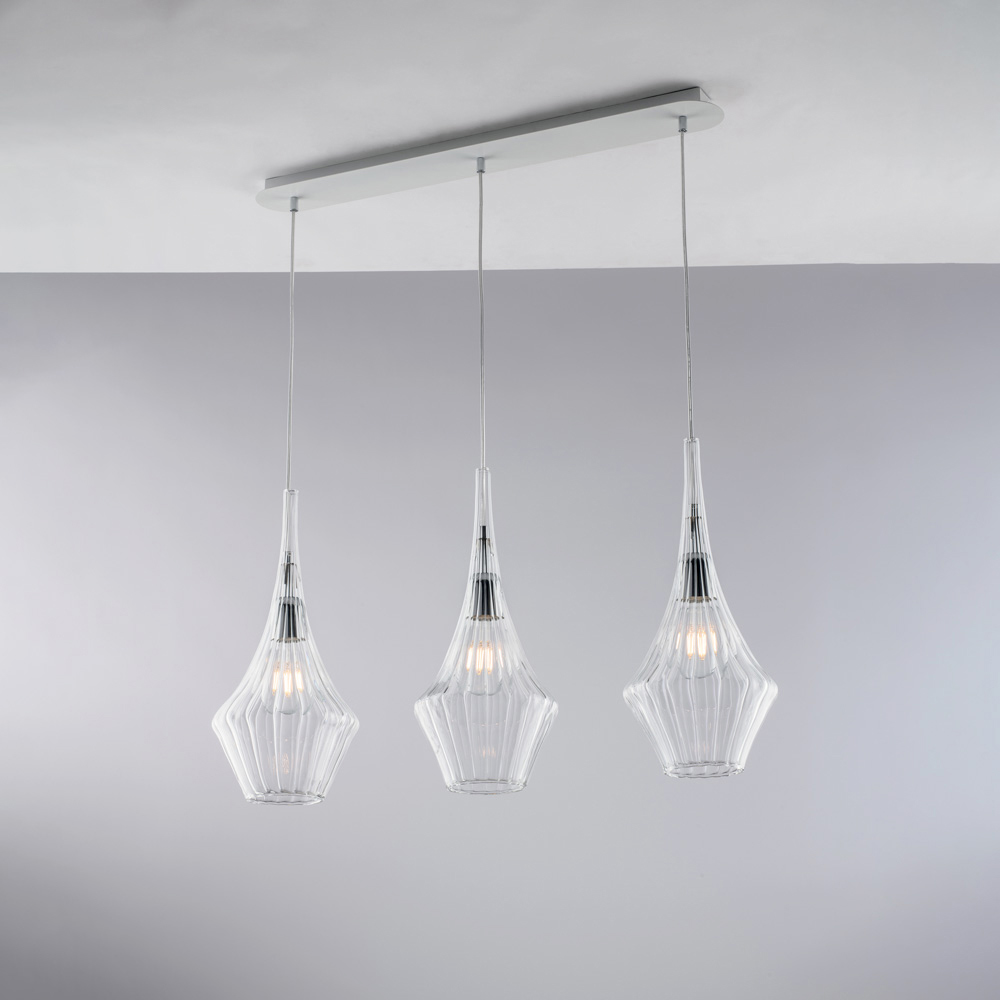 E efektshme dhe elegante, kjo varëse hekuri e punuar me dorë me xham Pyrex është një zgjidhje bashkëkohore ndriçimi e projektuar për të përmirësuar hapësirat me ekuilibër dhe rafinim. Tre difuzorët prej qelqi Pyrex , me format e tyre të fasetuara dhe harmonike, e shpërndajnë dritën në mënyrë të barabartë, duke krijuar një atmosferë të ndritshme dhe të sofistikuar.