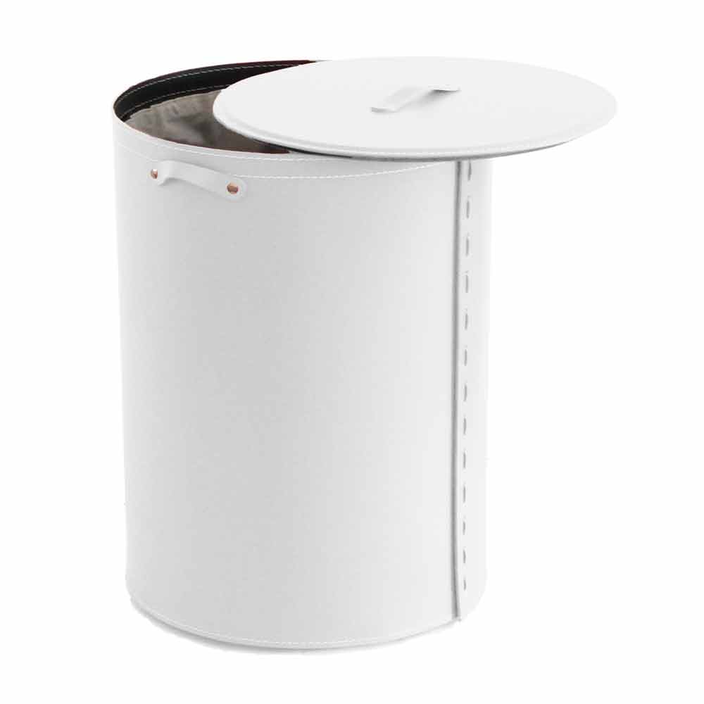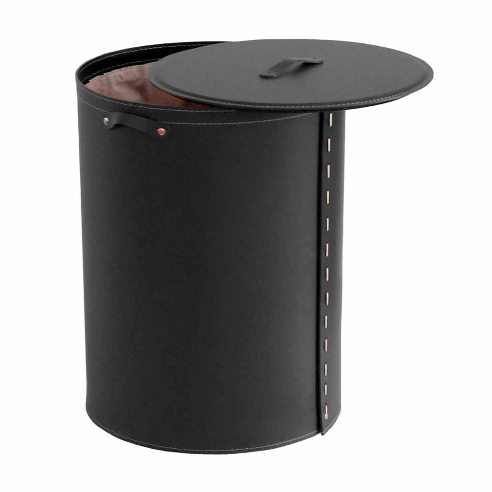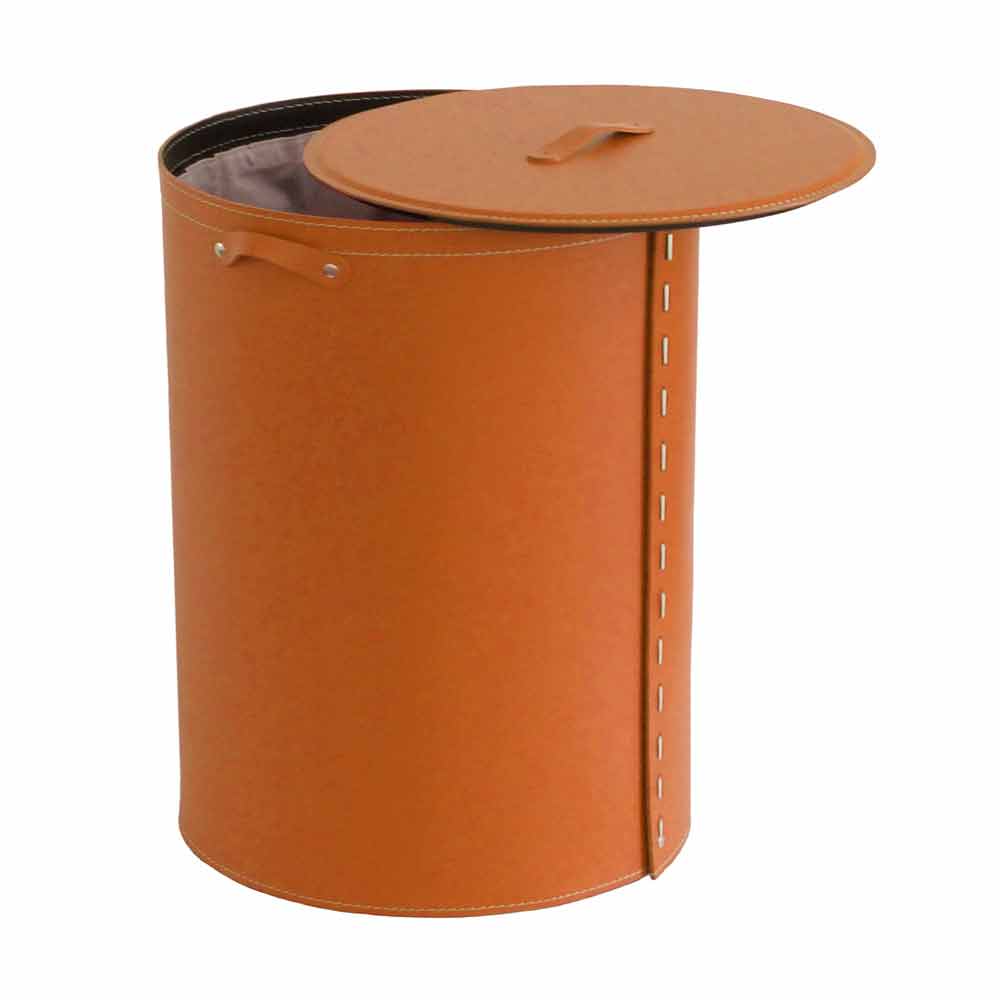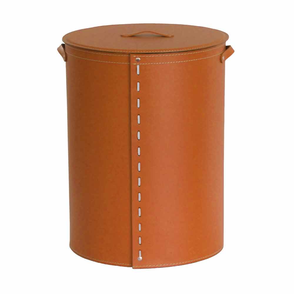 Shporta lavanderi ovale e bërë në lëkurë të rigjeneruar me qese të brendshme të lëvizshme në pambuk të pastër. Struktura në kompensatë e mbuluar prej lëkure me këmbë gome.