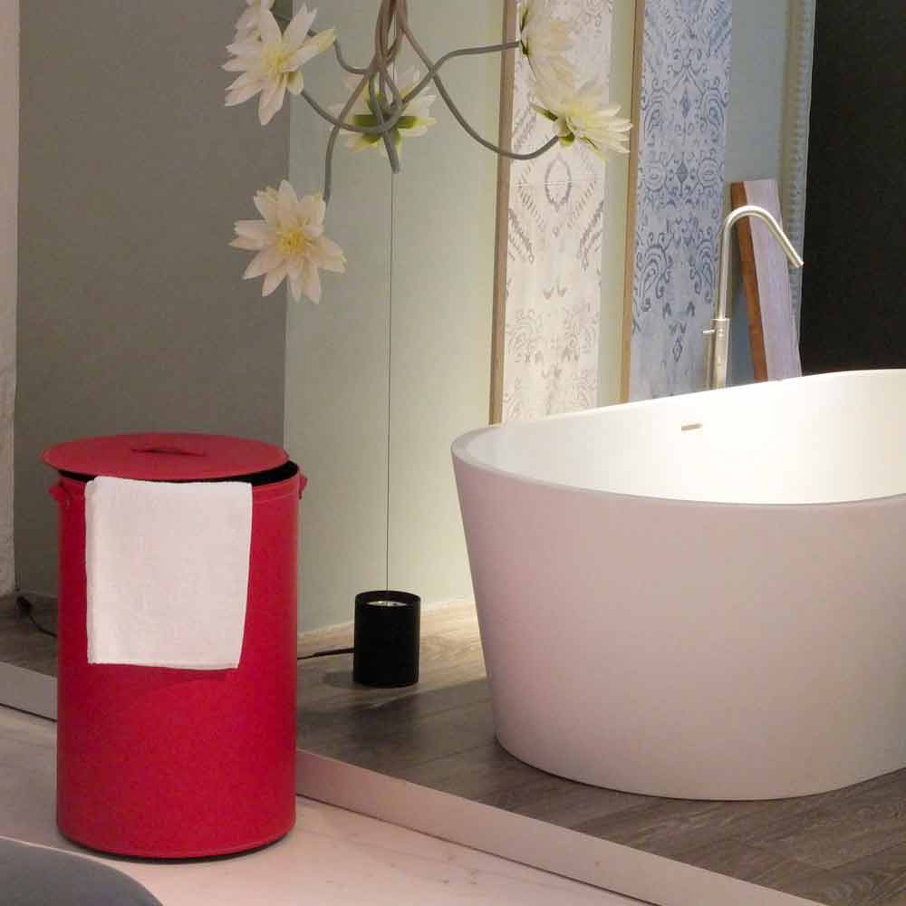 Shporta cilindrike cilindrike e bërë në lëkurë të rigjeneruar me rreshtim të pastër pambuku të hequr me dorë brenda. Struktura është bërë në kompensatë e mbuluar me lëkurë të rigjeneruar dhe furnizohet me këmbë gome.