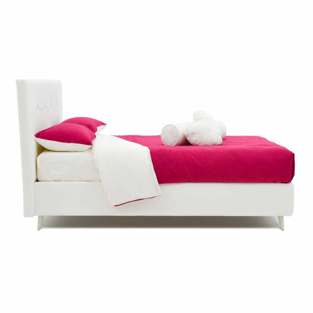 Krevat dopio me dizajn me këmbë të bardha druri dhe mbulesë lëkure imitim Made in Italy.