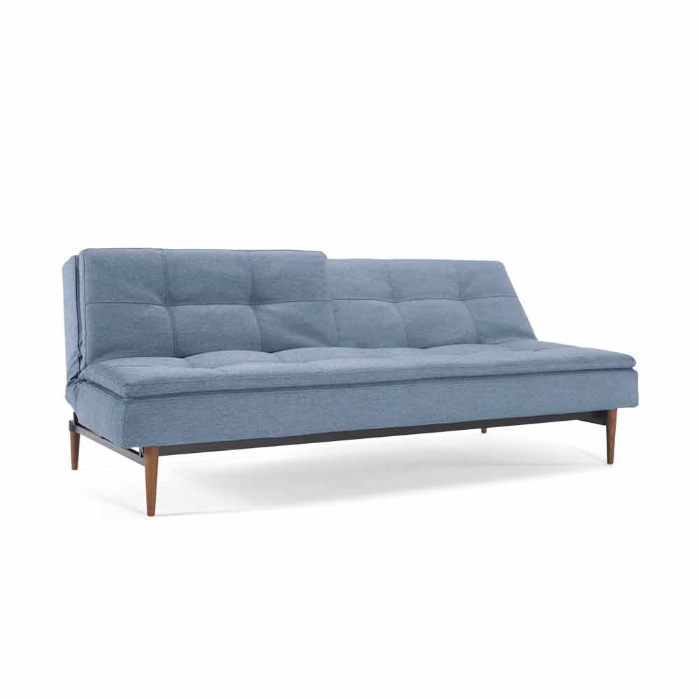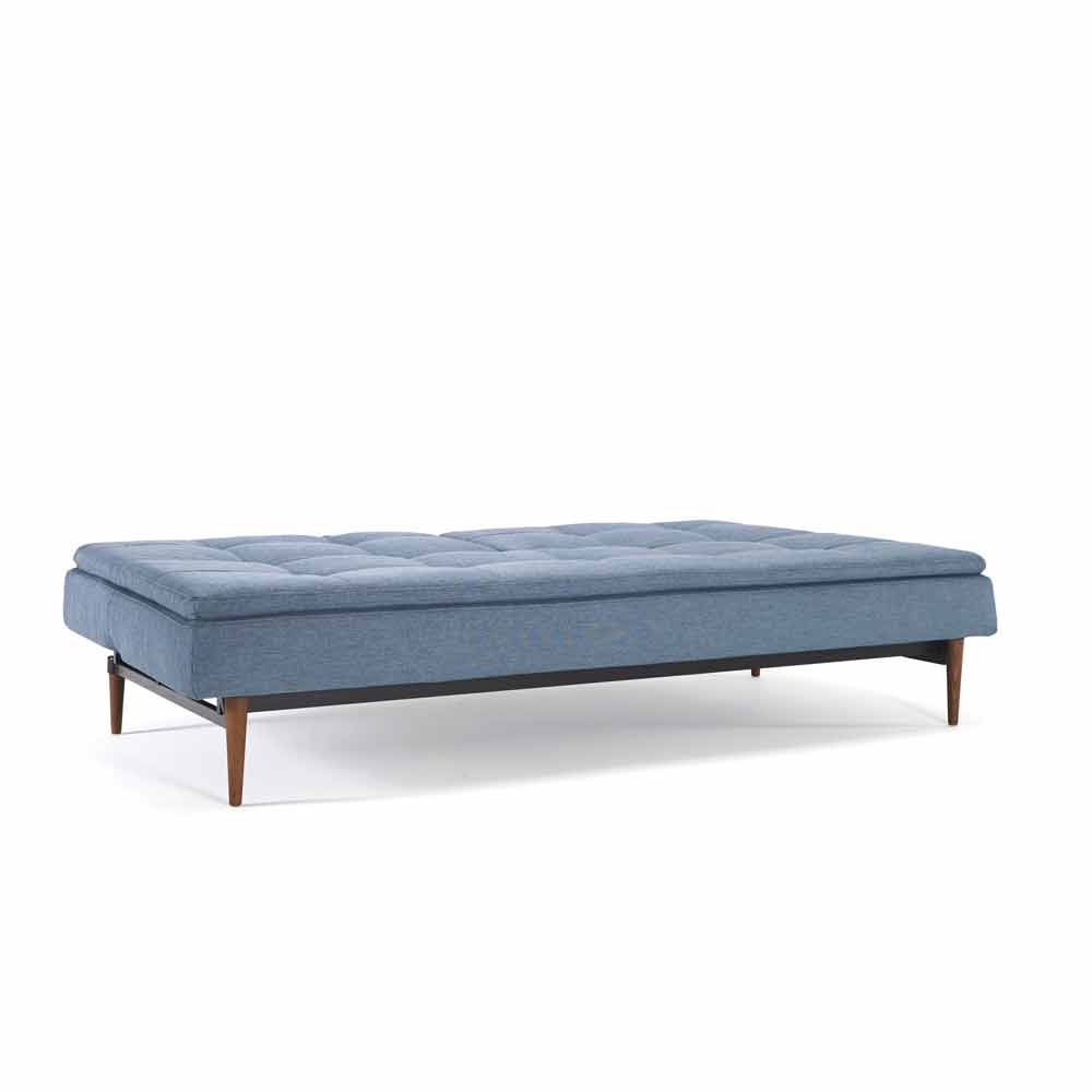 Divan -krevat blu me dizajn skandinav të rregullueshëm në 3 pozicione Dublexo by Innovation, këmbë në dru të errët, strukturë të zezë mat. Dublexo paraqet një dizajn modern dhe novator, por në të njëjtën kohë klasik. Mbështetësja e shpinës ndahet në dy pjesë të pavarura që mund të rregullohen në 3 pozicione: divan, relaks dhe shtrat. Në kombinim me kolltukun ju merrni disa mundësi, p.sh. chaiselounge.
