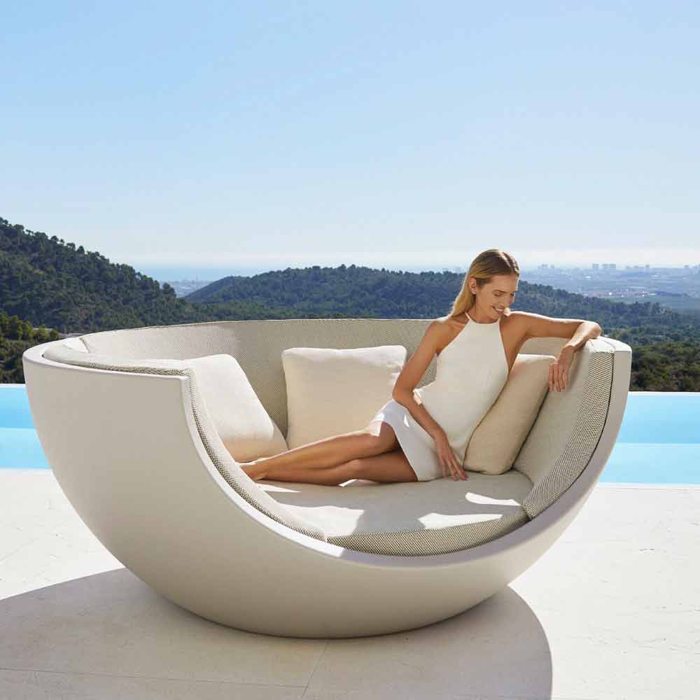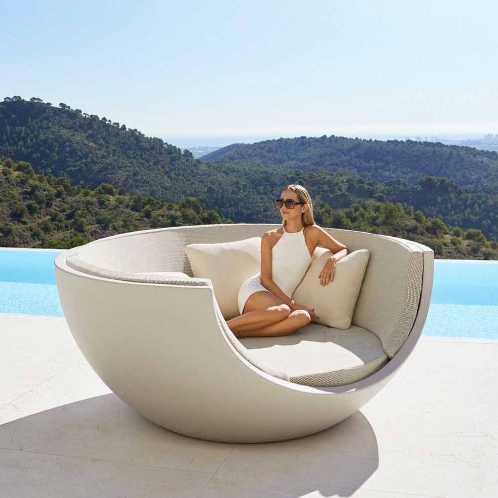 Shtrat luksoz në natyrë me një dizajn rrethor dhe rrotullues në polietileni me ngjyra të ndryshme me një fund mat.