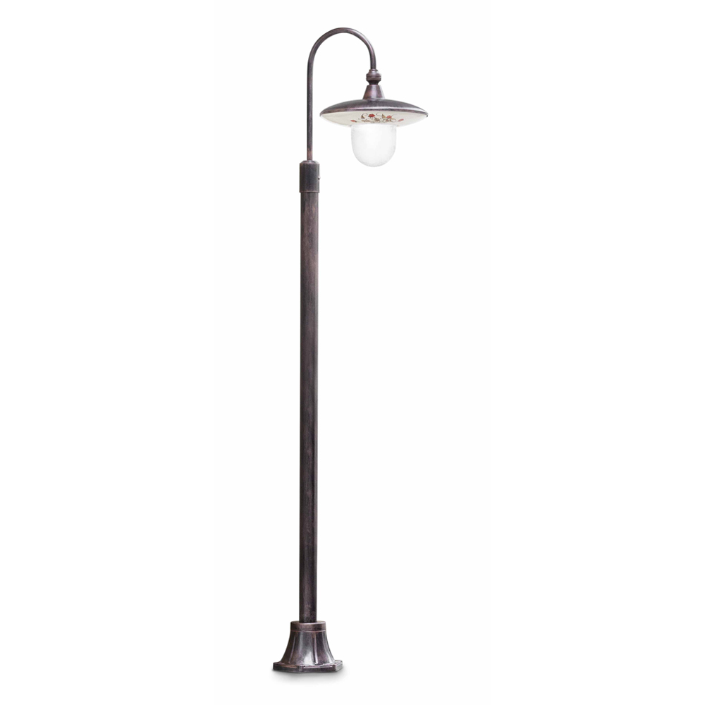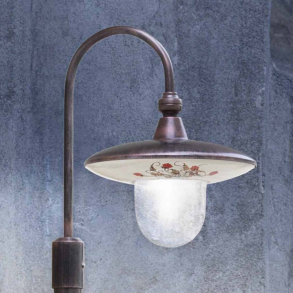 Kjo llambë kopshti është tërësisht prej alumini të zi me nuancë bakri dhe e zbukuruar me lule të lyera me dorë për një stil klasik dhe harmonik midis formës dhe ngjyrave.