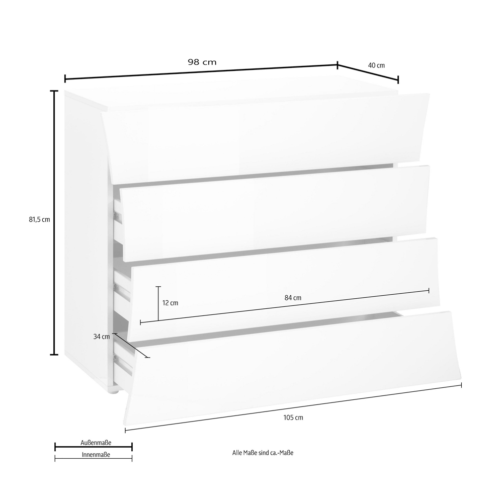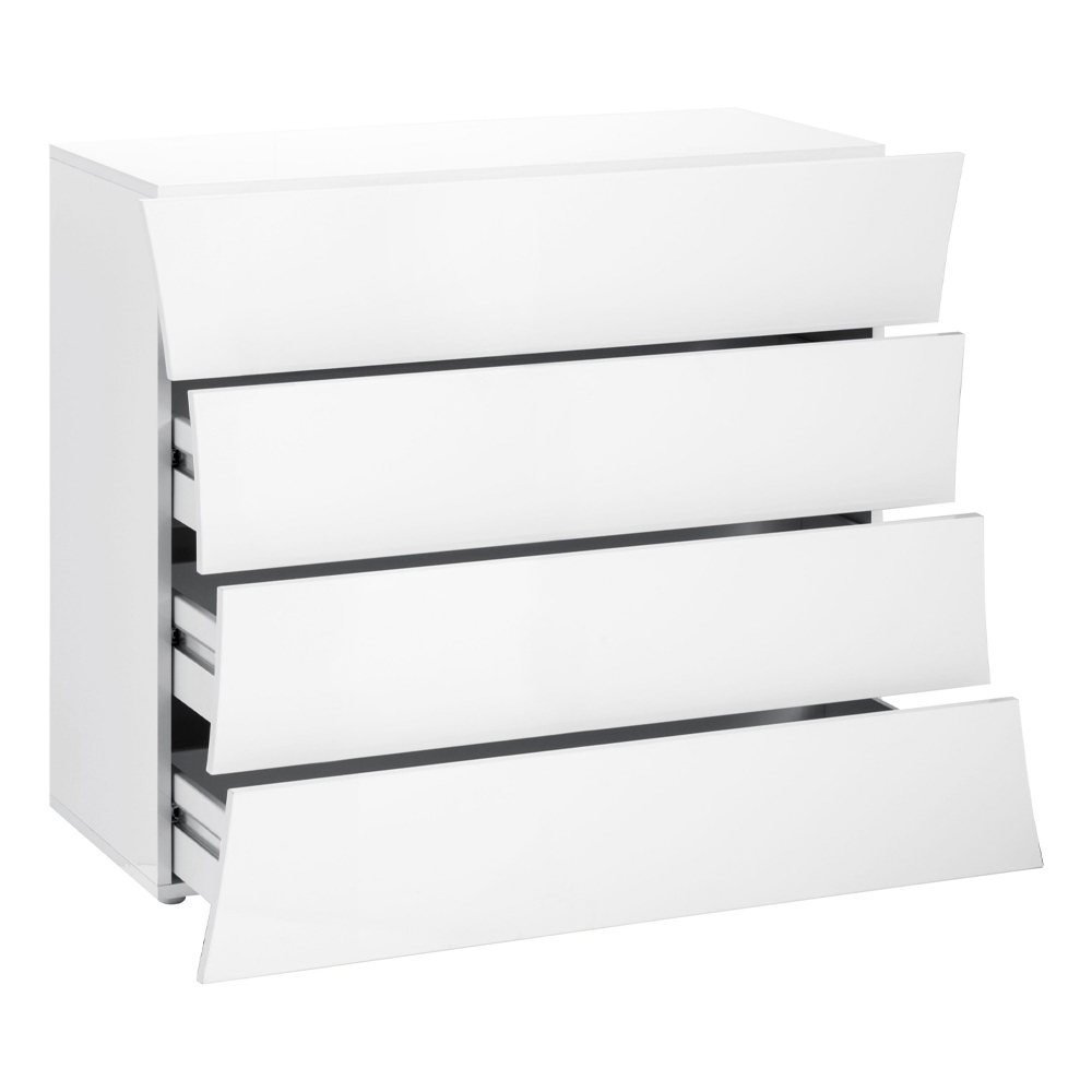 E bërë nga druri i qëndrueshëm melamine i fortë dhe rezistent i lyer në të bardhë me shkëlqim me ngjyra ekologjike, përbëhet nga 4 sirtarë për funksionalitet maksimal.