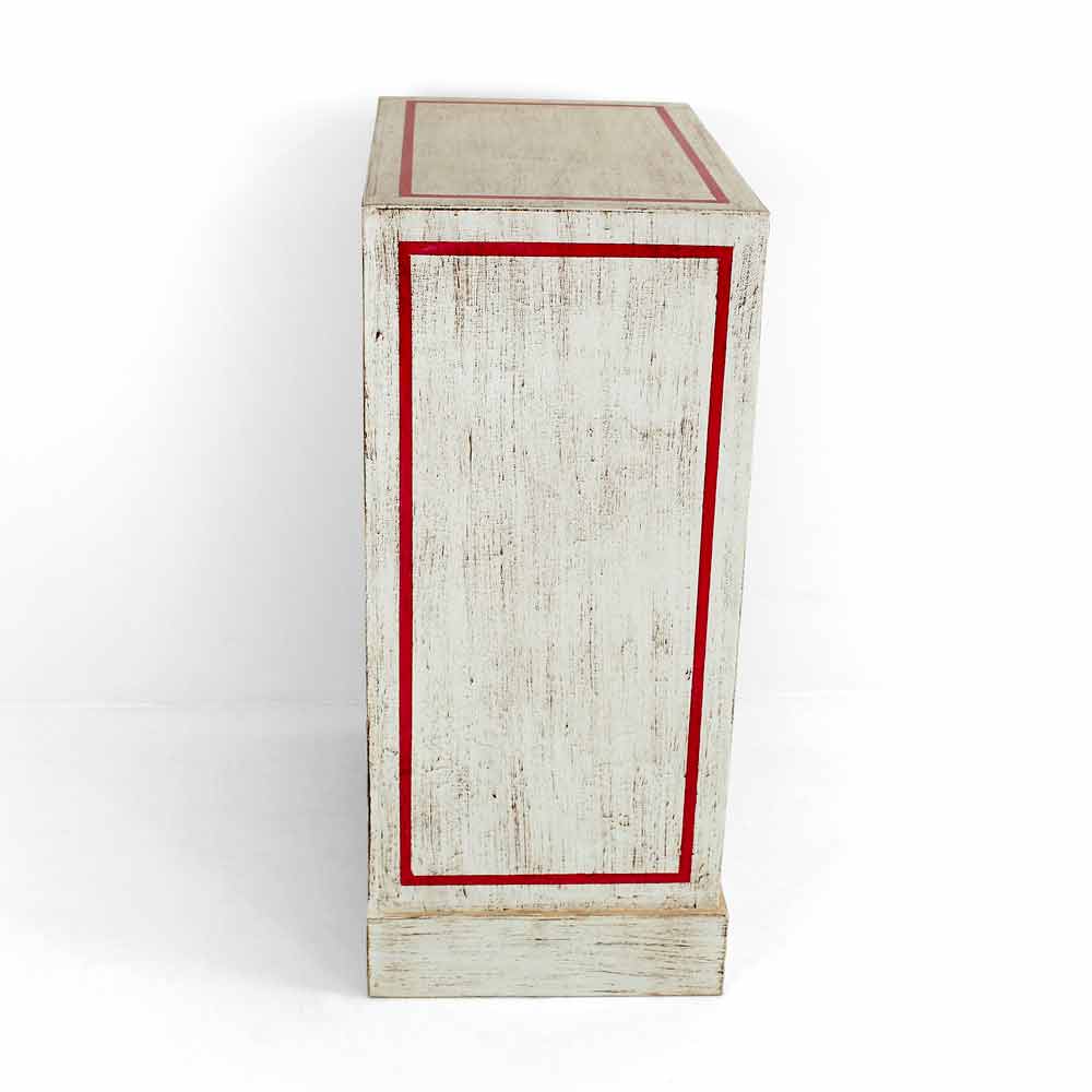 Sirtarët e punuar me dorë në Itali me strukturë në dru të fortë dhe me fund të bardhë të vjetër dhe 6 sirtarë në kompensatë plepi me panel para druri të pikturuar në model diagonale dhe detaje në ar dhe antike të kuqe. Produkti përfundon me një përfundim transparent që e bën atë të papërshkueshëm nga uji dhe rregullon ngjyrat për t'i bërë ato të pandryshueshme me kalimin e kohës.