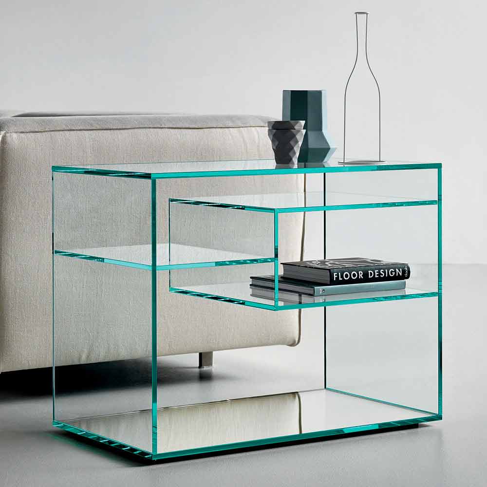 Kjo tryezë anash divanit ose tavolina e shtratit karakterizohet nga dizajni i saj i gjithanshëm , elegant dhe minimal, i bërë tërësisht nga xhami ekstra të pastër me bazën e pasqyrës.
