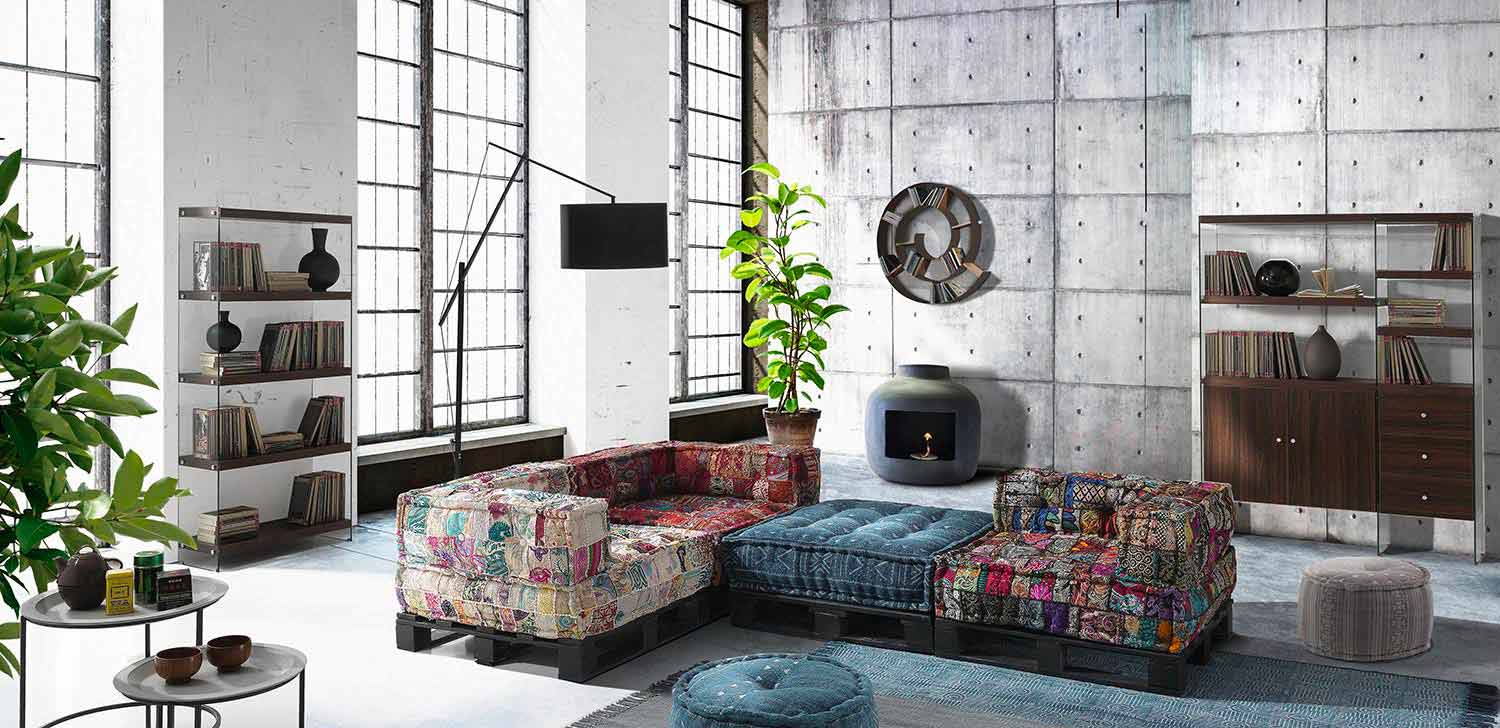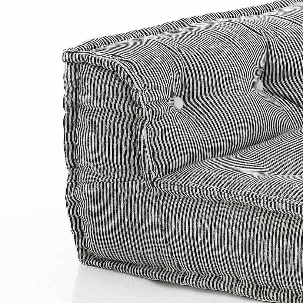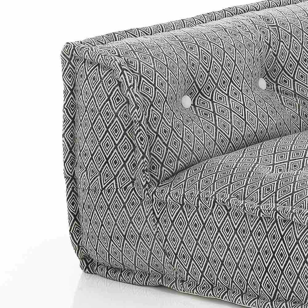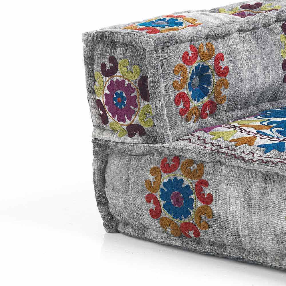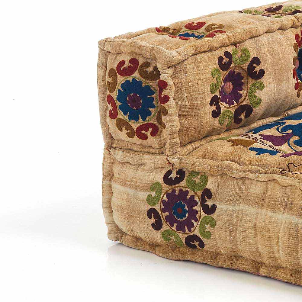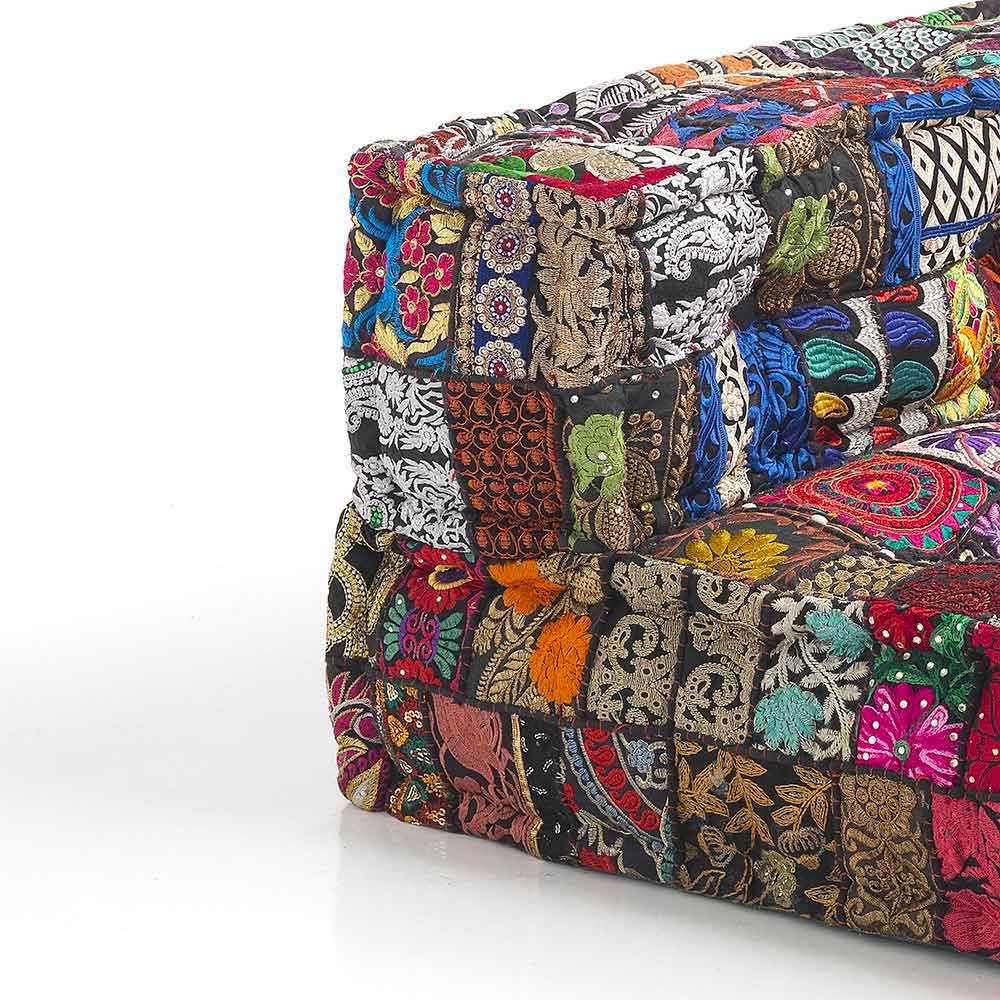 Divan i veshur me susta në pëlhurat e lara-lara dhe druri i pikturuar zi ose i bardhë me dizajn etnik.