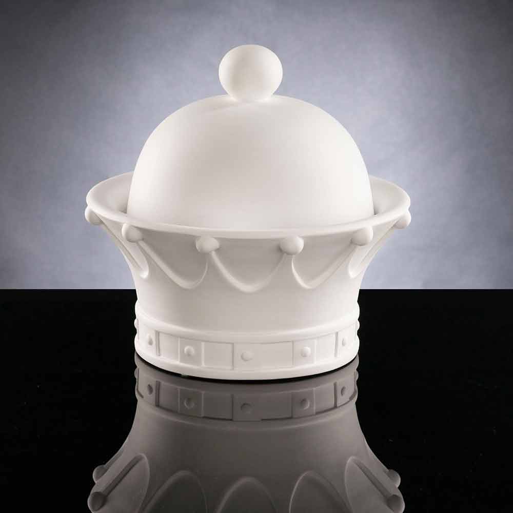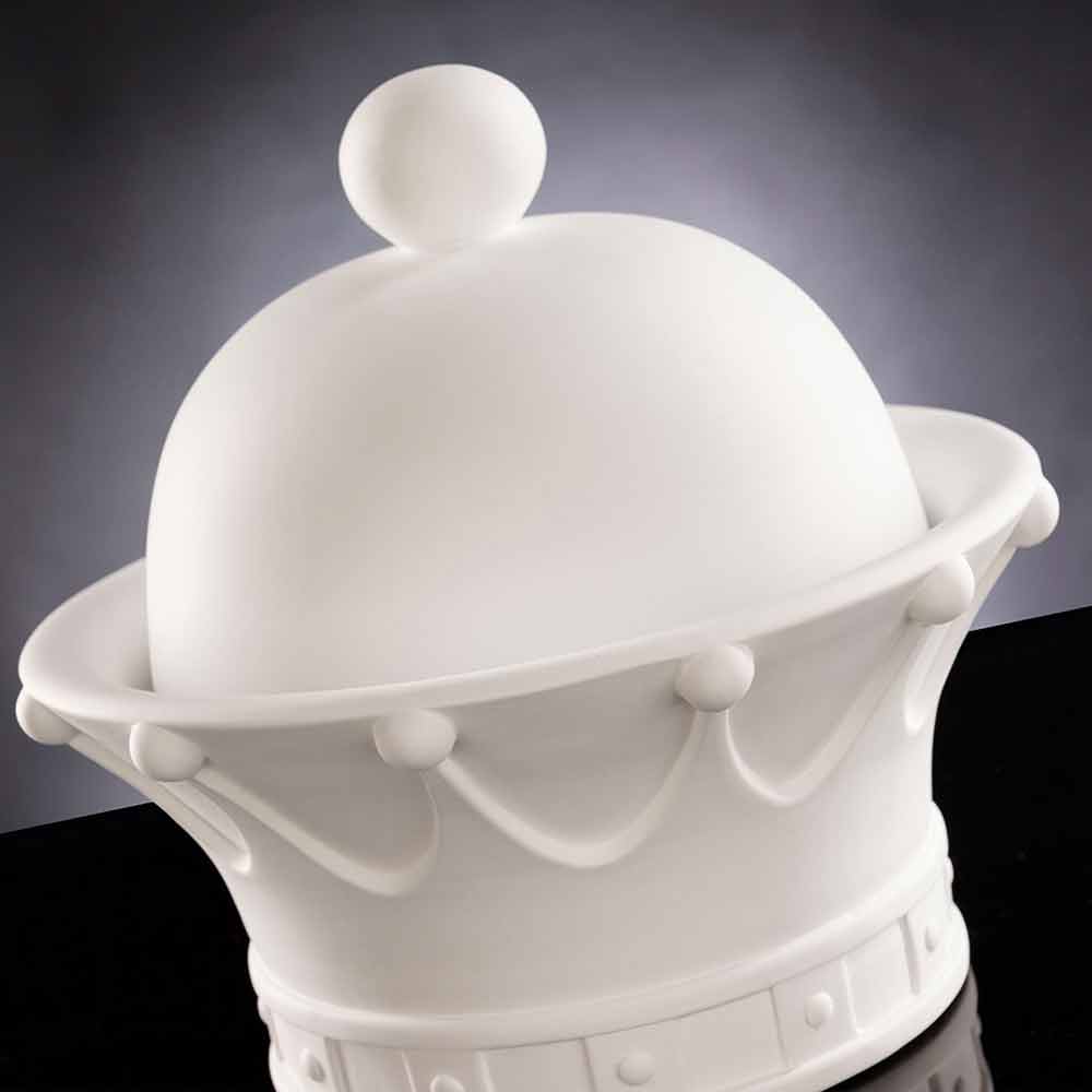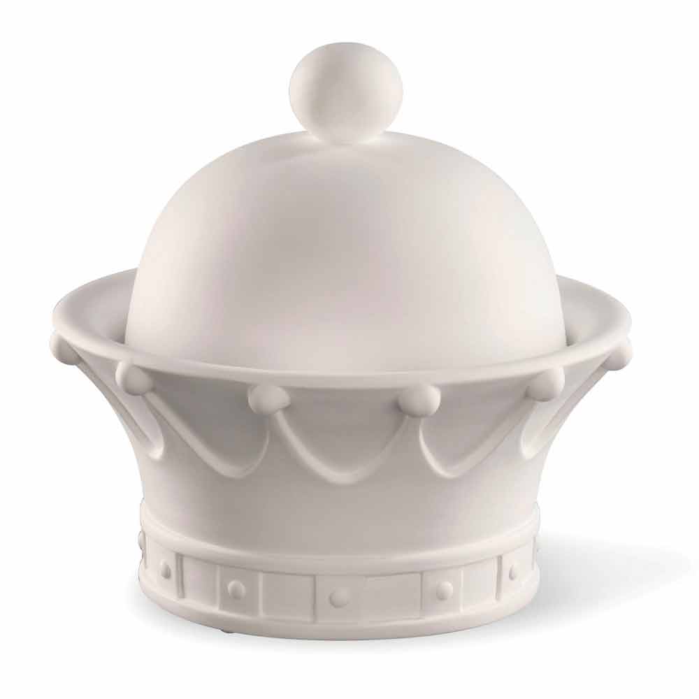 Zbukurim dekorativ në formën e kurorës së një mbretëreshe hapëse të punuar me dorë në Itali në qeramikë të bardhë . Një zbukurim i çuditshëm dhe elegant në të njëjtën kohë i aftë të kompletojë orenditë përreth duke krijuar një harmoni të mrekullueshme që mishëron modernizmin dhe dizajnin . Forma e saj origjinale dhe krijuese është ideale për ata që duan të pasurojnë hapësirat e tyre shtëpiake me elementë të karakterizuar nga një shpirt origjinal dhe unik ndërsa ofron një hapësirë të vogël në të cilën të mbërthehen dhe të organizohen disa objekte falë ndarjes praktike të pozicionuar nën kapak.