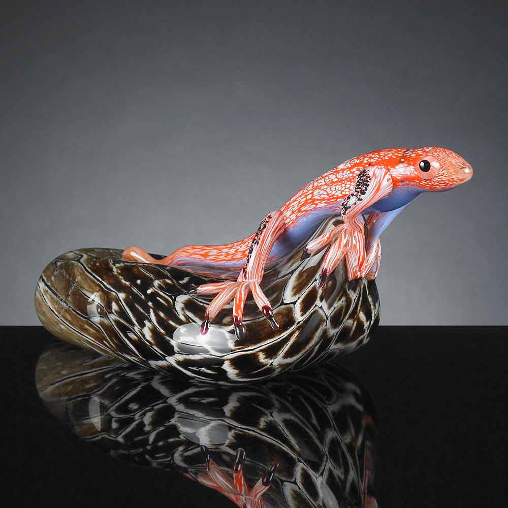 Statujë dekorative në formën e hardhucës në një gur të bërë në Itali në xham me ngjyrë . Një aksesor mobilimi me elegancë të brendshme që kombinon rafinimin e përjetshëm të xhamit me ngjyra të ndritshme dhe të gjalla që i japin produktit një prekje origjinale dhe nënvizojnë vlerën dhe vlerën e tij. Përfundimet e mrekullueshme dhe format e reja dhe krijuese pasurojnë këtë zbukurim duke e lejuar atë të provojë të jetë një zgjidhje e përkryer për ata që kërkojnë një stil krijues dhe të çuditshëm për shtëpinë e tyre i përshtatshëm për t'i dhënë jetë atmosferave ekskluzive .