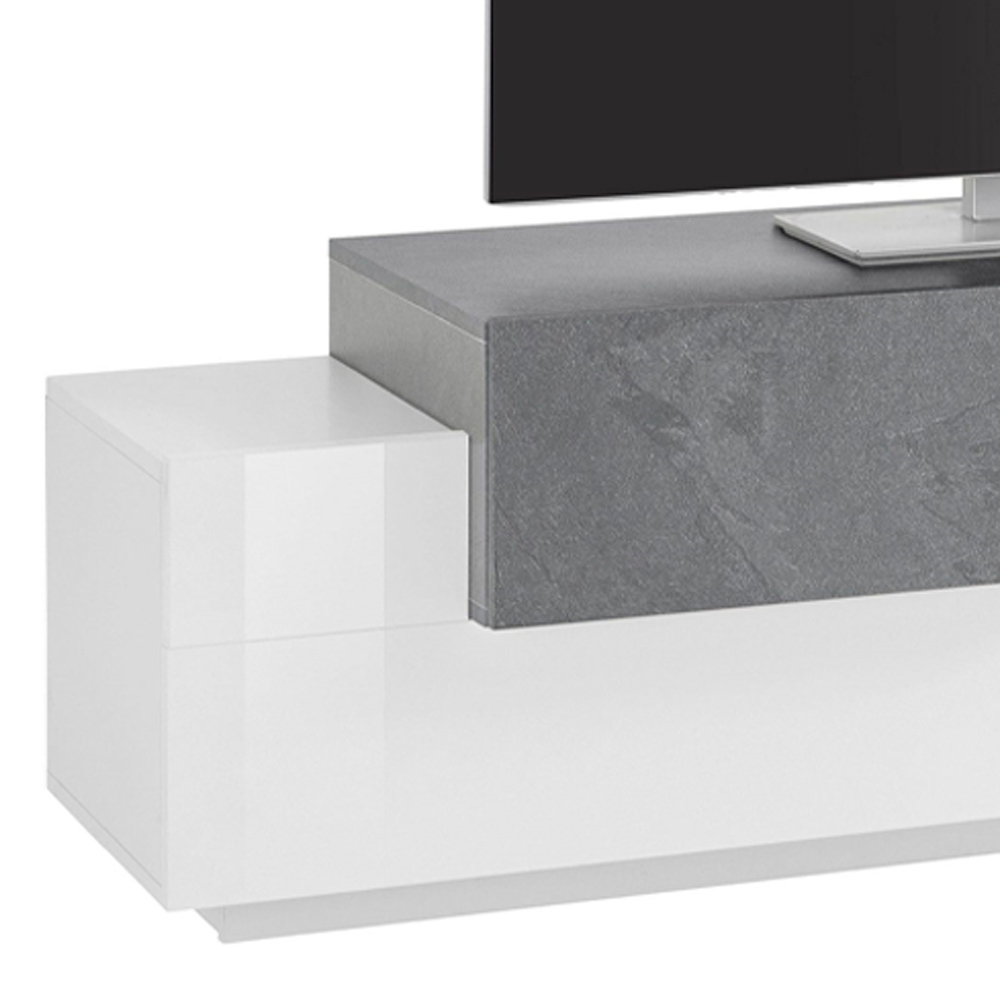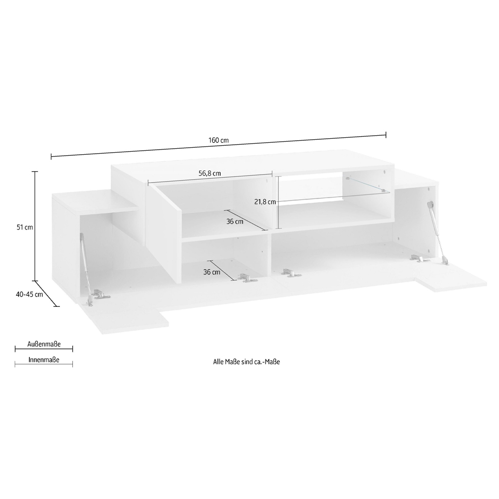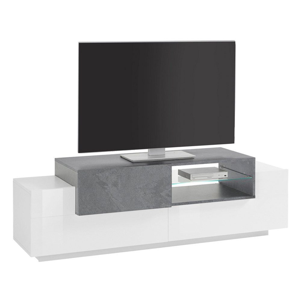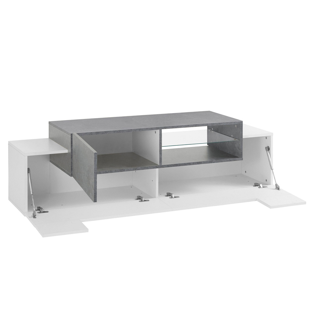 Kabineti i ulët i televizorit për dhomën e ndenjes përbëhet nga 2 dyer anësore me kapak të bëra prej druri me llak të bardhë me shkëlqim dhe 1 derë me varëse prej druri melamine të disponueshme në dy përfundime me një ndarje qendrore të hapur me një raft xhami. Dizajni i krijuar në këtë mënyrë paraqet një kontrast sugjestionues dhe bashkëkohor për t'u vendosur në zonën e ndenjes.