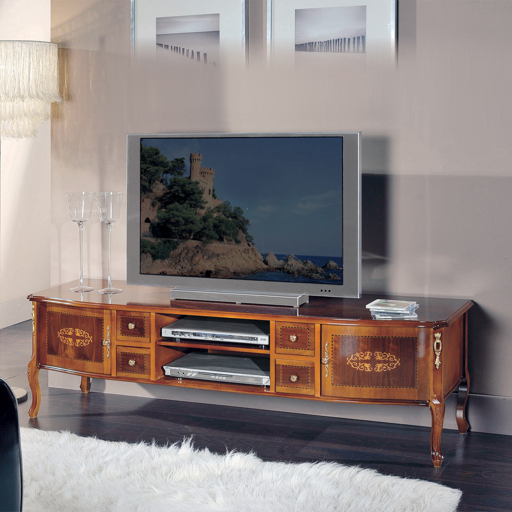 Kjo mbajtëse televizori, ideale për të mobiluar dhomën e ndenjes me një prekje stili klasik , është punuar nga arre e lëmuar me zbukurime elegante ari. I disponueshëm me 2 dyer dhe 4 sirtarë e ndarje, ose me 2 dyer e ndarje. Unik dhe i rafinuar, është prodhuar tërësisht në Itali dhe i punuar me dorë nga mjeshtra të aftë , i përfunduar me aftësi dhe shije elegance. Prodhimi kryhet duke përdorur materiale me cilësi të lartë , dhe puna kryhet medorë me kujdesin dhe profesionalizmin maksimal që dallon produktet Made in Italy .