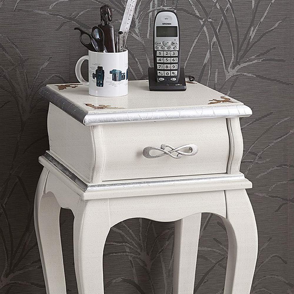 Tavolinë telefonike luksoze e dhomës së ndenjes, prej druri të çmuar, e disponueshme në dekorime arre ose të bardhë dhe argjendi. Unik dhe i rafinuar, është bërë tërësisht në Itali nga mjeshtra të aftë , i përfunduar me mençuri dhe shije për elegancë. Prodhimi kryhet duke përdorur materiale të shkëlqyera , dhe duke kryer punënmedorë me kujdesin dhe profesionalizmin maksimal që i dallon produktet Made in Italy .