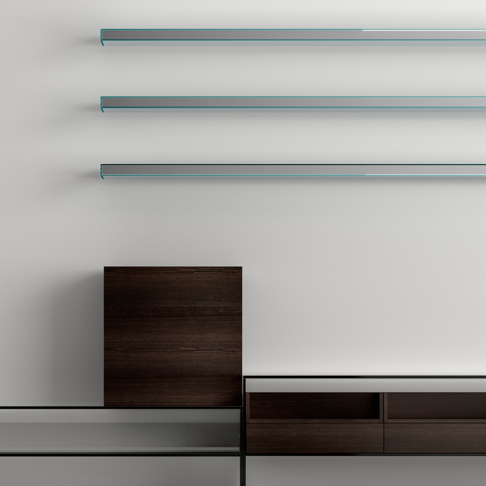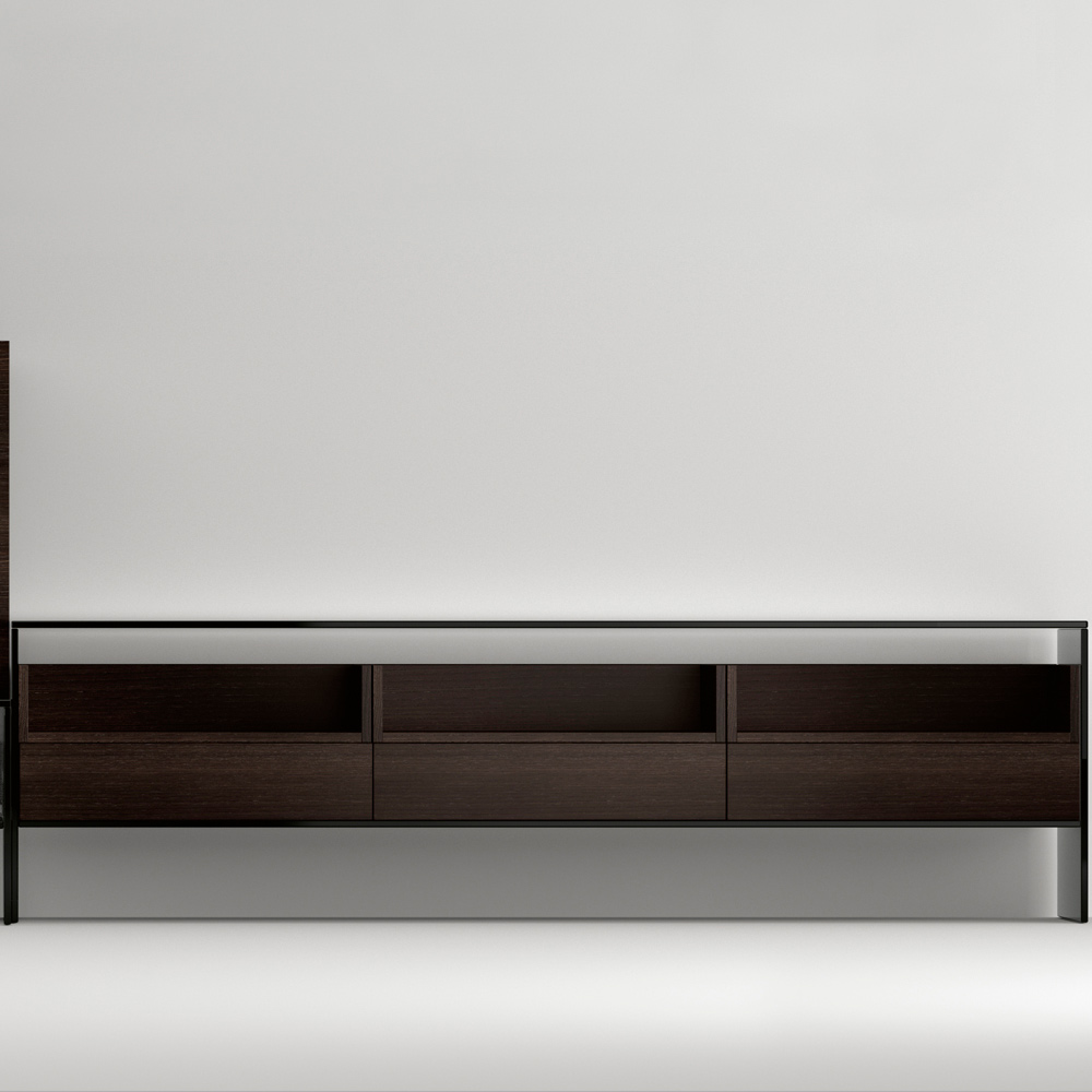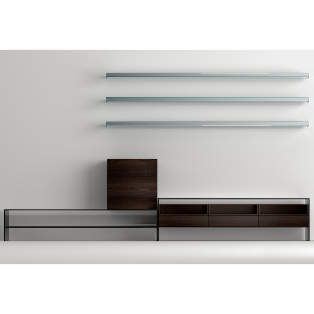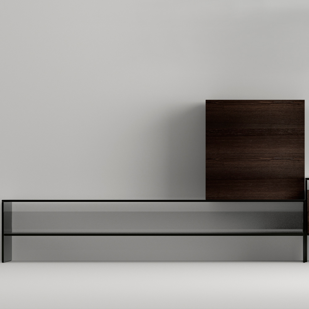 Kabineti i televizorit i përbërë nga: 3 rafte të mbuluara me pasqyrë të tymosur, 1 element modular në xham të tymosur të salduar me një enë të varur nga druri i mbarimit të hirit siberian sipër me një raft xhami të brendshëm, 1 element modular në xhami të salduar të tymosur me 3 sirtarë dhe 3 të hapur ndarje në dru siberian të hirit. Një interpretim i ri i sistemit të ditës që e bën butësinë e xhamit cilësinë e tij kryesore. Kompozimi mund të dizajnohet në liri të plotë për t'iu përshtatur më së miri çdo nevoje dhe stili arredimi.