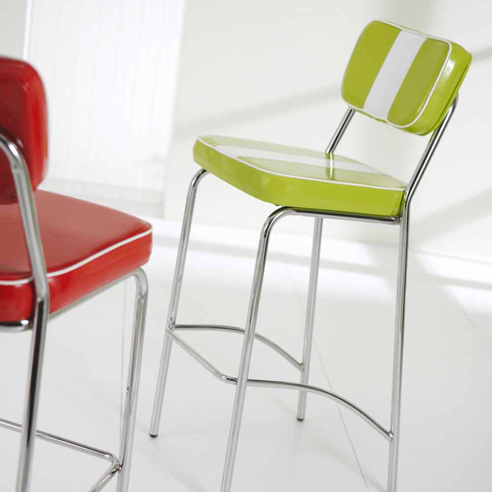 Stool i stilit të viteve 50 me tapiceri lëkure grafiti dhe strukturë të kromuar.