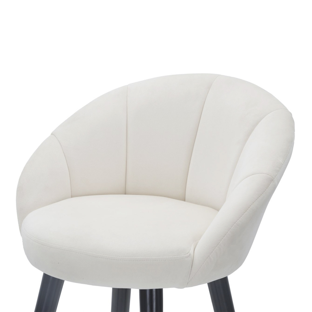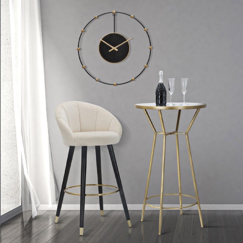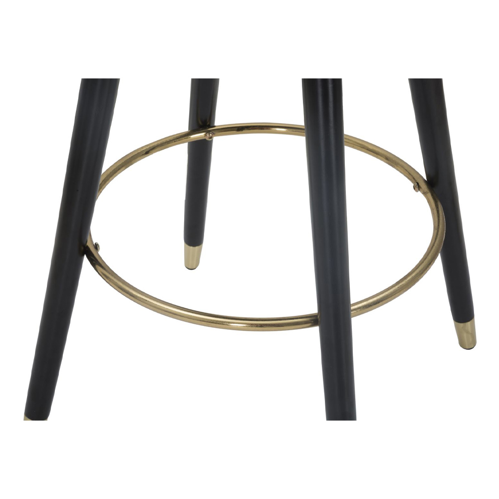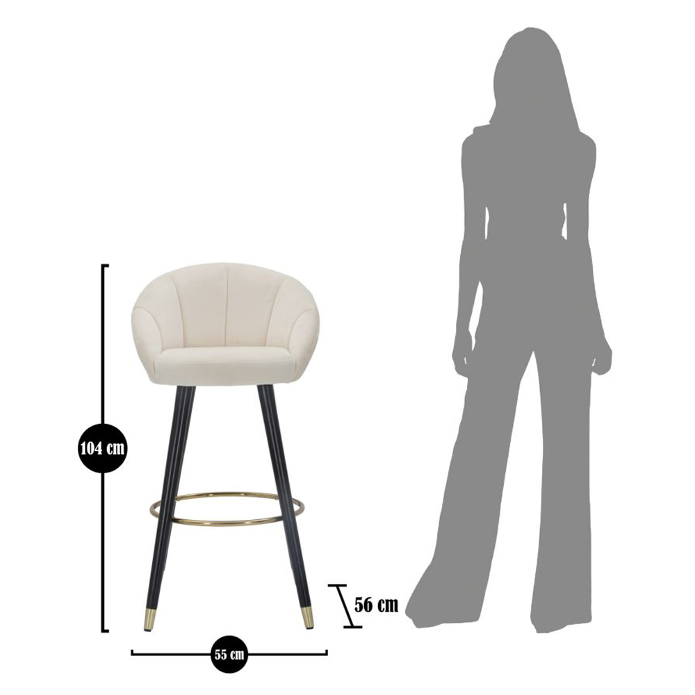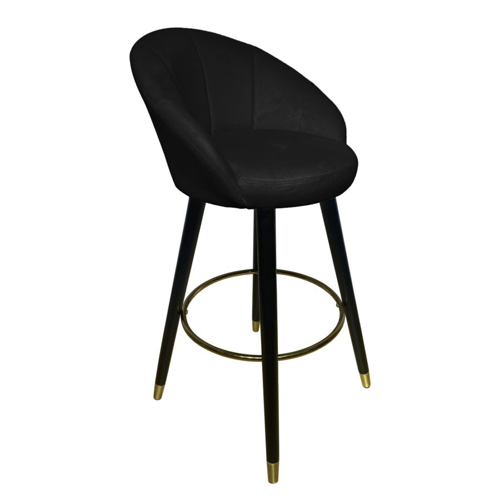 Stol me bar të lartë me strukturë prej druri të lyer me ngjyrë të zezë me detaje prej ari të përfunduar dhe sedilje të veshur me susta të veshura me pëlhurë. Dizajni i tij është kompletuar dhe bërë edhe më funksional me mbështetësen praktike të këmbëve ndërsa forma e rrumbullakosur e shpinës siguron një vend mikpritës dhe veçanërisht të rehatshëm . Kombinimi i përfundimeve të zgjedhura pasuron estetikën tashmë elegante të produktit me një prekje ekskluzive dhe të rafinuar, ideale për mobilimin me shije dhe stil të hapësirave shtëpiake ose të kontraktuara me një estetikë bashkëkohore.