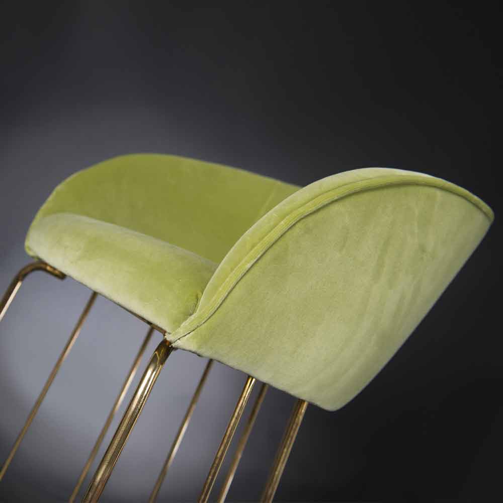 Karrige e lartë ideale për sportelet e barit ose kuzhinës të prodhuara tërësisht në Itali me strukturë metalike prej ari 24k të përfunduar, sedilje të veshur me susta dhe shpinë të veshur me kadife të gjelbër. Një ide e mobiljeve elegante e karakterizuar nga përdorimi i linjave dhe formave të thjeshta të afta për t'i dhënë jetë një komplementi me një estetikë të stilit të lartë dhe veçanërisht moderne që arrin të revolucionarizojë çdo zonë jetese ose hapësirë të kontraktuar falë një prekje bashkëkohore dhe origjinale . Ajo që e dallon dizajnin është një stil i rafinuar së bashku me një anë të fortë funksionale të marrë përmes një përpunimi 100% Made in Italy dhe përdorimit të lëndëve të para cilësore që sigurojnë një produkt me cilësi dhe vlerë të lartë . Estetika e tij ekskluzive përshtatet me çdo situatë stilistike duke krijuar një harmoni perfekte me elementët që e rrethojnë për një rezultat krijues dhe avangard.