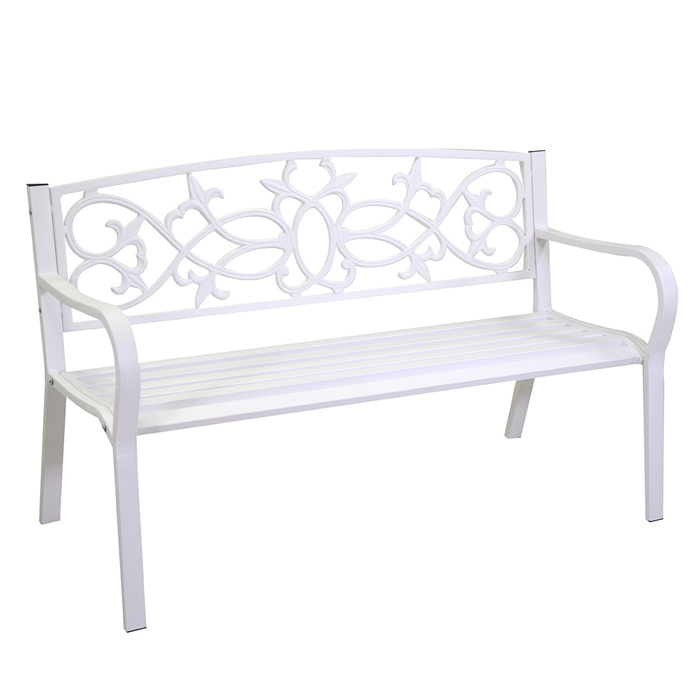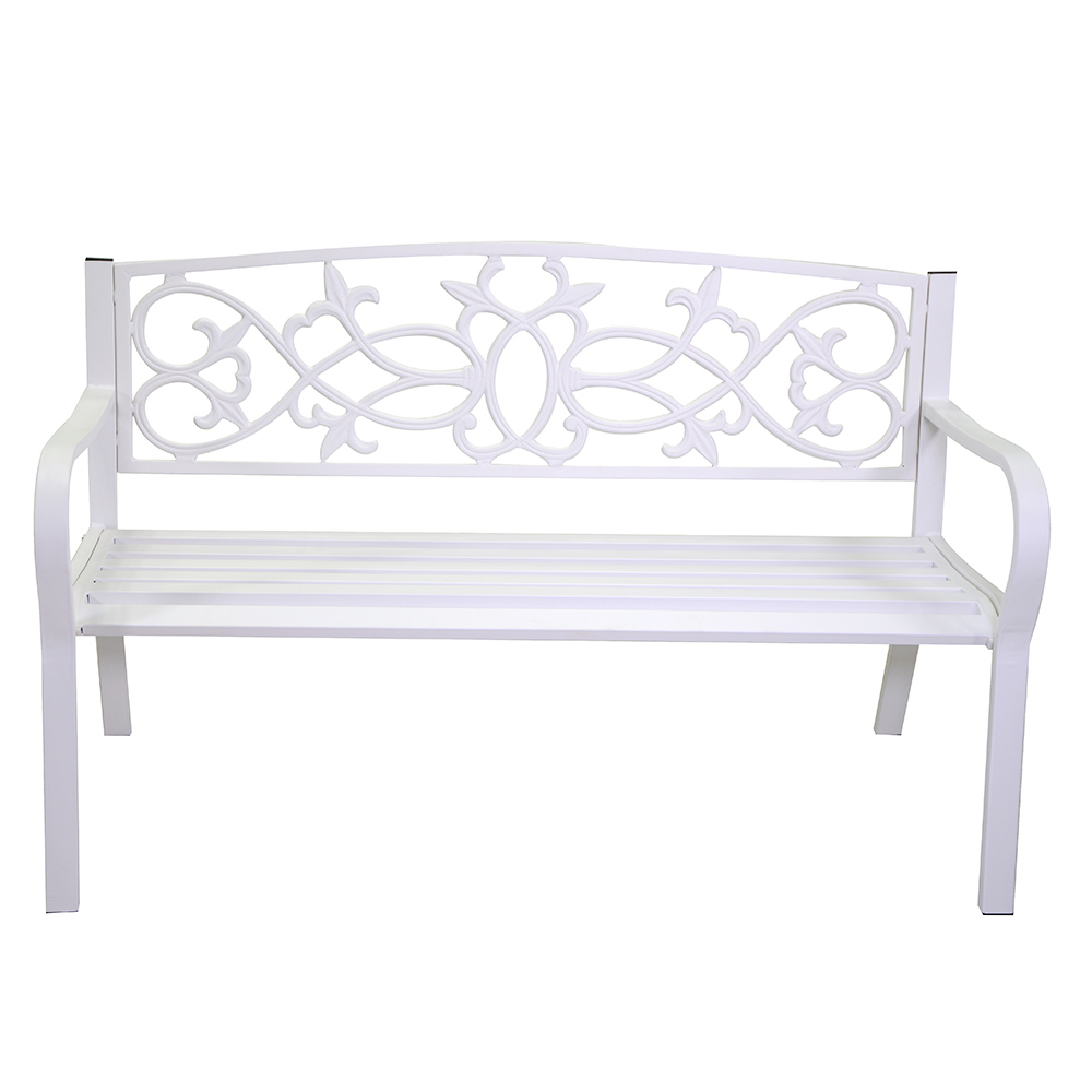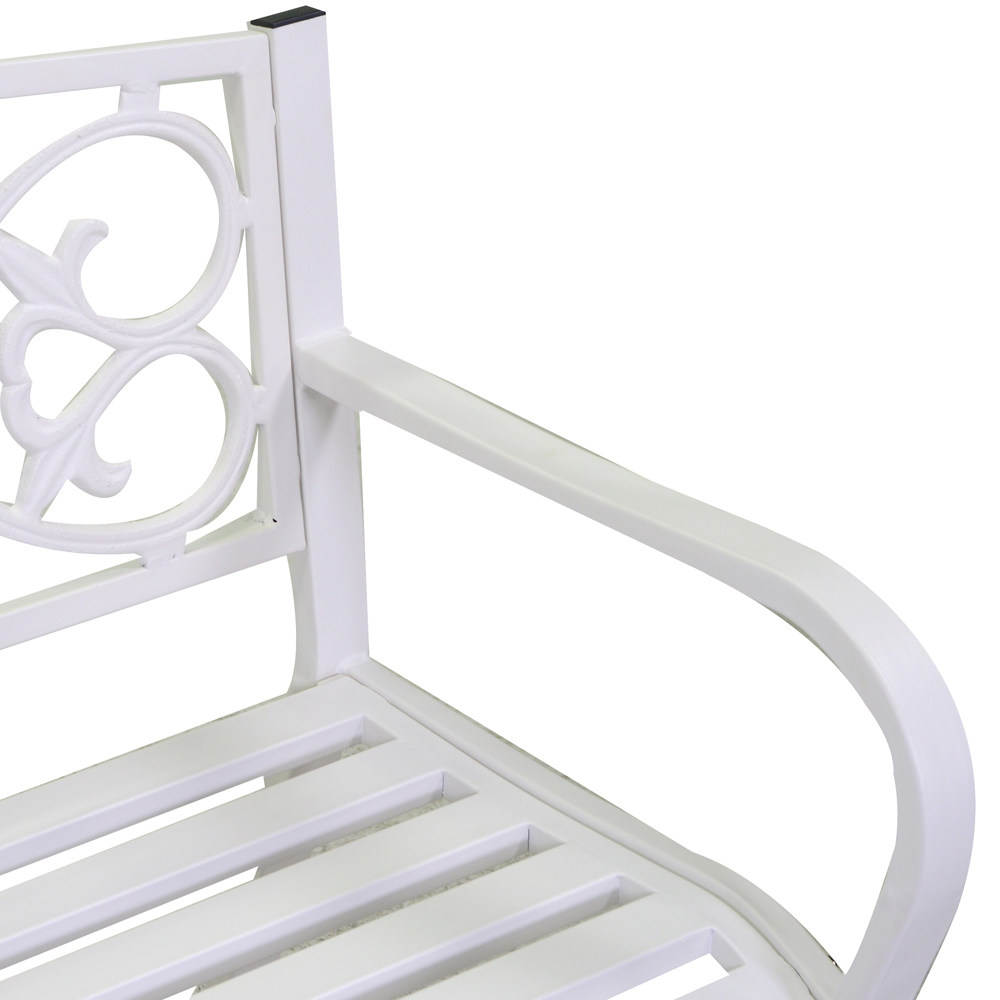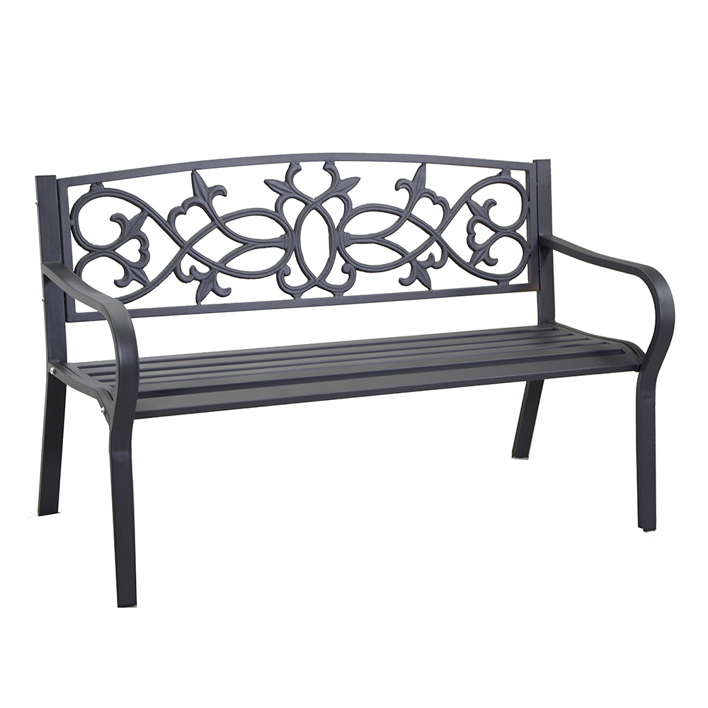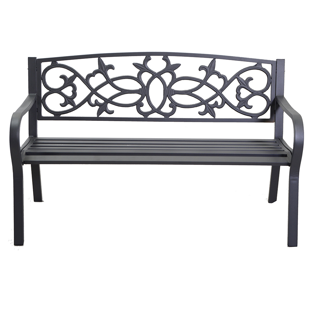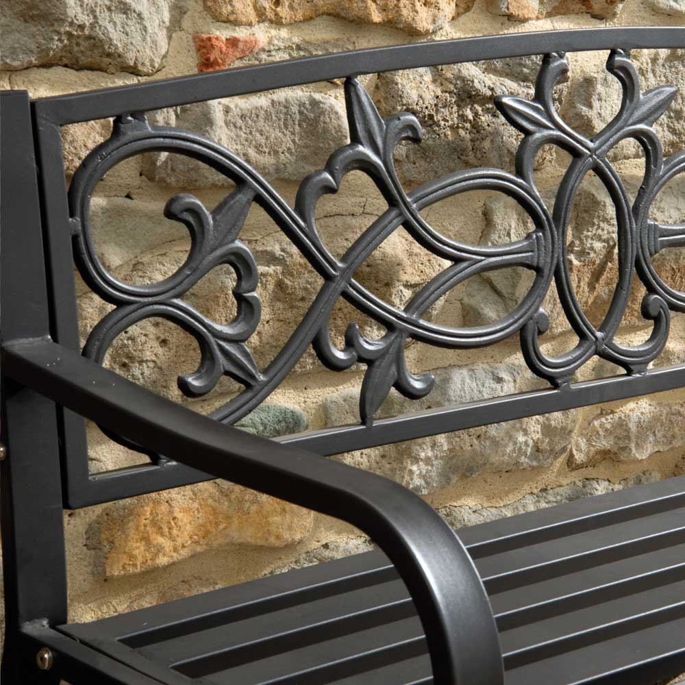 Detajet zbukuruese në anën e pasme kombinojnë motive klasike me një prekje moderne, duke krijuar një pikë qendrore tërheqëse vizualisht. I krijuar nga metali i qëndrueshëm , ky stol është projektuar që të qëndrojë, t'i rezistojë elementëve dhe të ruajë bukurinë e tij estetike pa kërkuar mirëmbajtje të tepërt.
