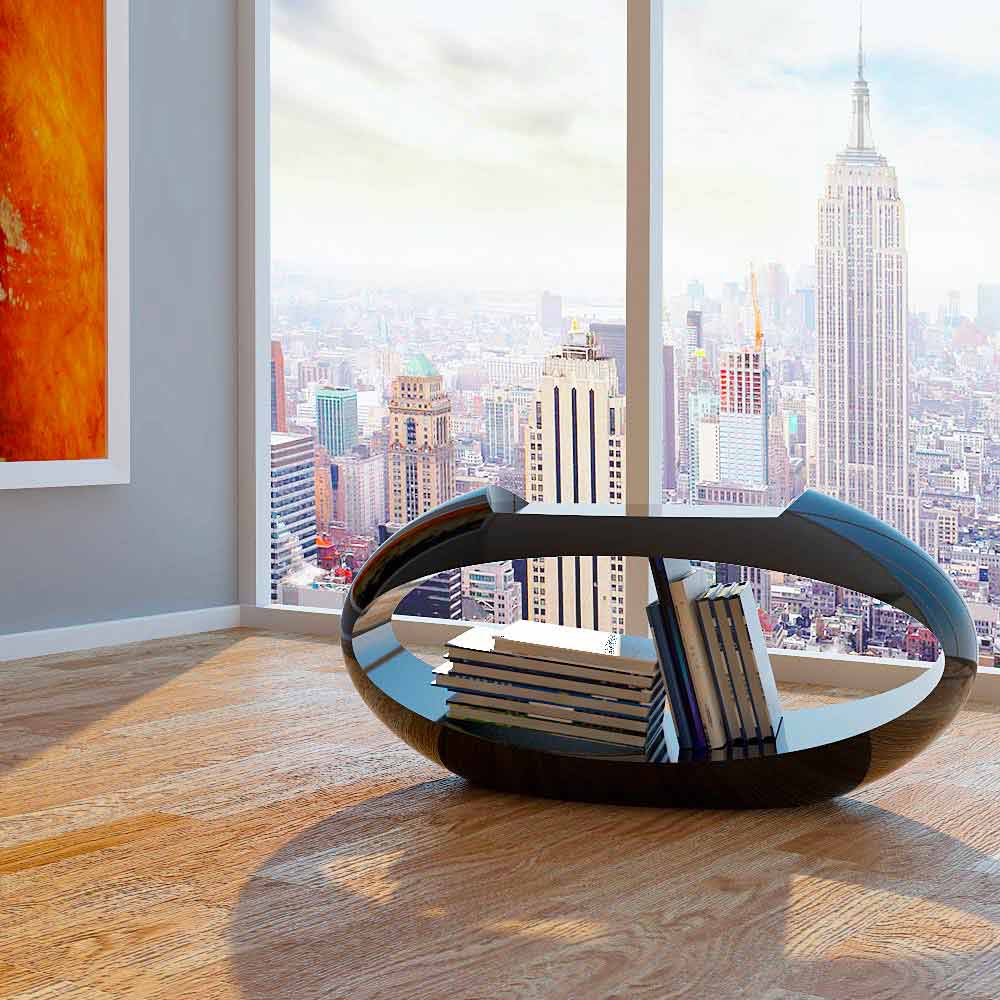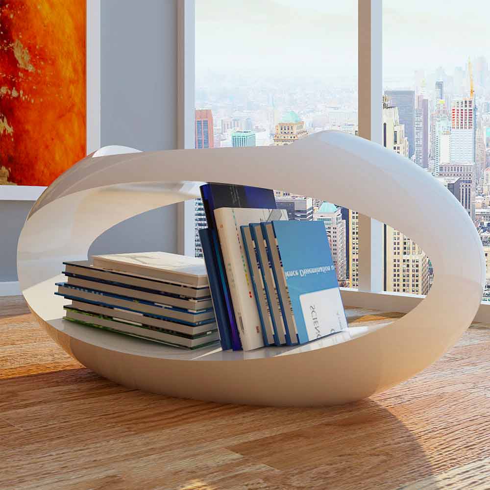 Karrige dizenjoje me raft librash të integruar Ellix prodhuar në Itali Materiali : Sipërfaqja e ngurtë; Finish : Shkëlqim / mat i disponueshëm në variacione të ndryshme kromatike Projektuesi : Luca Degano Përmasat : L. 80 x D. 34 x H. 39 cm Pesha : 5 kg