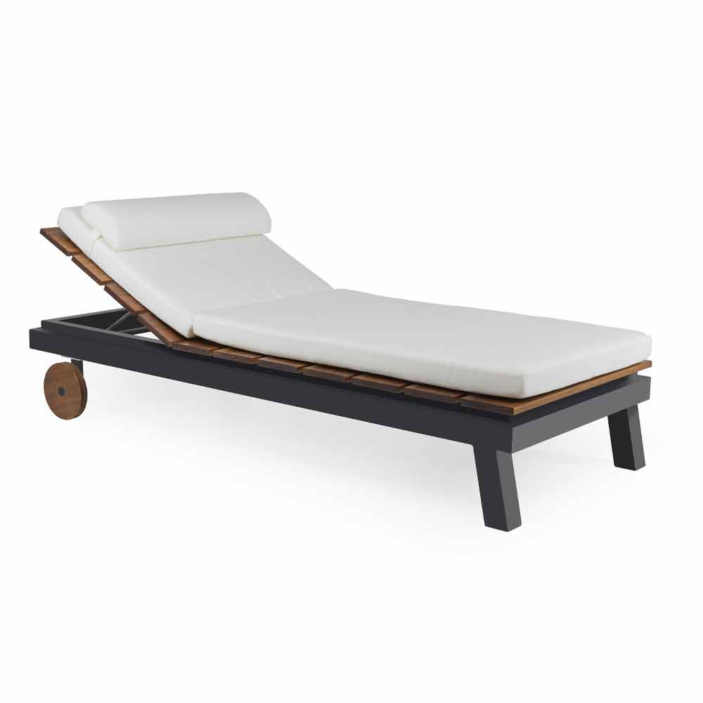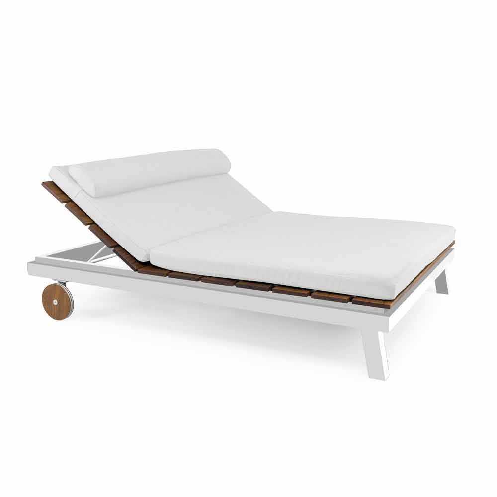 Lounger kopsht me dizajn të vetëm ose të dyfishtë në alumin të bardhë ose të zi, pllaka druri dhe rrota dhe jastëk.