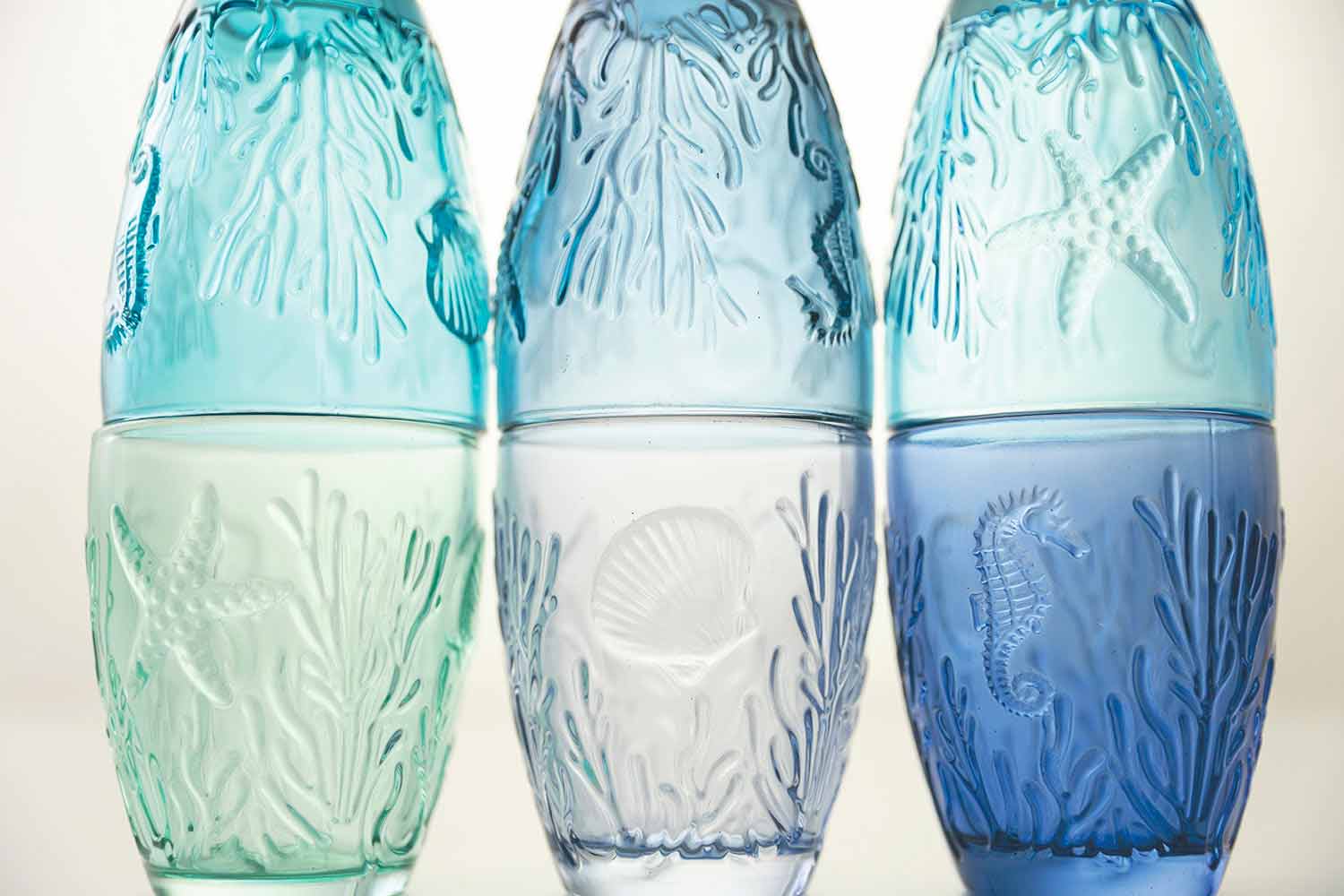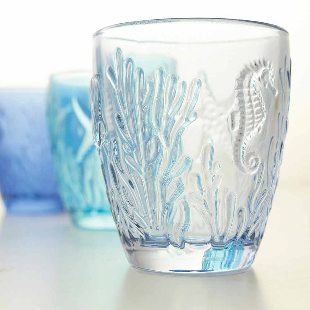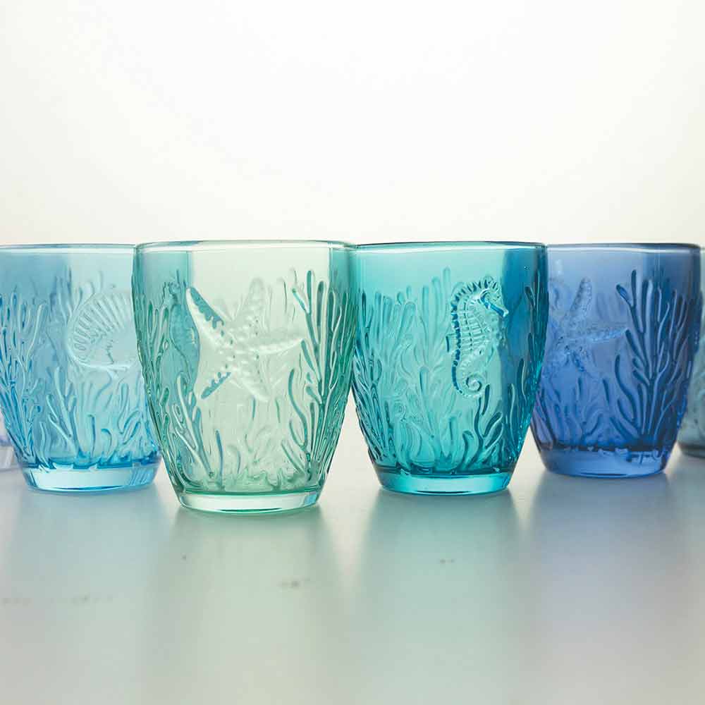 Shtë një shërbim i syzeve që jo vetëm që frymëzohet nga deti , por e merr atë përsëri në tërësinë e tij, duke rikonstruktuar në sipërfaqen e jashtme të syzeve bukurinë e tij të thjeshtë dhe të pa kontaminuar: yll deti, predhat, algat dhe koralet janë gdhendur imët për të krijuar një efekt xhevahire fine dhe i rafinuar. Një bukuri e përjetshme e aftë për të magjepsur darkat me nuancat e saj të freskëta nga ujiblu në jeshil që bëhen protagonistët e tryezës, duke përhapur një atmosferë relaksuese dhe detare në mjedis. Materiali luan një rol vendimtar: transparenca e qelqit është e kombinuar me konceptin e ujit kristal të pastër të detit.
