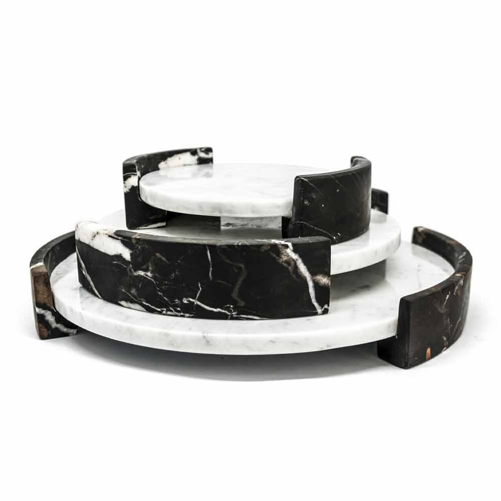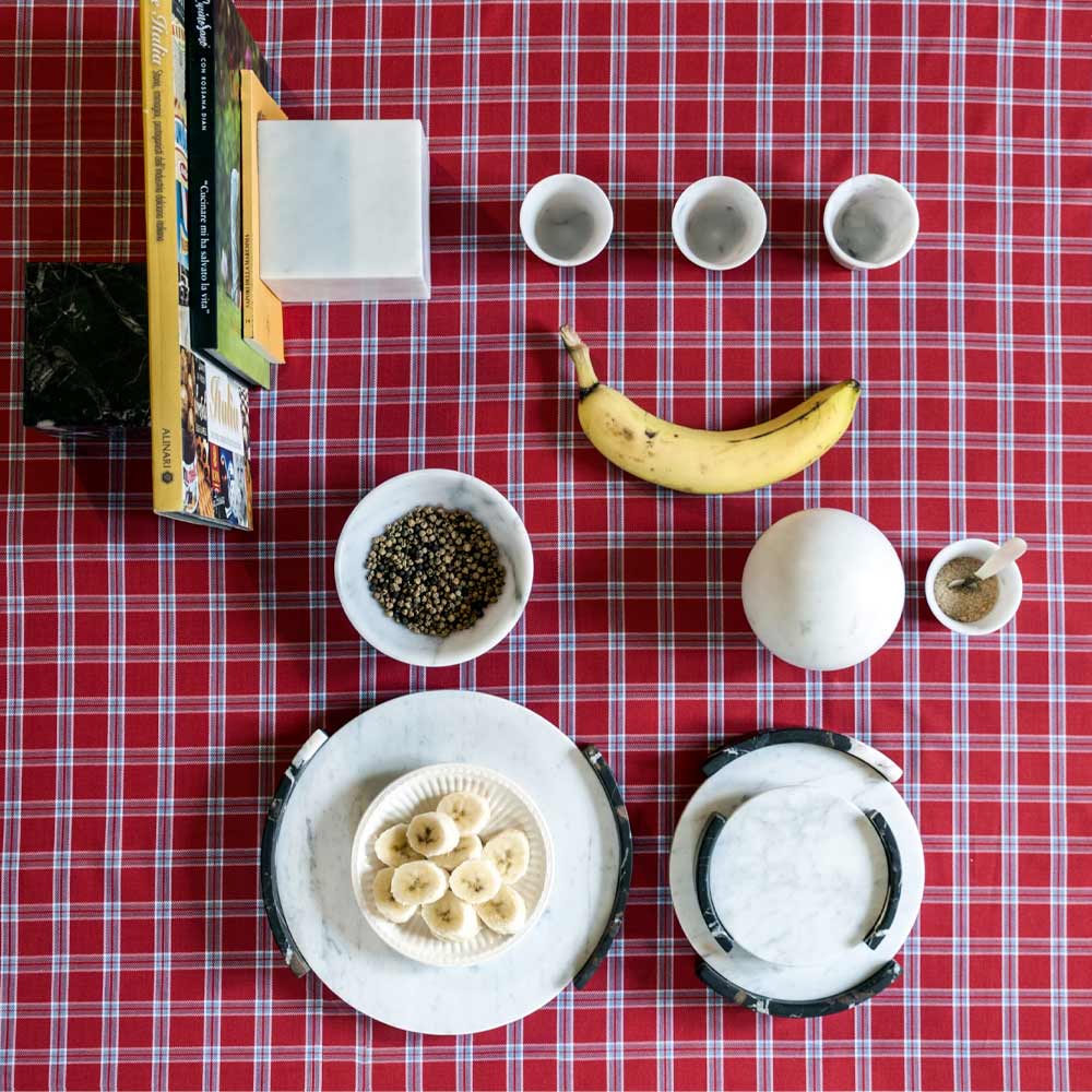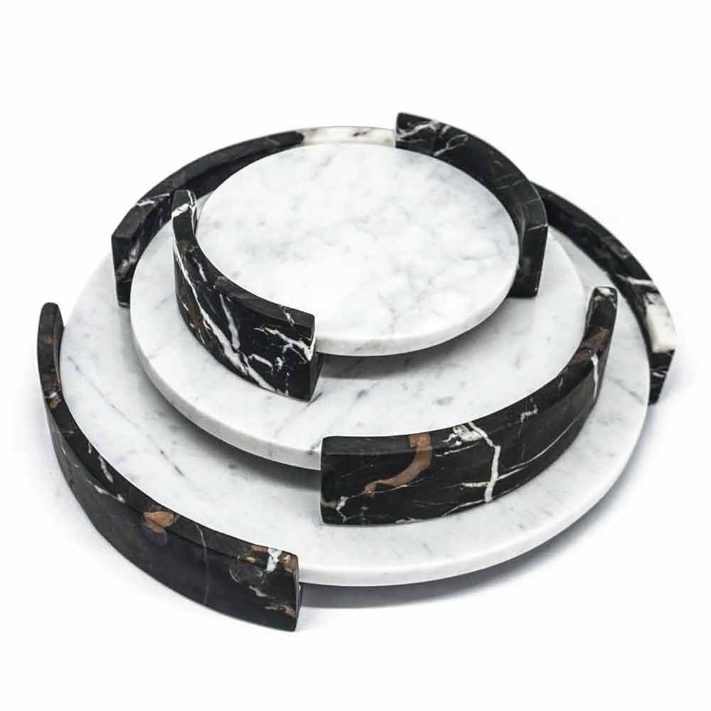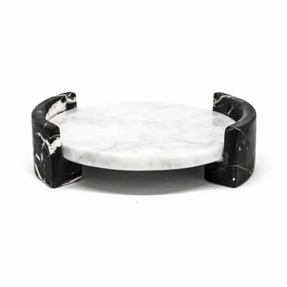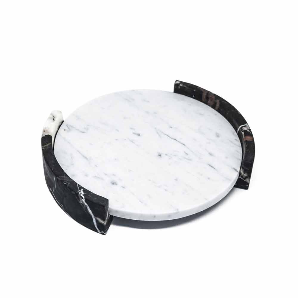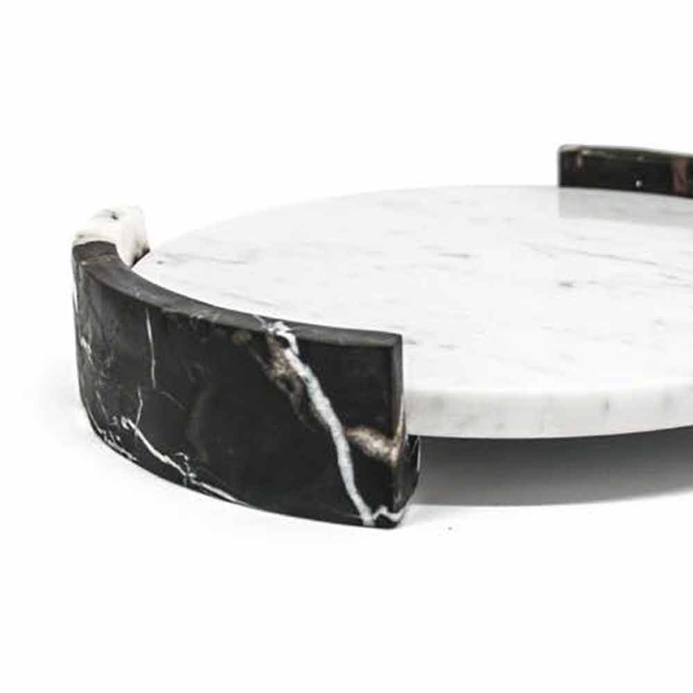 Tabaka e rrumbullakëtprej mermeri të bardhë Carrara. Isshtë një copëunike pasi çdo bllok mermeri është i ndryshëm në damarë dhe hije. Mermeri i përdorur për realizimin e produktit vjen nga gurorja Poggio Silvestre e cila është një burim i mermerit të bardhë të cilësisë së parë të klasifikuar që nga shekulli i kaluar. Produkt i bërë me dorë nga artizanët italianë të specializuar për breza në përpunimin e mermerit. Pikërisht për këtë arsye, çdo ndryshim në formë dhe ngjyrë duhet të konsiderohet si një garanci e mjeshtërisë.