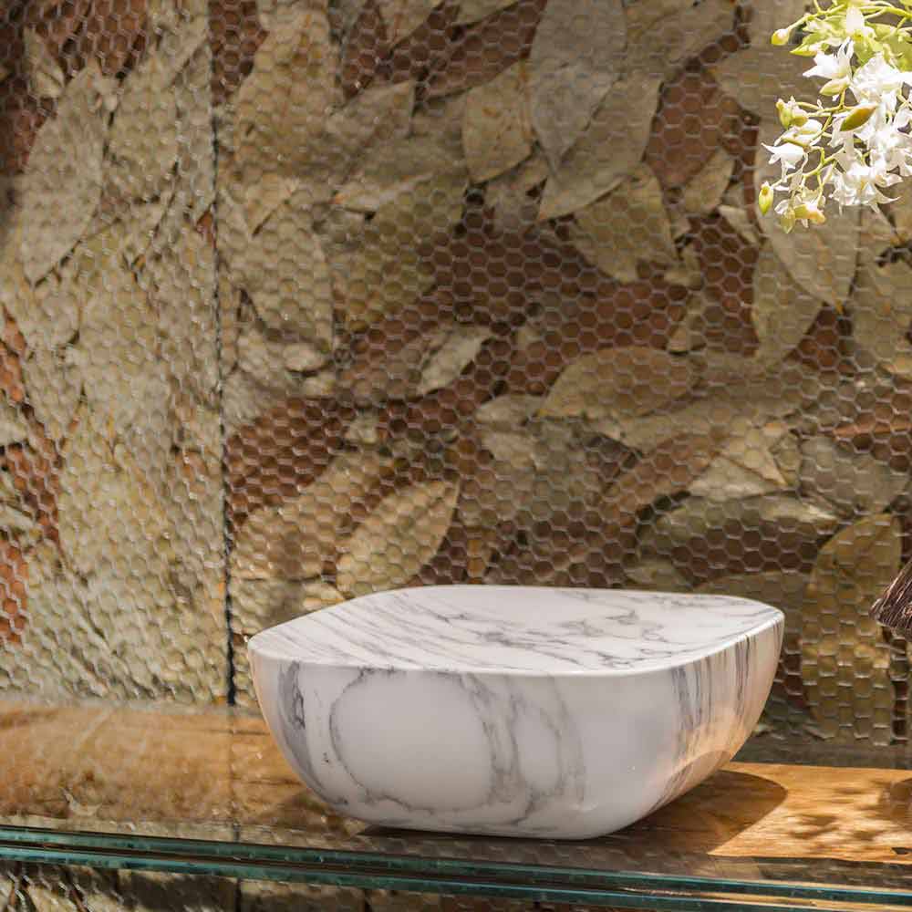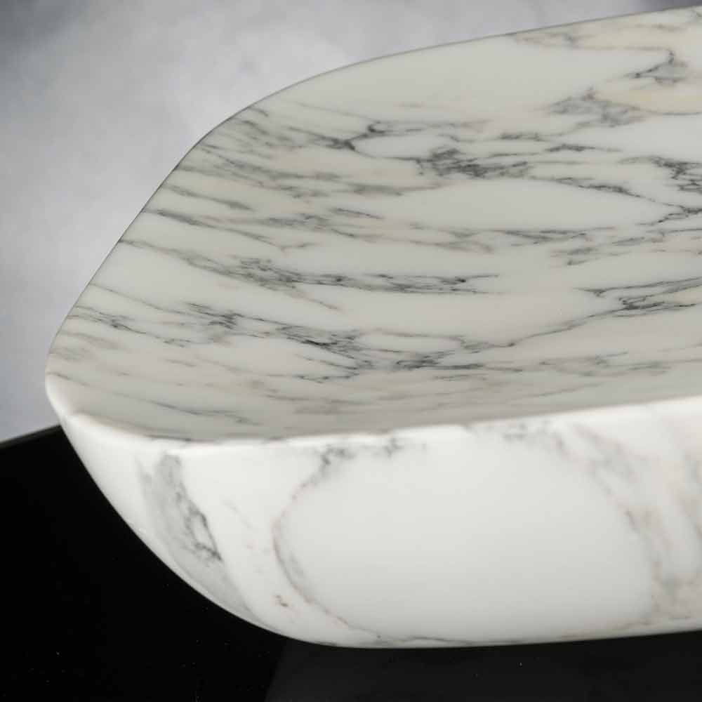 Prodhuar në Itali tabaka dekorativenë mermer të bardhë Carrrara , një larmi e çmuar mermeri që bëhet përmes përpunimit të gurëve natyrorë lejon marrjen e formave më komplekse. Një objekt i elegancës së brendshme që lind nga takimi midis studimit të fenomeneve natyrore dhe bashkëveprimit të materialeve të ndryshme me teknologjitë e përdorura nga njeriu. Rezultati është një mobilje esofistikuar dhe e gjithanshme e cila lejon që ajo të përdoret si një tabaka e vërtetë, si një pjesë qendrore e rafinuar, por edhe si një zbrazës xhepi nëse pozicionohet në hyrje ose si një element i thjeshtë dekorativ në çdo vend të shtëpisë, të aftë për t’i dhënë një prekje shtesë mobiljeve falë elegancës së përjetshme të mermerit dhe venave të saj të mrekullueshme.