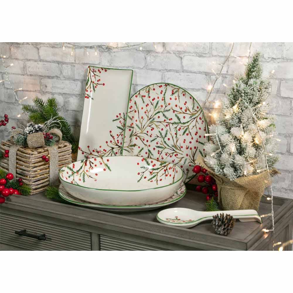 Dekoroni shtëpinë tuaj dhe tryezën tuaj me stilin natyror të pjatave të darkës ovale të Krishtlindjesnë porcelani me dekorimet tipike të Krishtlindjeve të zgjedhura nga degëzat e shenjta të kombinuara me të kuqe, simboli i par Krishtlindjes ose manaferrat e shenjta të kombinuara me rafinimin e materialit , e cila do të ndihmojë për të sjellë një prekje të magjisë dhe për ta bërë misin në vend të thjeshtë dhe elegant.