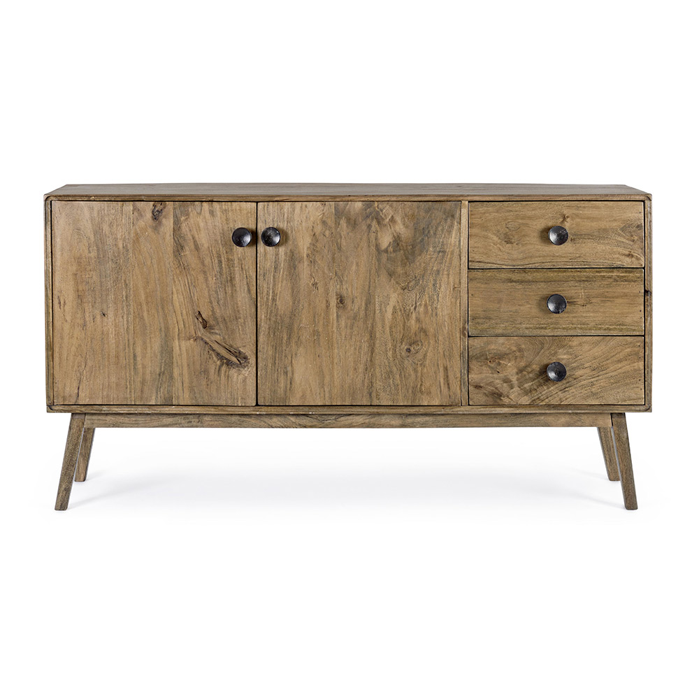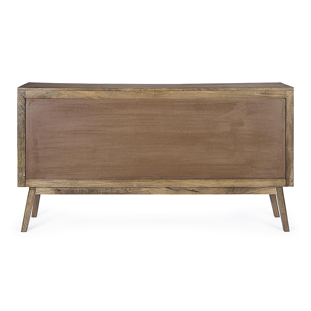 Ky bufe me dizajn për dhomën e ndenjes ka një strukturë dhe këmbë për t'u montuar në dru mango me një përfundim me bazë uji dhe mbrapa në MDF. Ndarja përfshin një raft dhe pullat janë prej çeliku. Rezultati është një aksesor vintage me një shijeetnike.