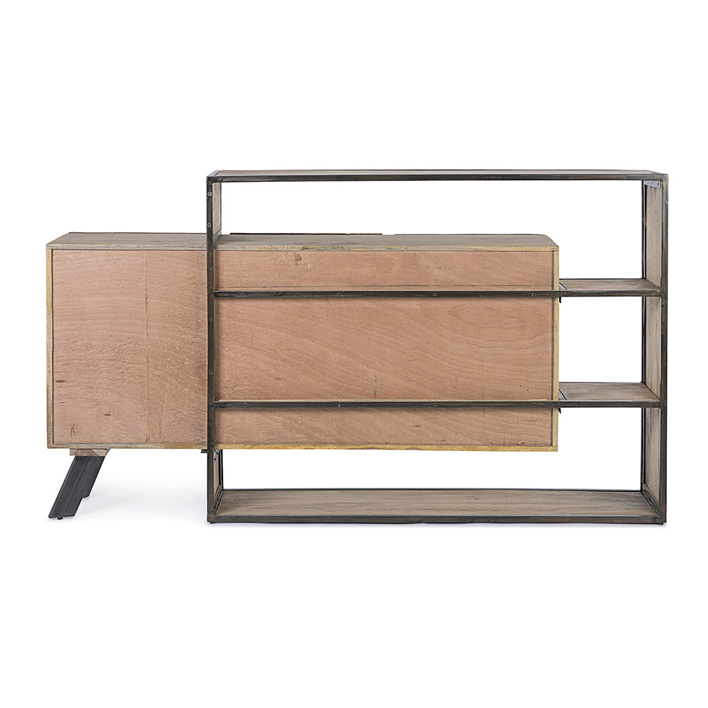 Ky bufe me dizajn për dhomën e ndenjes ka një strukturë prej druri mango dhe çeliku me një mbrapa kompensatë.