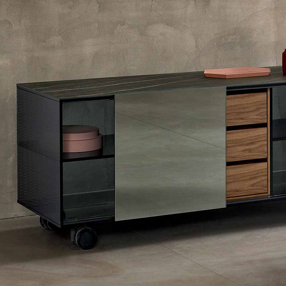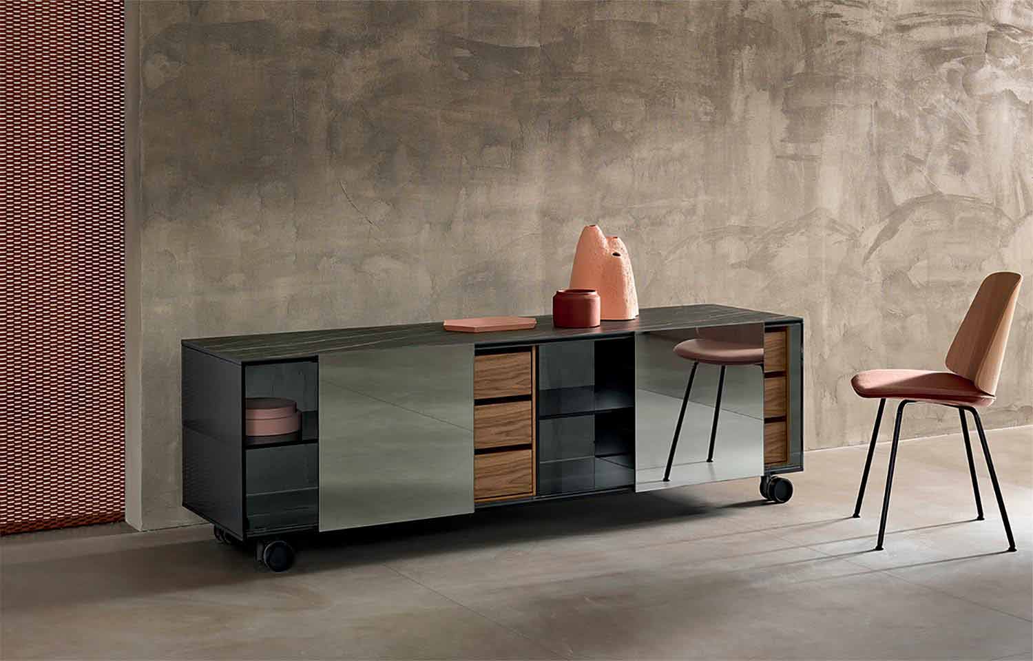 Skoca e dhomës së ndenjes Scocca realizohet me dorë në Itali me materiale me cilësi të lartë. Ajo është e përbërë nga një strukturë në xhami smokey në rrota dhe dy dyer rrëshqitëse të pasqyrës smokey.Matt Noir Desir maja qeramike . Për një funksionalitet më të lartë, Skoka gjithashtu ka dy sirtarë kanellë me rimeso , brenda.