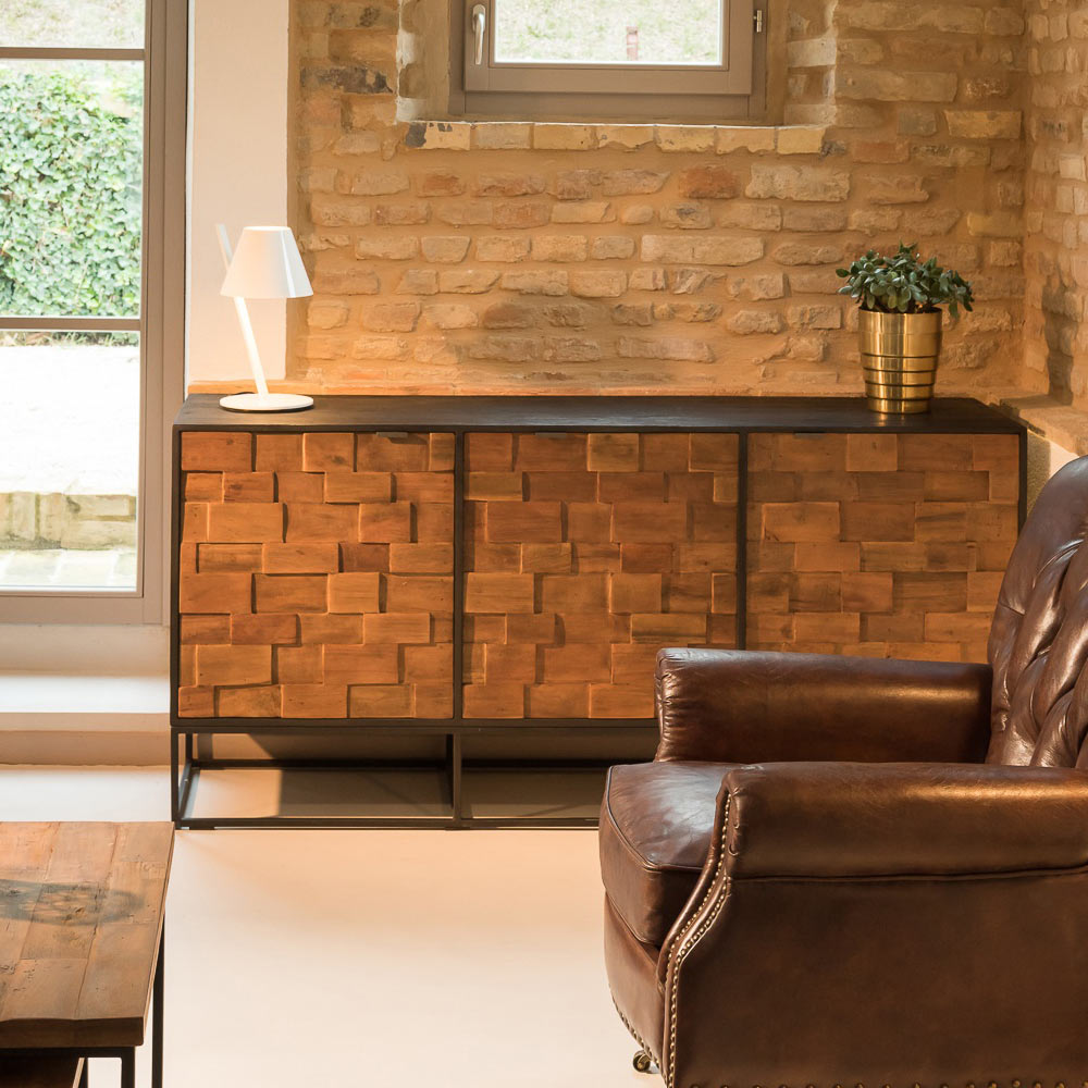 Bufe e brendshme prej druri të ricikluar me ngjyrë kafeje natyrale me 3 dyer të përparme prej druri lara-lara dhe trup në metal të zi të krehur. Ky grup mobilimi është fjalë për fjalë unik pikërisht sepse mishëron historinë e veçantë të materies së jetuar. Përpunimi bëhet në pjesën më të madhe sipas procedurave artizanale . Çdo gërvishtje dhe papërsosmëri, çdo mbresë në dru, dëshmon origjinalitetin e një të shkuare që merr jetë të re. Druri tropikal i ricikluar ligjërisht nga objektet e vjetra, varkat dhe ndërtesat e braktisura trajtohet dhe pastrohet me mjeshtëri për të rifituar dinjitetin dhe shkëlqimin. Ky produkt kombinon thelbin e shijes rustike me format e dizajnit bashkëkohor dhe me disa detaje të stilit industrial .