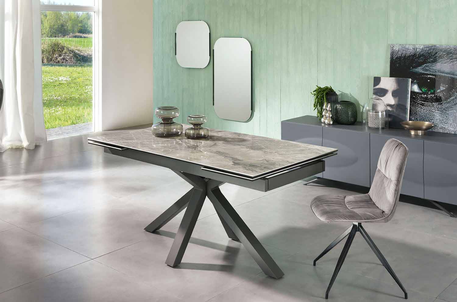 Laryssa është një tryezë ngrënie e karakterizuar nga përdorimi i materialeve inovative dhe rezistente që e bëjnë atë një tryezë perfekte për dhomën e ngrënies apo kuzhinën, duke ndërthurur bukurinë dhe praktikën, duke lejuar kështu përdorimin optimal dhe njëkohësisht duke i dhënë stil çdo mjedisi. Tabela është bërë me një strukturë metalike të pikturuar me antracit dhe një majë qeramike në xham të zbutur, gjithashtu me ngjyrë antracit, gjë që e bën tryezën të fortë dhe rezistente. Zgjatimet janë brenda tryezës dhe janë bërë gjithashtu prej qeramike në xham me ngjyrë antracit.