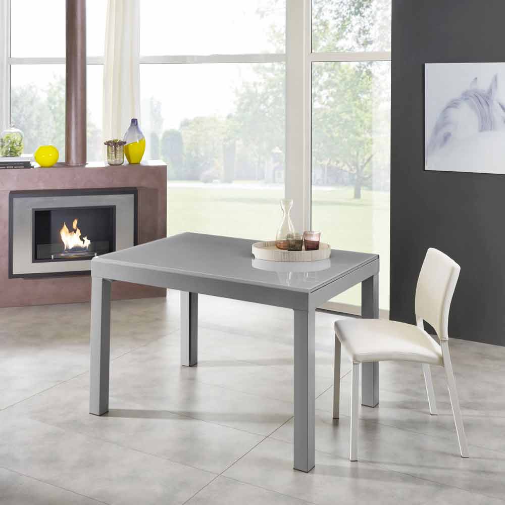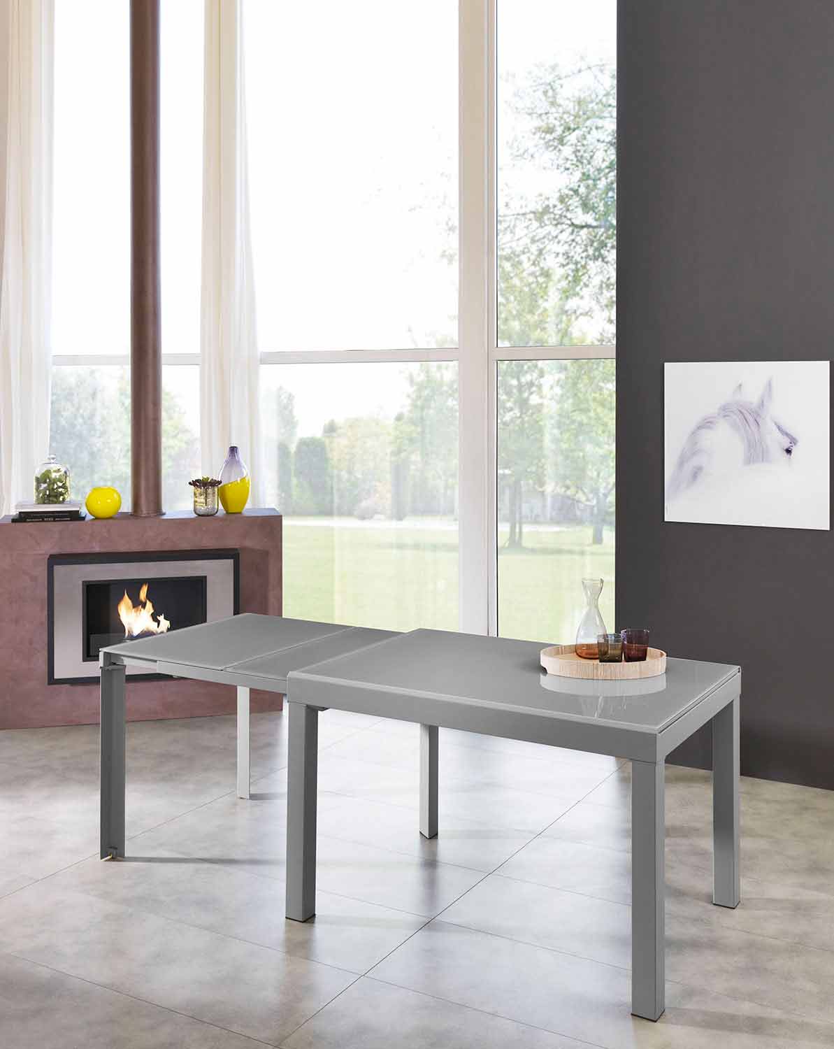 Tabela është bërë me një strukturë metalike të pikturuar gri dhe xham të zbutur dhe pjesën e sipërme të melaminës me të njëjtën ngjyrë, si dhe zgjatimet e brendshme, gjithashtu në xham të butë gri.