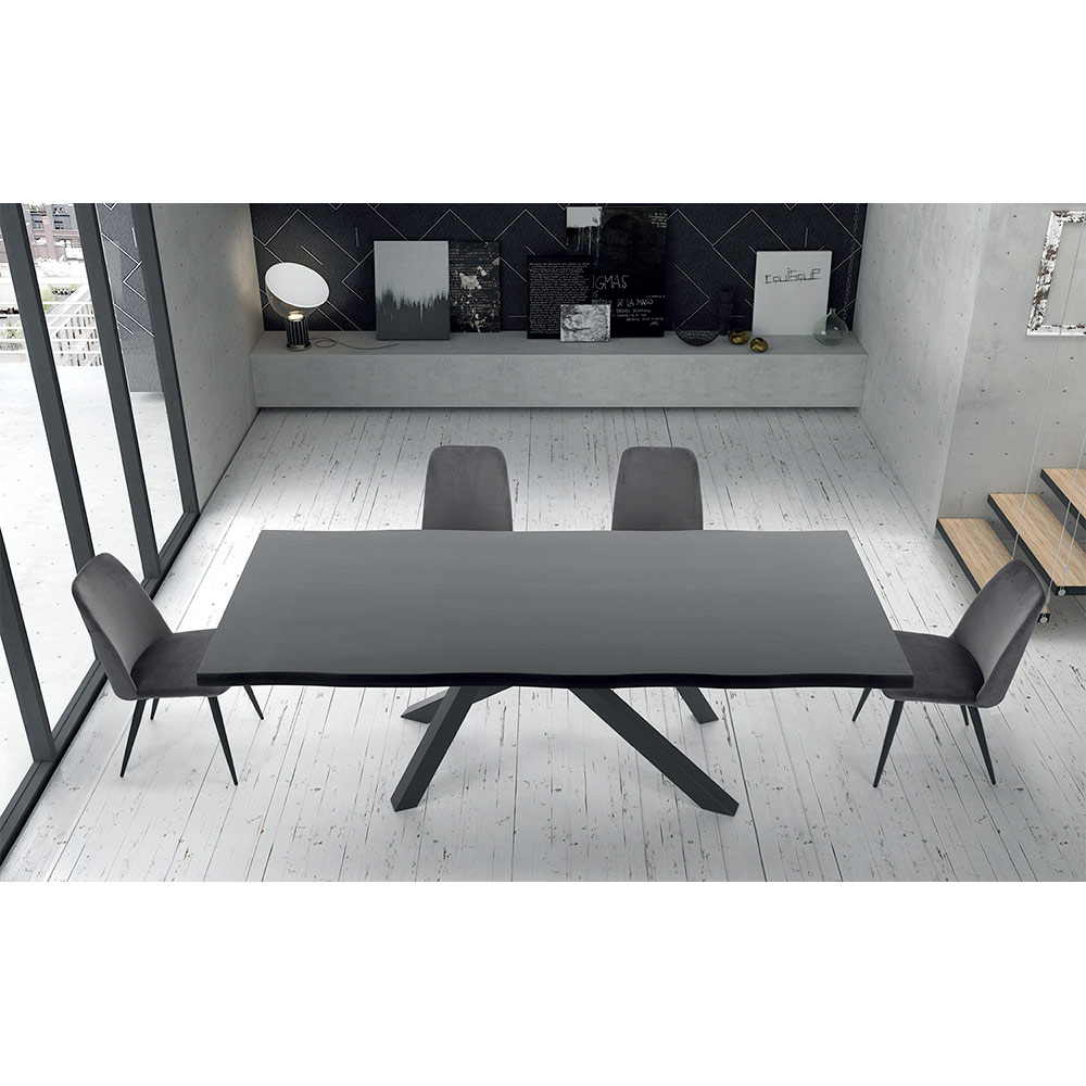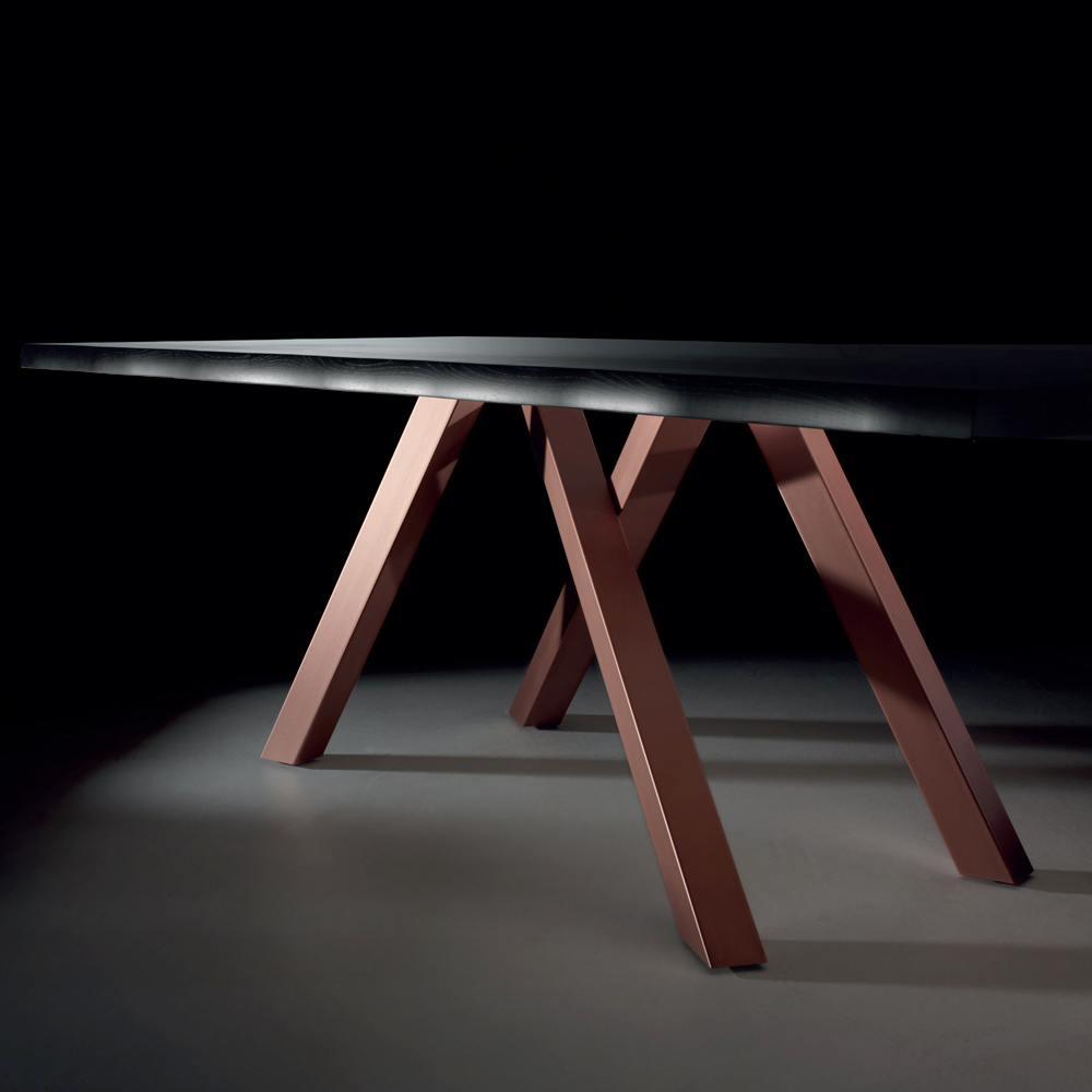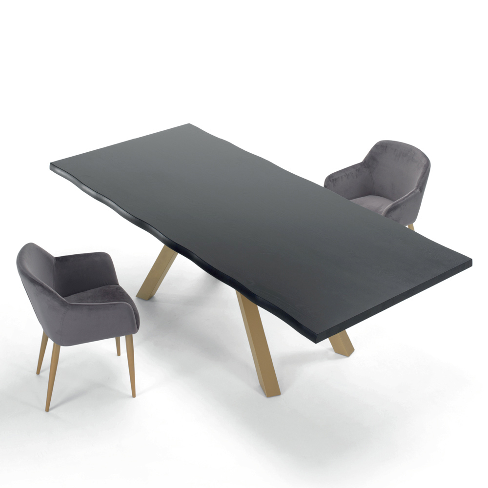 Tavolinë moderne kuzhine me pjesën e sipërme të drurit të rimeso dhe bazën në ar, rozë flori ose çelik grafit të prodhuar në Itali.