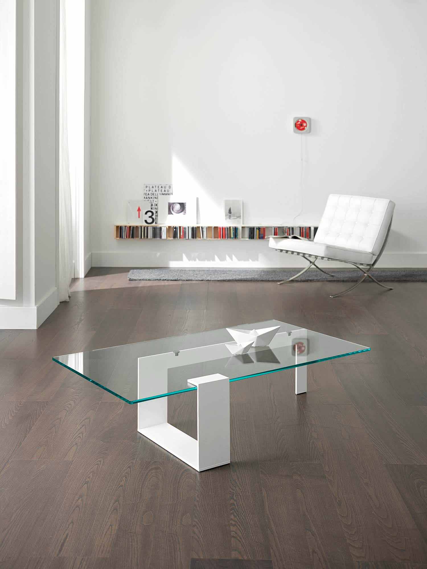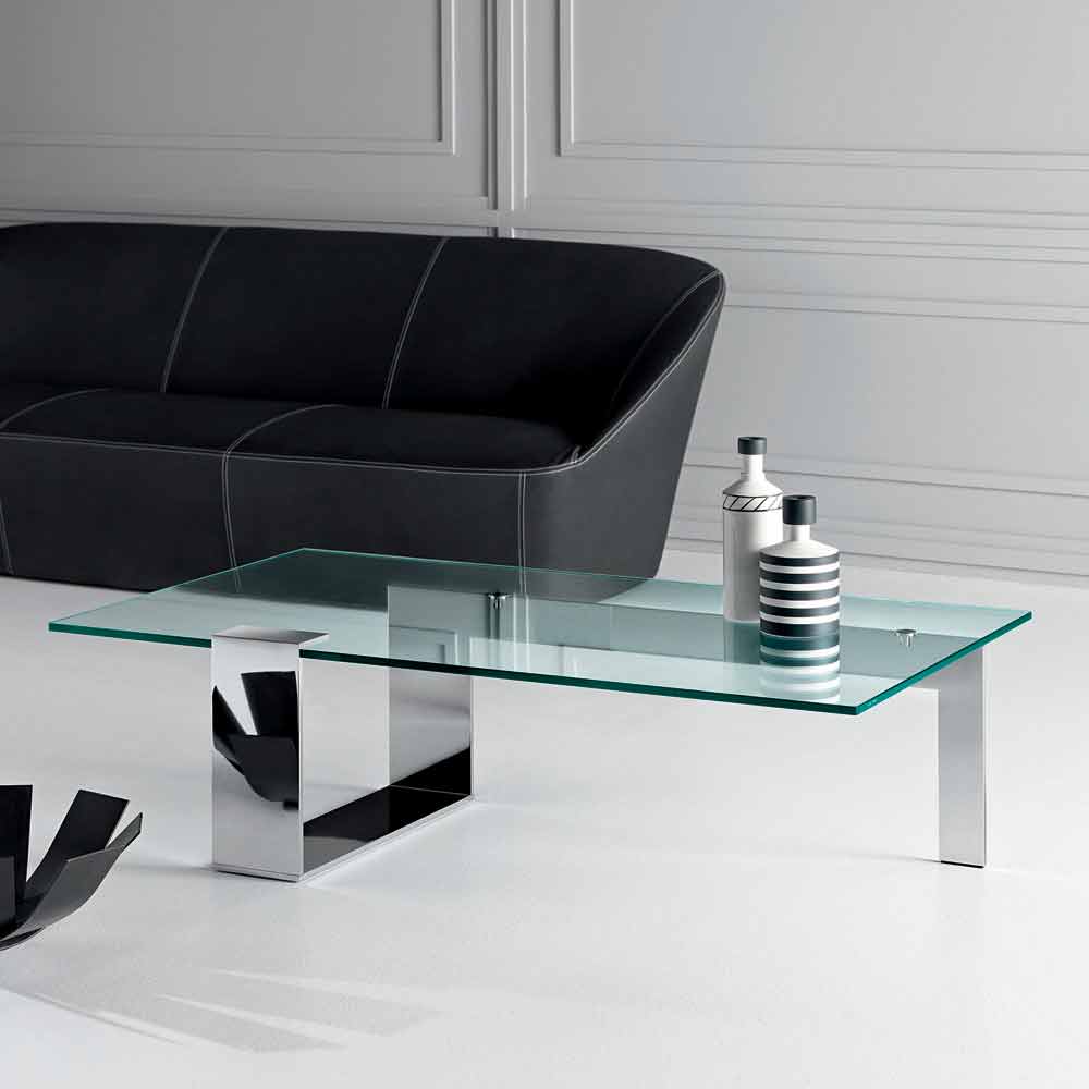 Tavolinë kafeje me dizajn modern të ulët me majë xhami ekstra të pastër dhe bazë metalike, e bërë në Itali.
