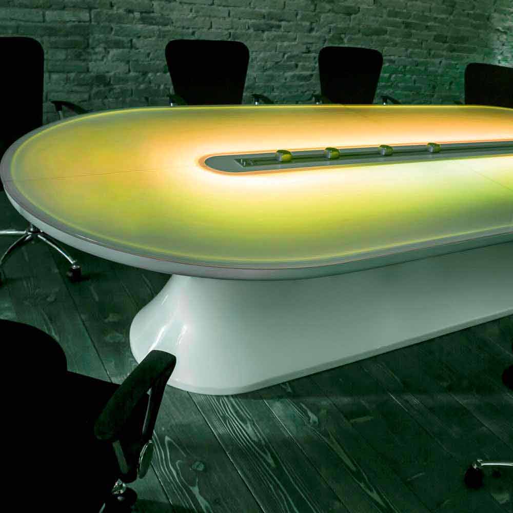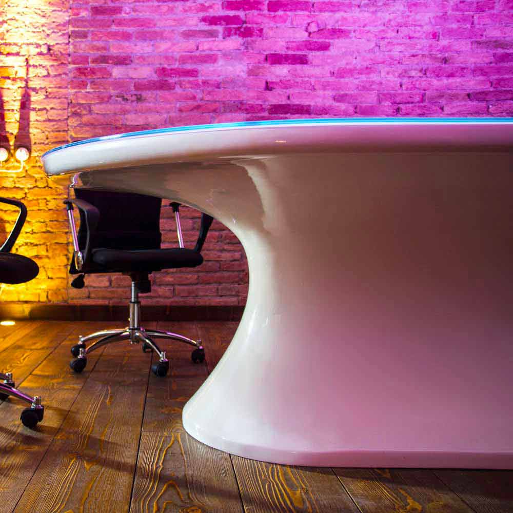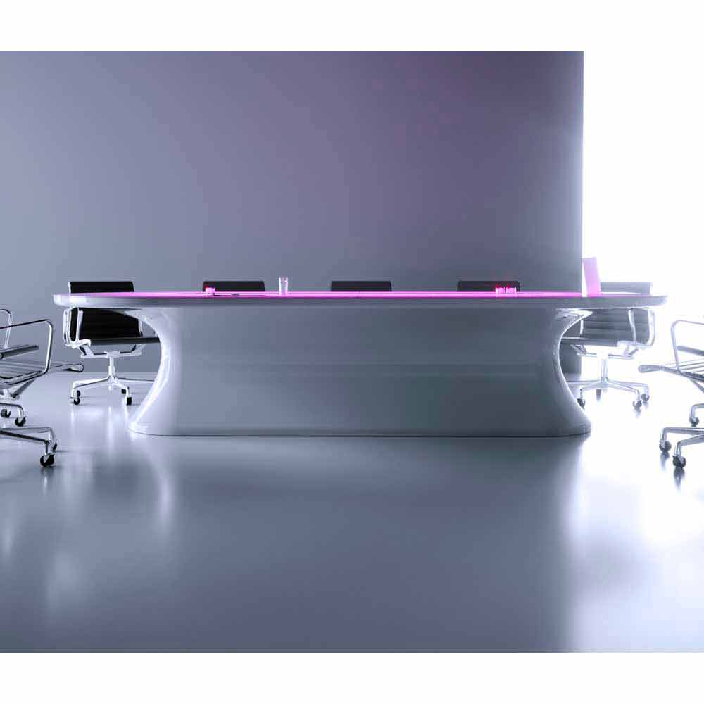 Materiali: adamatx dhe xhami. Tabela e takimit të dizajnit, elegancës dhe teknologjisë. Me forma të përkulura dhe hapësira bujare, tabela e informacionit është një vepër e vërtetë arti. I personalizueshëm në ngjyra dhe madhësi. Përveç aspektit estetik, tabela e informacionit është edhe teknologjikisht e avancuar, falë kromoterapisë së dritave RGB nën xhami, por mbi të gjitha falë shiritit të elektrizuar të vendosur në qendër të tavolinës, duke lejuar çdo lloj lidhjeje nga çdo vend. . Sipërfaqja e ngurtë; është një material inovativ me të cilin mund të krijohet çdo formë, të krijohen objekte dhe projekte me një dizajn unik. Është një material i përbërë, i përftuar nga përpunimi i shkumave të veshura me rrëshira speciale, i cili po revolucionarizon botën e dizajnit. Një material që vjen nga vite të tëra studimi, eksperimentesh dhe testesh laboratorike teknike. PËRPARËSITË : - Lahet lehtë - Rezistencë shumë e lartë ndaj konsumit - Pamja monolitike - I gjithanshëm: çdo formë mund të bëhet - Pesha e lehtë: është një material i përbërë, me një lehtësi unike, prandaj lehtë e transportueshme - Rezistente - I ngurtë : është aq i performueshëm dhe i adaptueshëm për nevoja të ndryshme saqë mund të krijojë sipërfaqe të forta e ndryshueshme, deri në antiplumb - Uniformiteti : nuk ka asnjë lloj nyjeje të dukshme